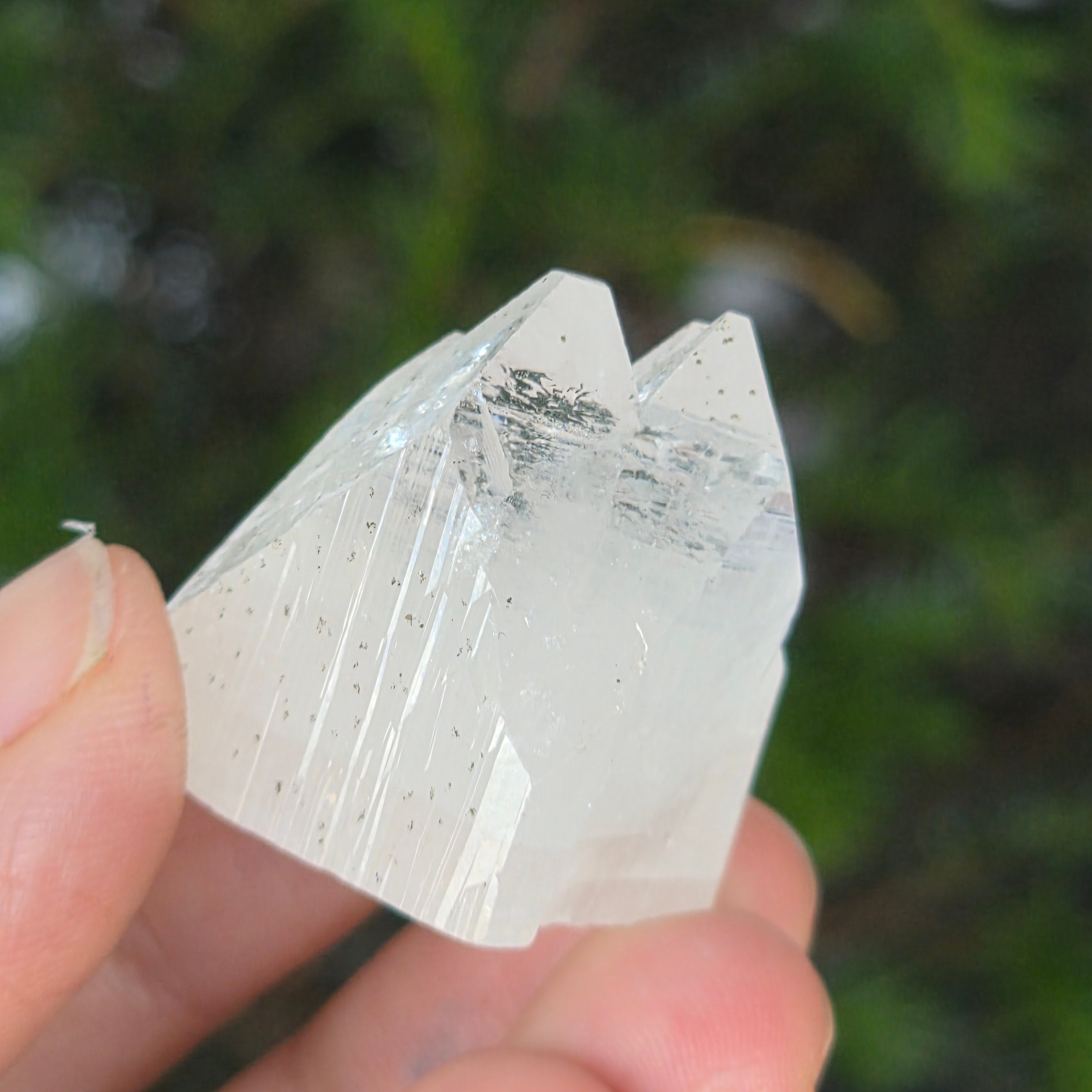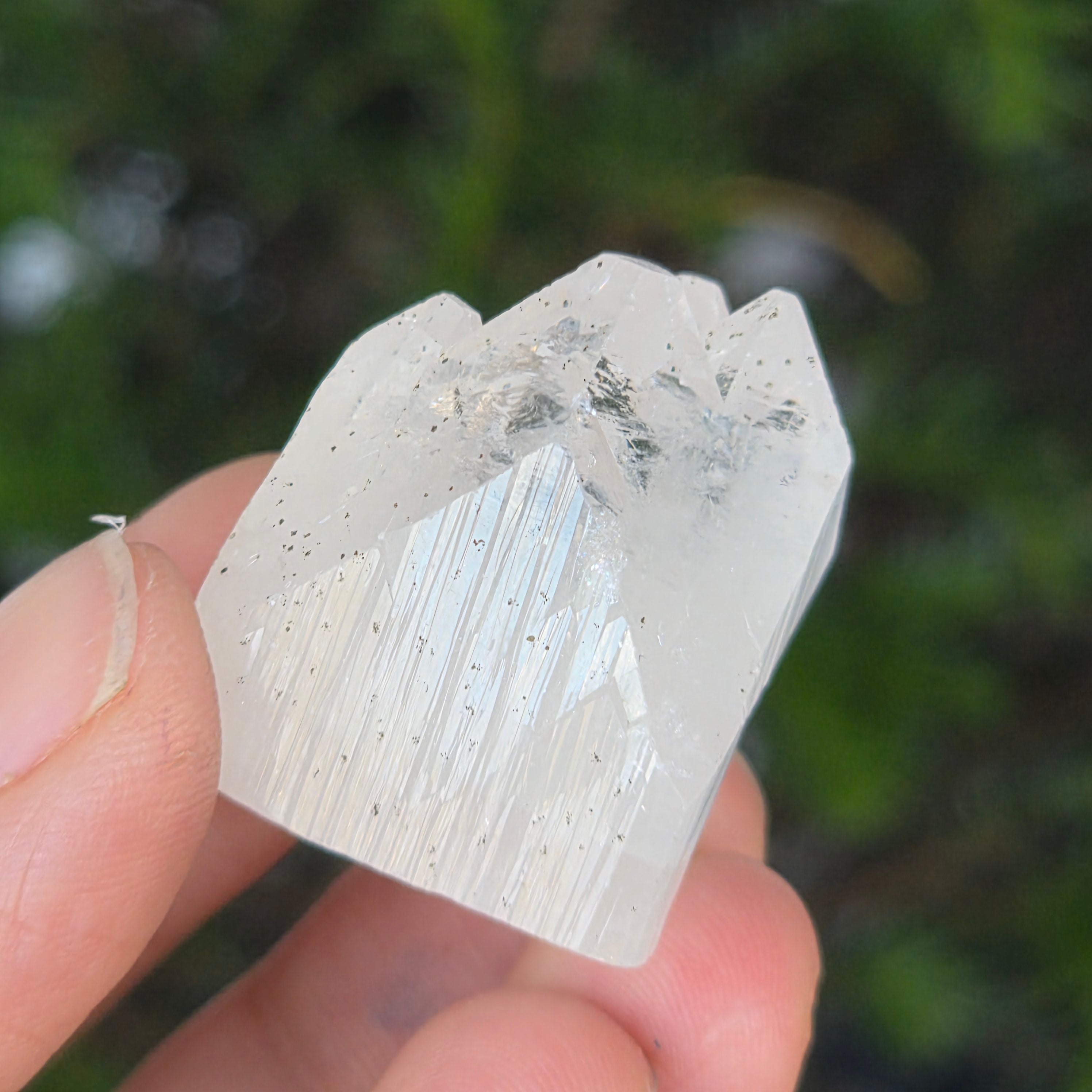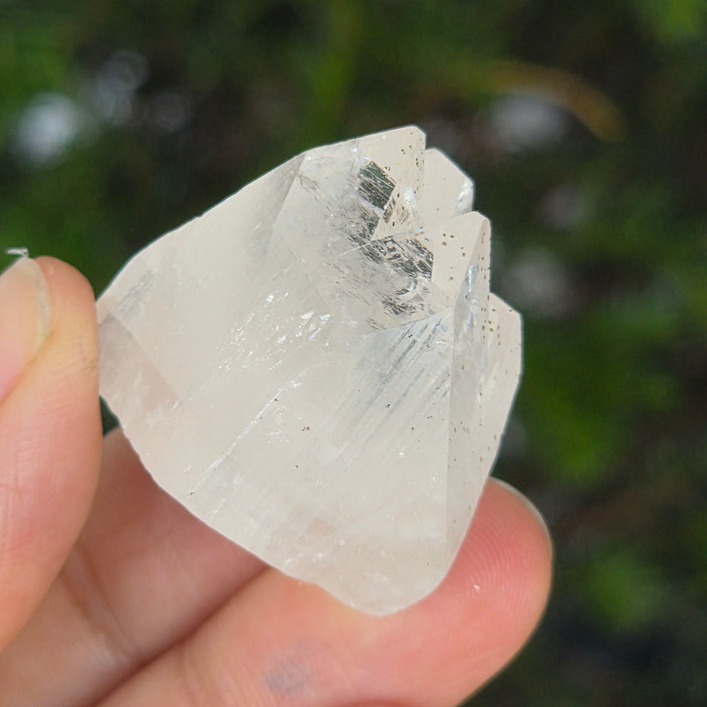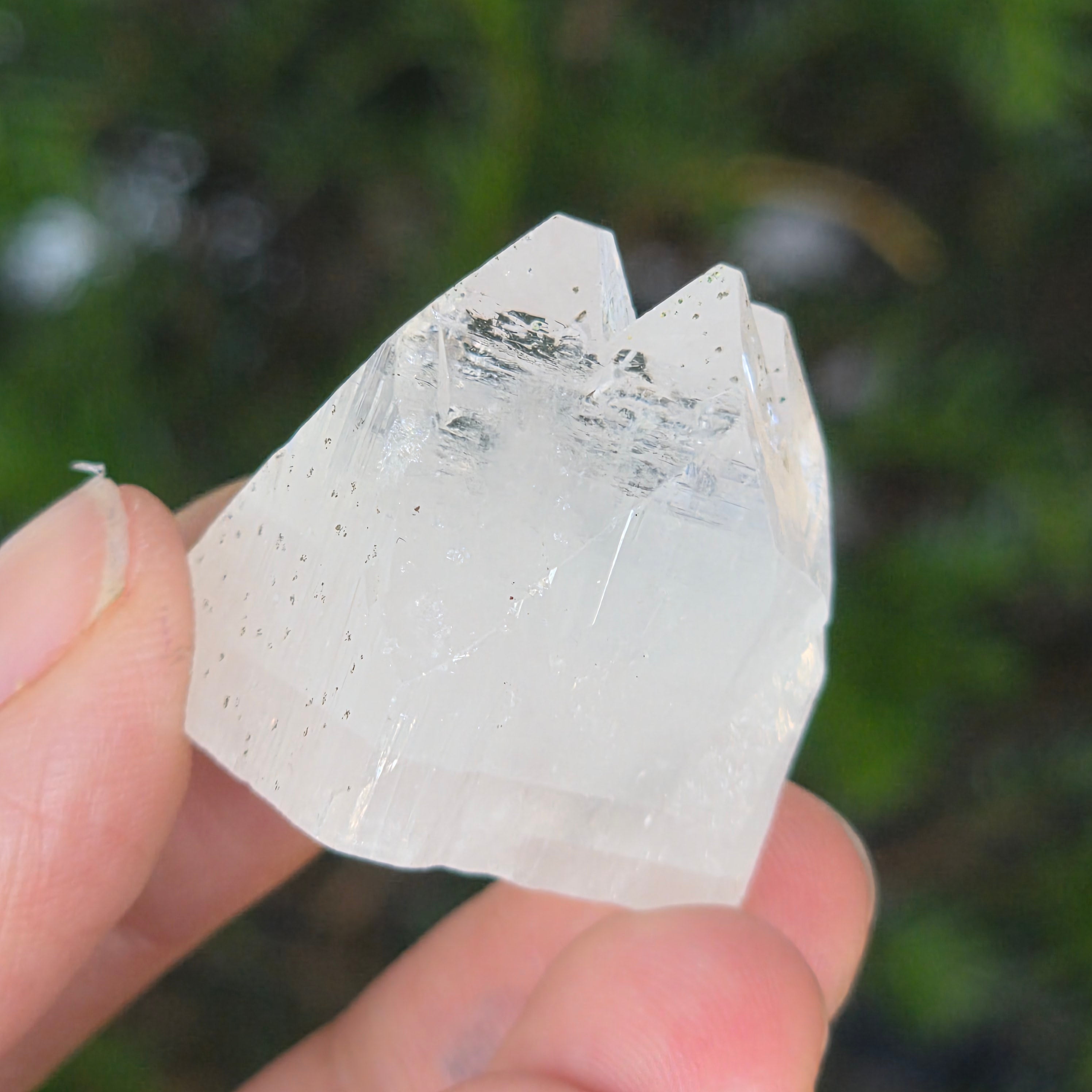 Apophyllite is a mineral of the tectosilicate family, with a main chemical composition of potassium silicate and hydrated calcium. Due to its water content, apophyllite can exhibit remarkable clarity and transparency, and sometimes its surfaces reflect light exceptionally, creating an effect close to mirror.