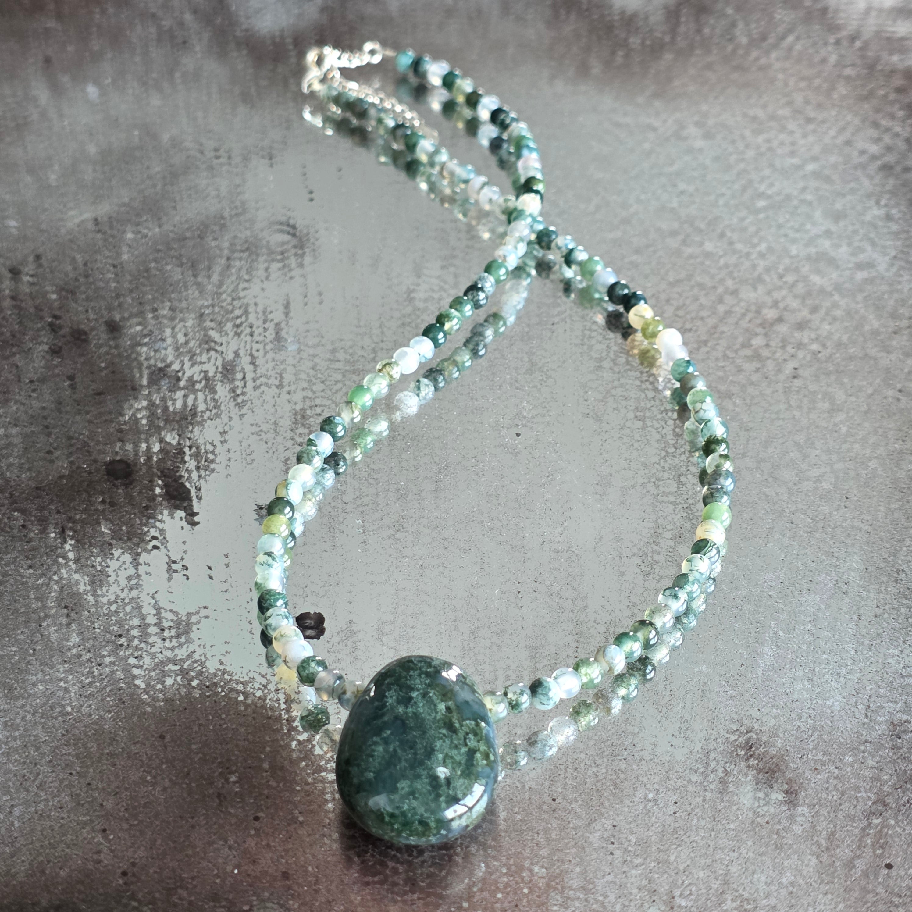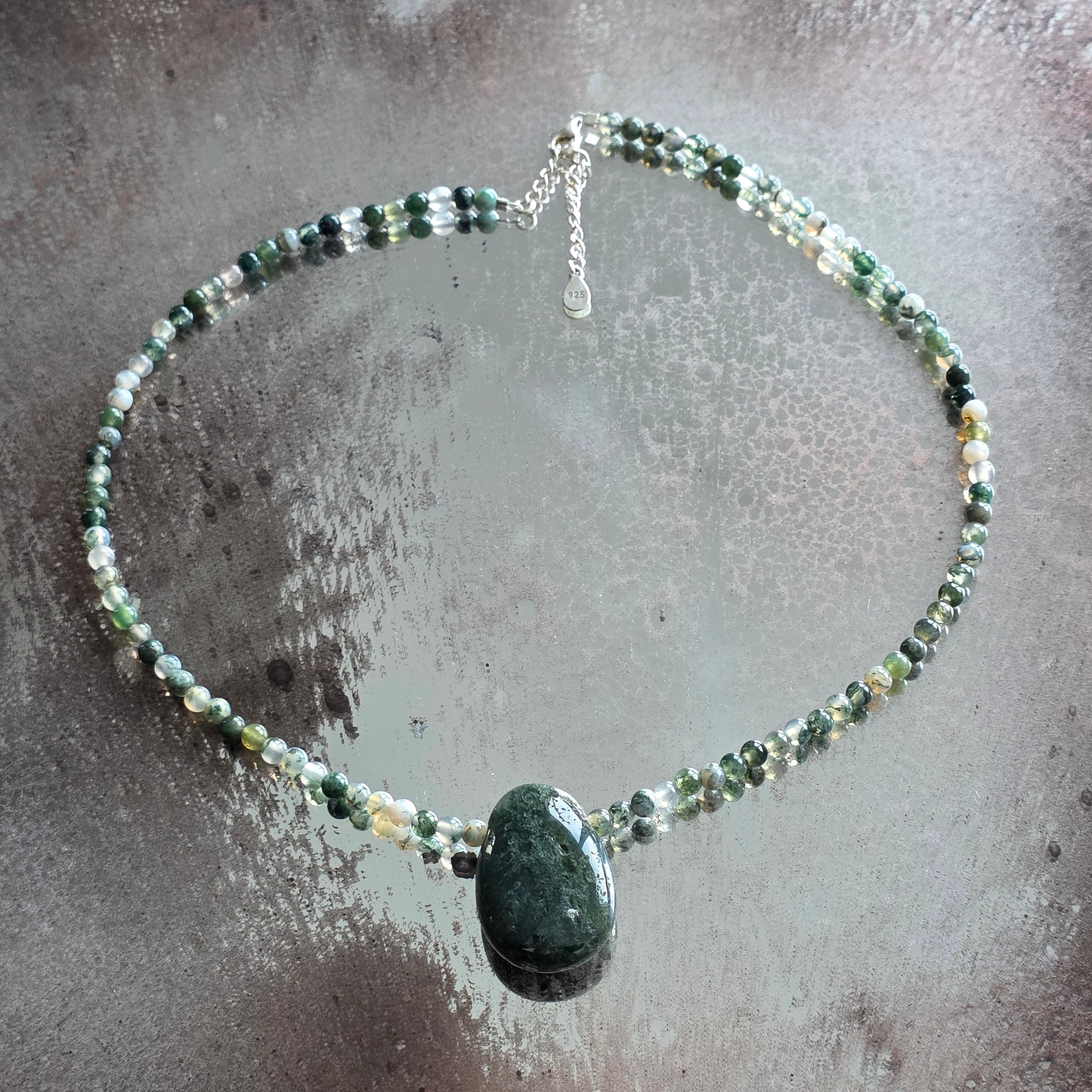 At the center of the composition, a drop pendant of about 3 cm made from the same moss agate adds symbolic weight and natural elegance. It is a condensed drop of forest – a fragment of a silent but powerful world.