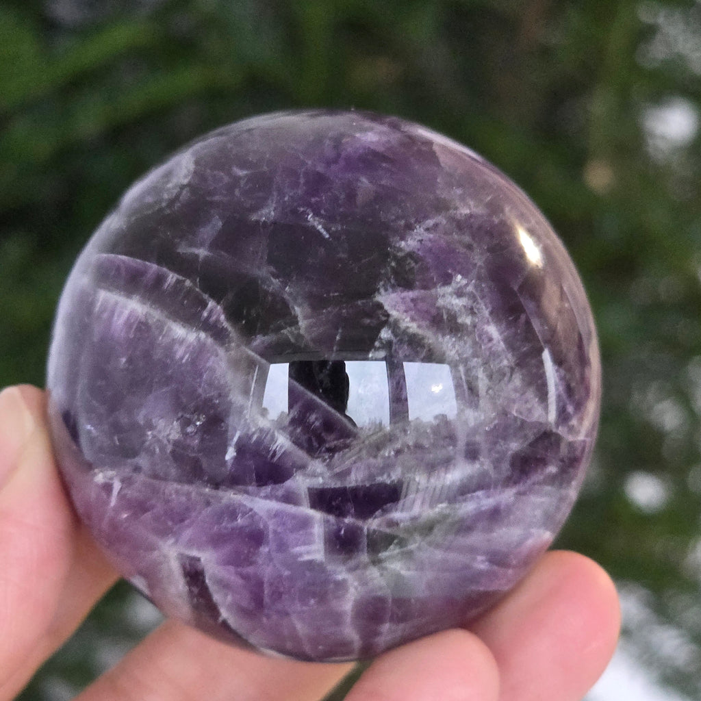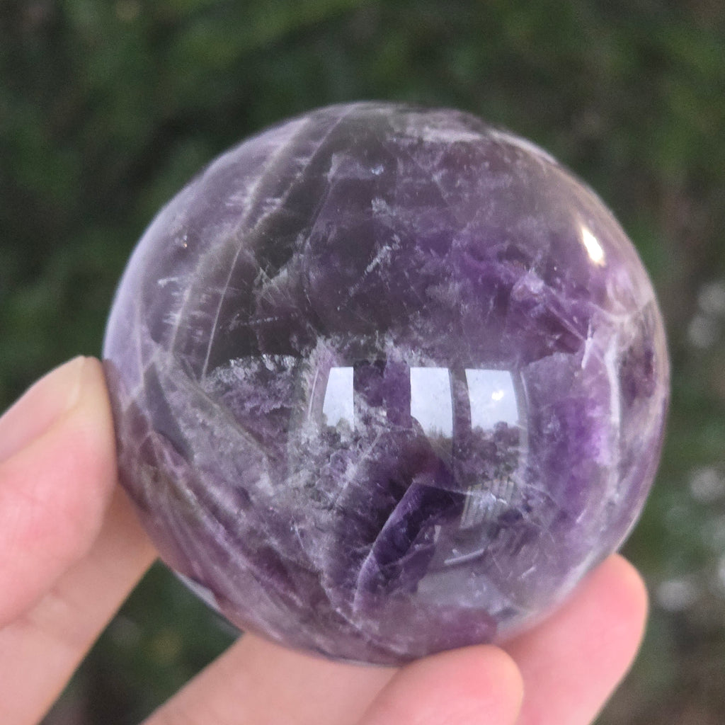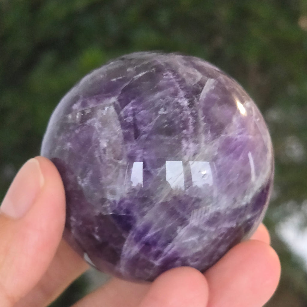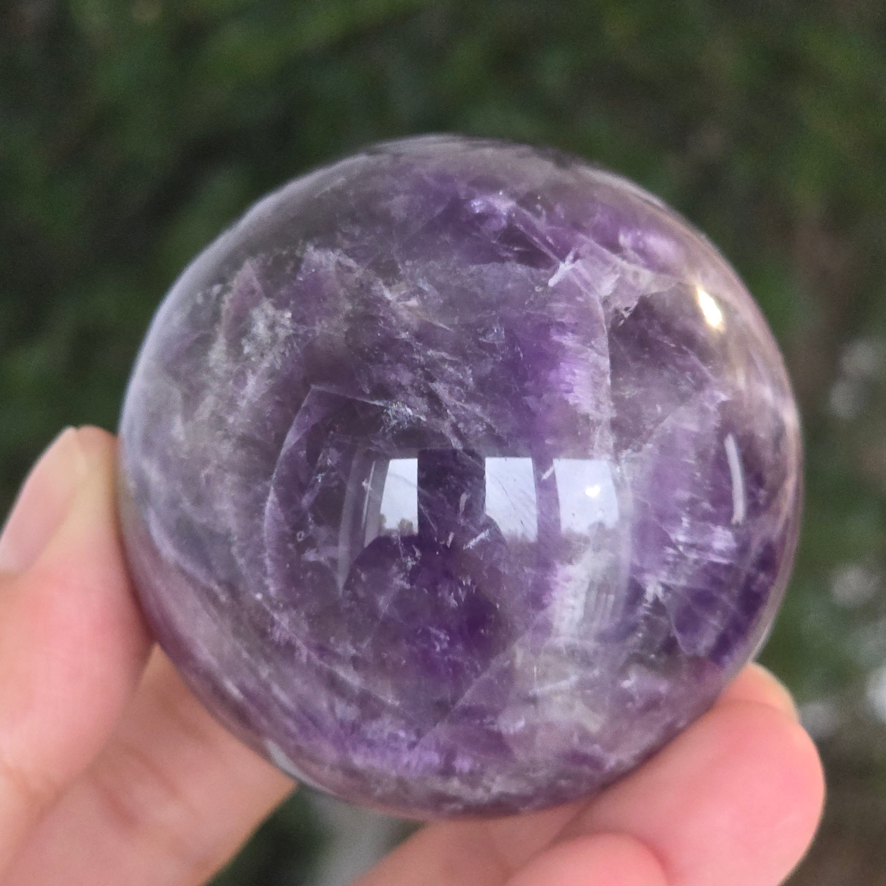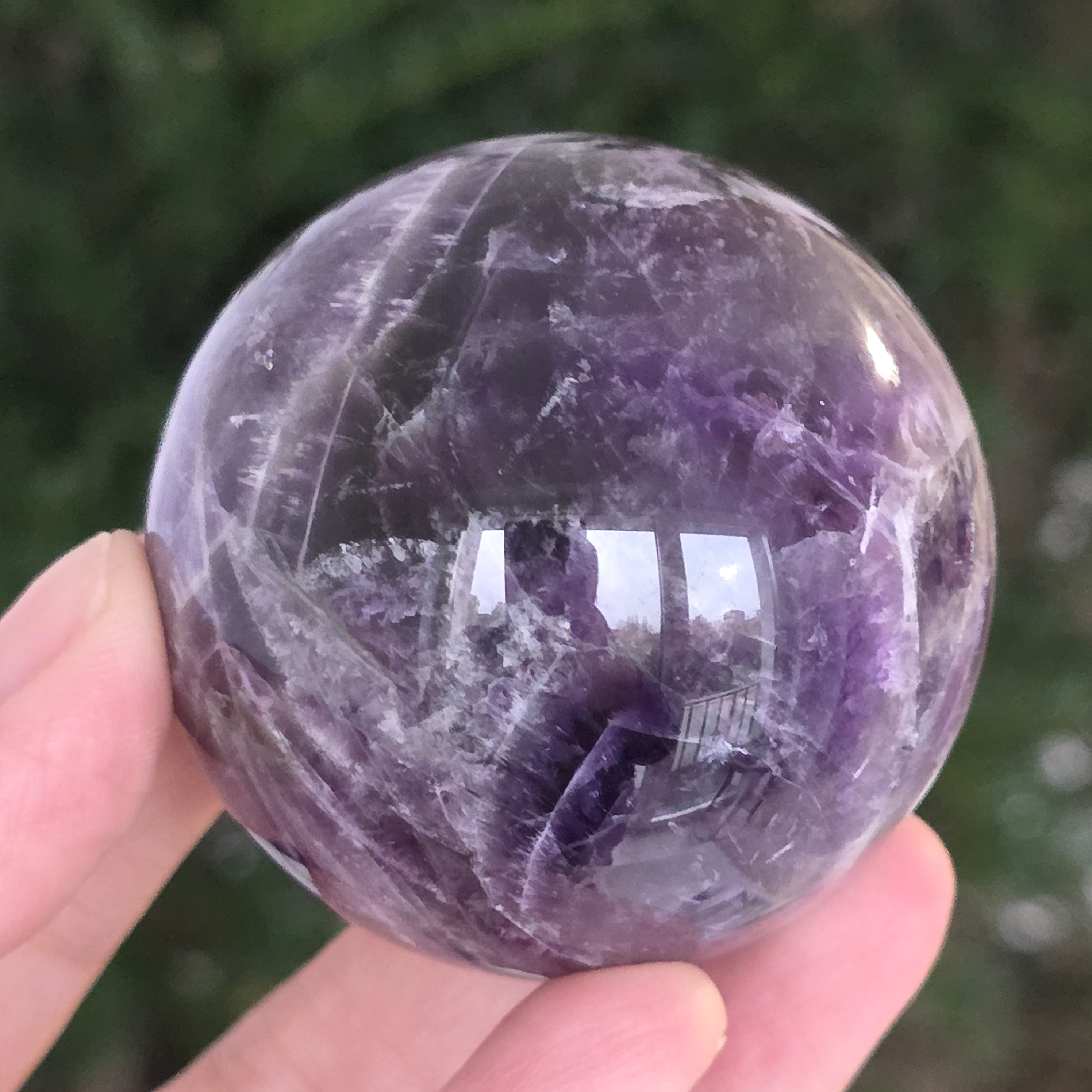 A sphere that seems to concentrate the light of a lilac night inside. This one unique piece of natural chevron amethyst, reveals stunning layers of purple, white and lavender, arranged in V-shapes – the hallmark of this rare variety of amethyst. The perfectly polished surface, velvety to the touch, reflects the light with a hypnotic finesse, bringing tranquility and sophistication to any space.