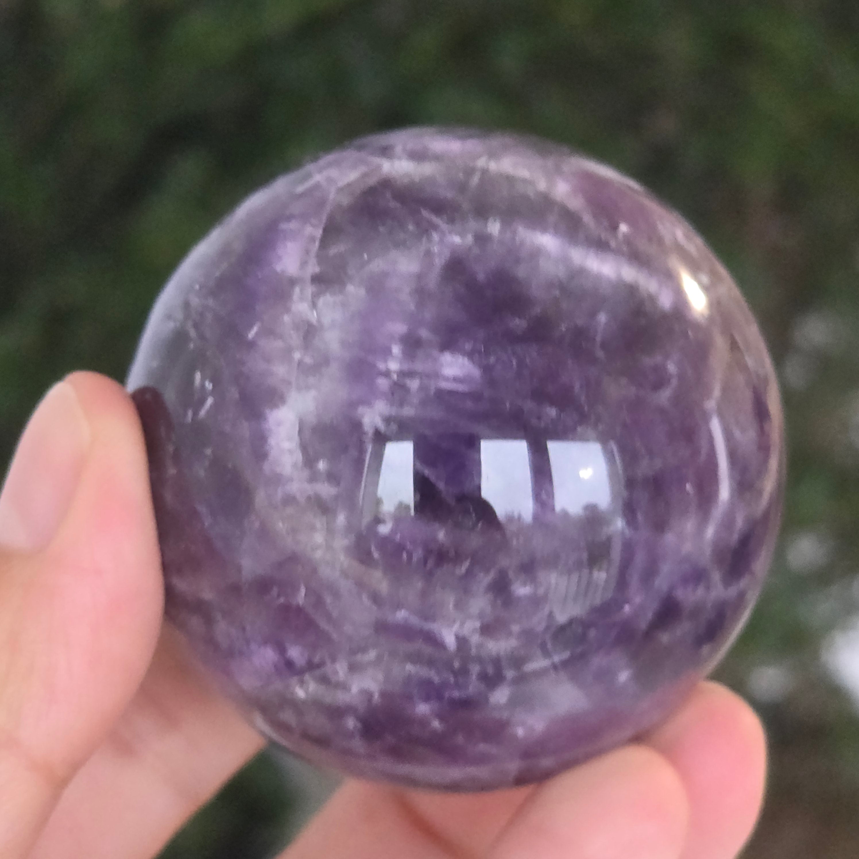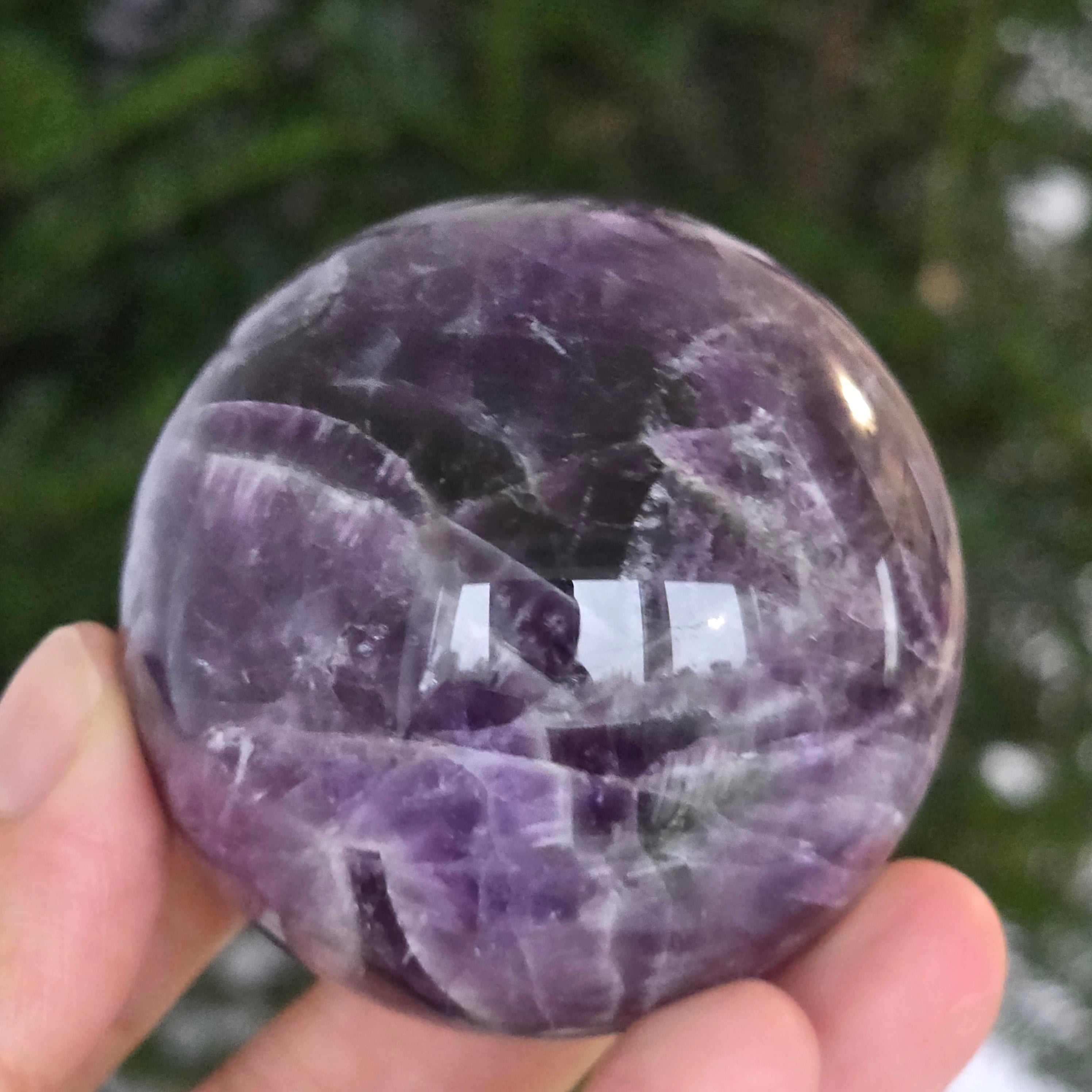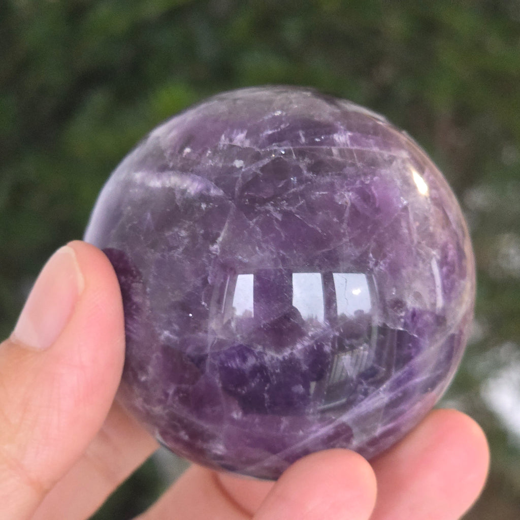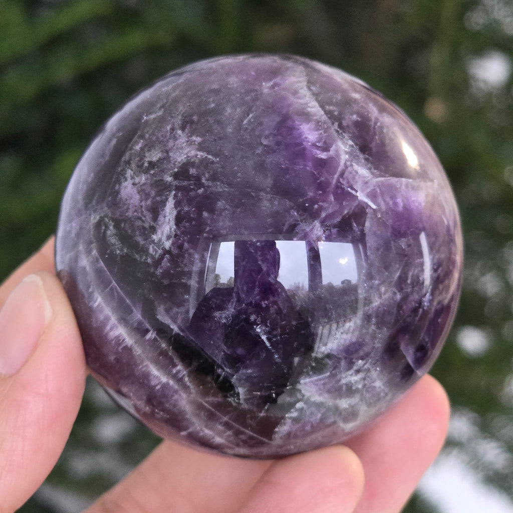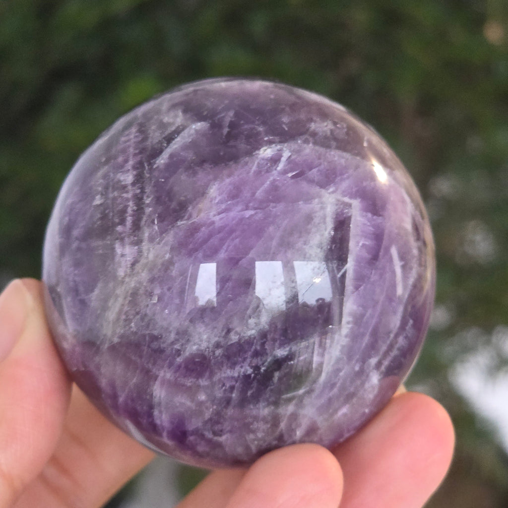 A sphere that seems to concentrate the light of a lilac night inside. This one unique piece of natural chevron amethyst, reveals stunning layers of purple, white and lavender, arranged in V-shapes – the hallmark of this rare variety of amethyst. The perfectly polished surface, velvety to the touch, reflects the light with a hypnotic finesse, bringing tranquility and sophistication to any space.