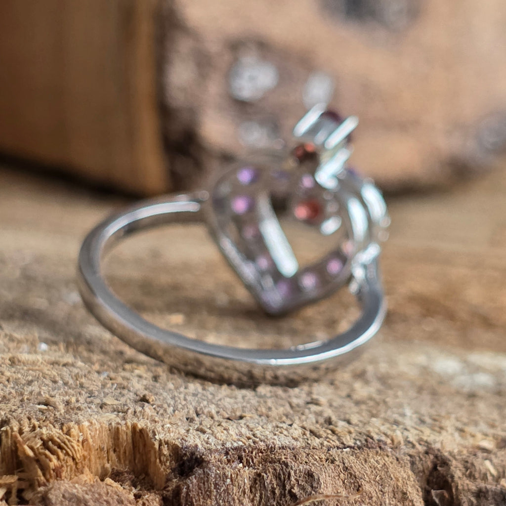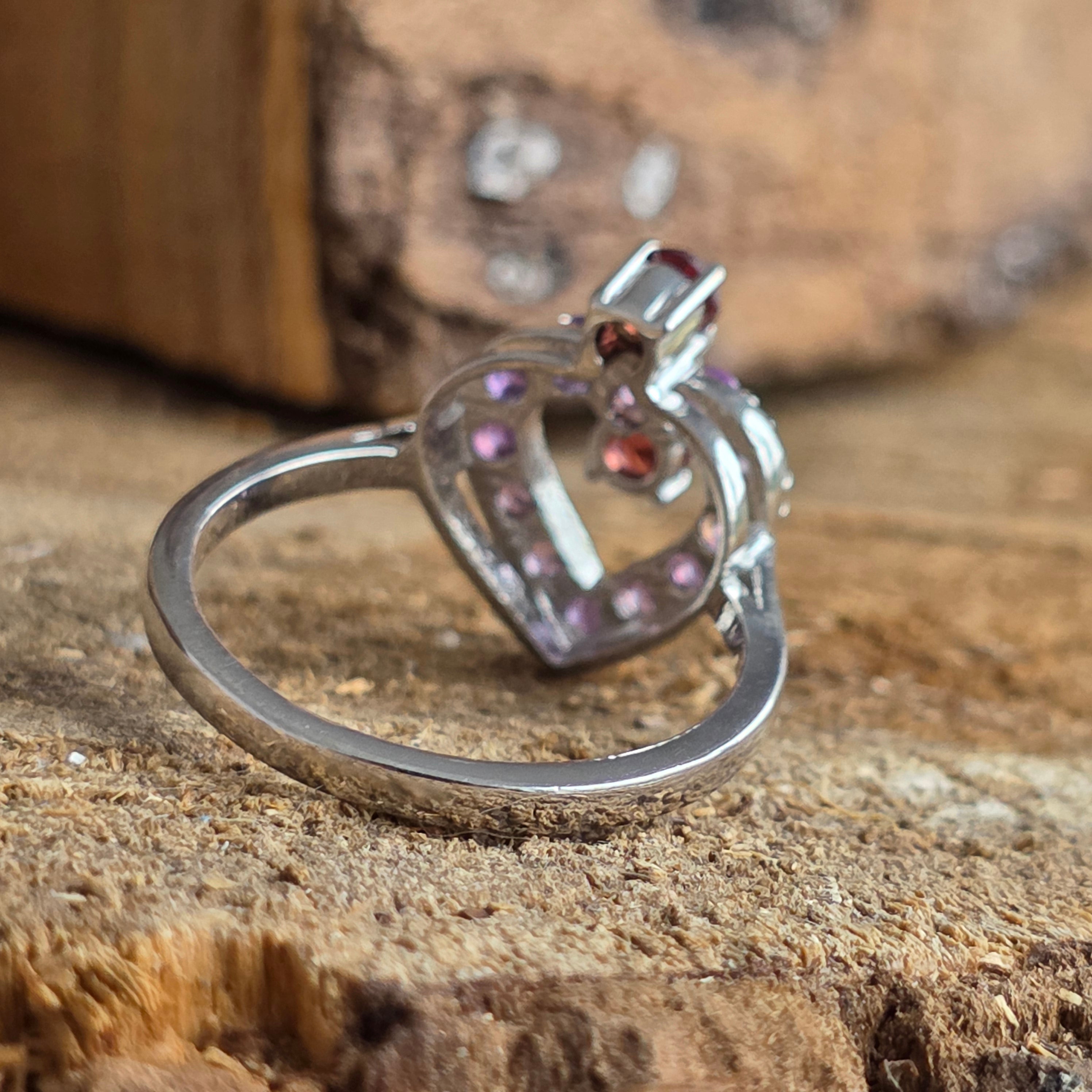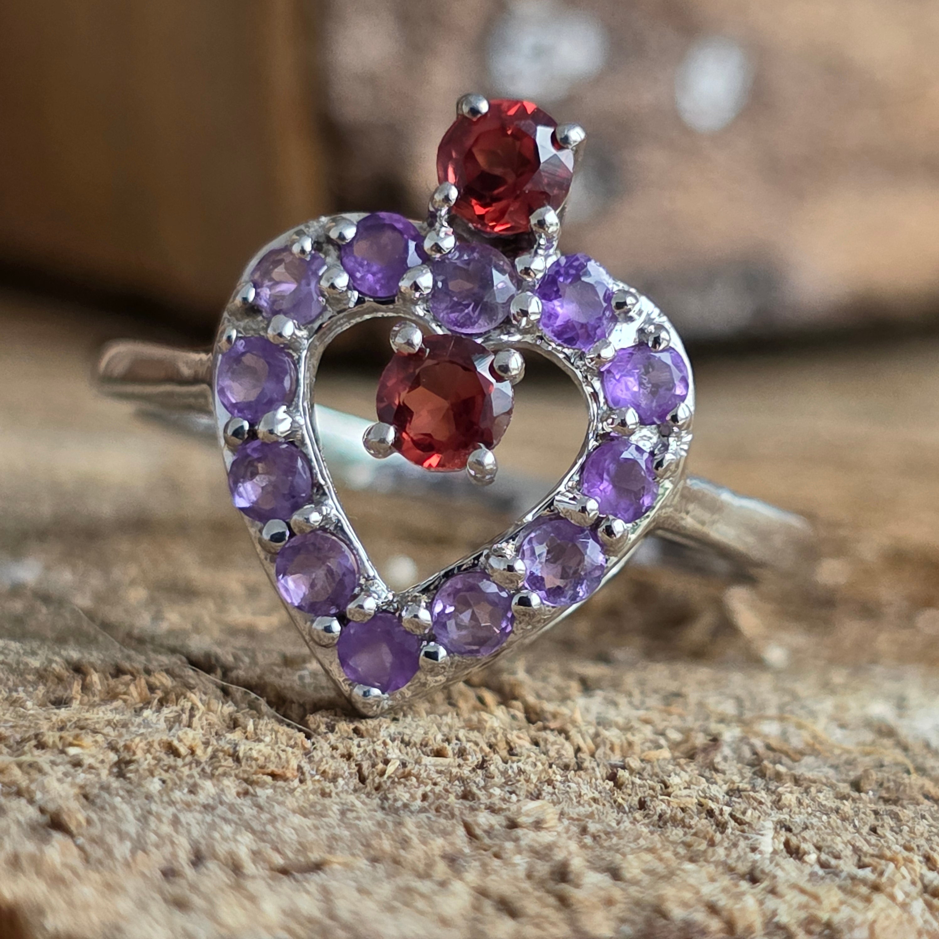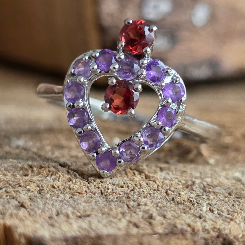A ring that speaks of love, balance and living energy. Amethyst brings clarity and peace, and The garnet it ignites passion and courage – together they create a perfect harmony between heart and mind.