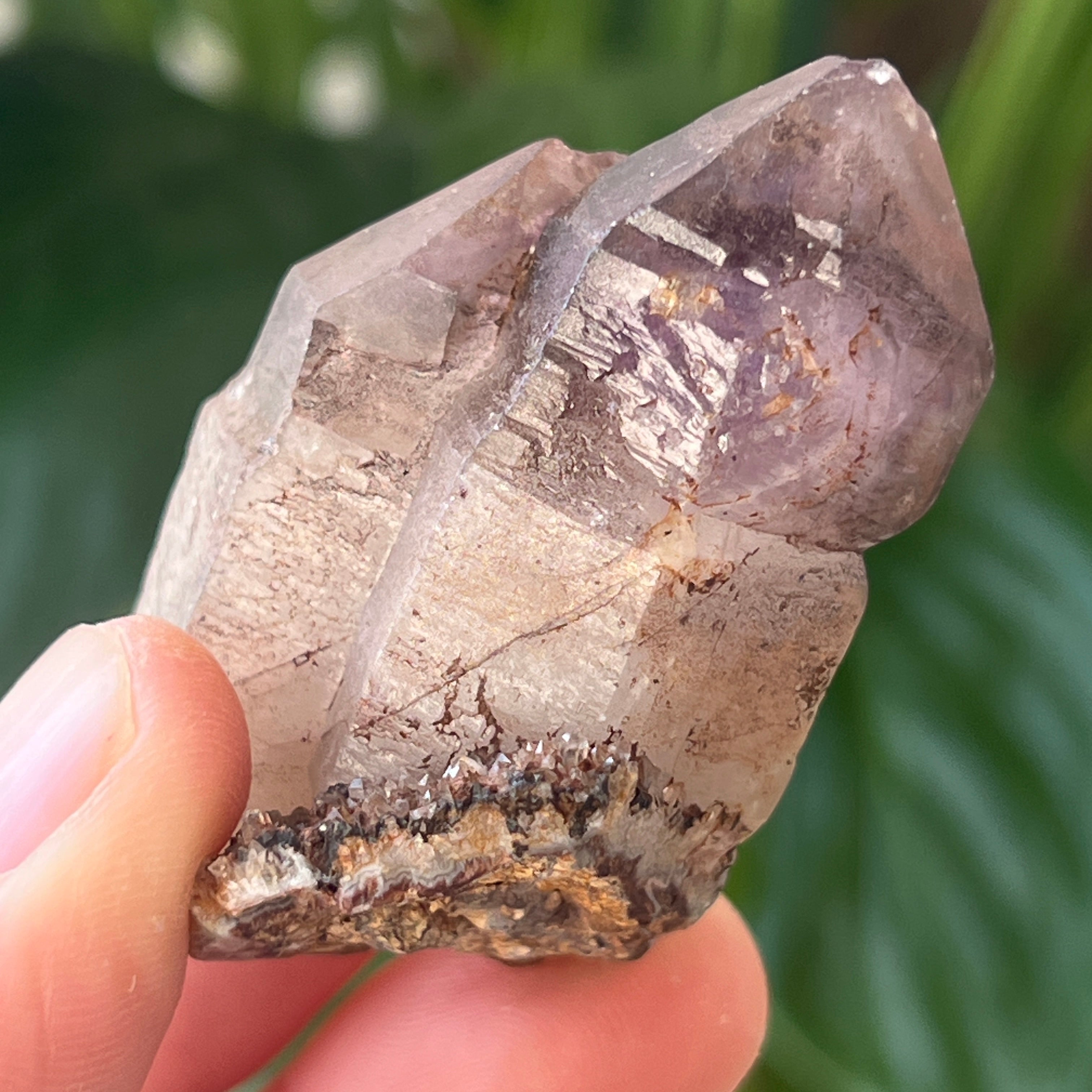 Născut în inima masivului Brandberg din vestul Namibiei, acest ametist unic provine dintr-una dintre cele mai remarcabile zone geologice ale Africii. Munții Brandberg, un corp plutonic format în urmă cu peste 130 de milioane de ani, ascund geode rare unde cristalele de cuarț au crescut în condiții hidrotermale excepționale. Rezultatul este un ametist de o frumusețe rară, ce îmbină nuanțe intense de violet cu zone de cuarț clar sau fumuriu, totul într-un singur cristal.