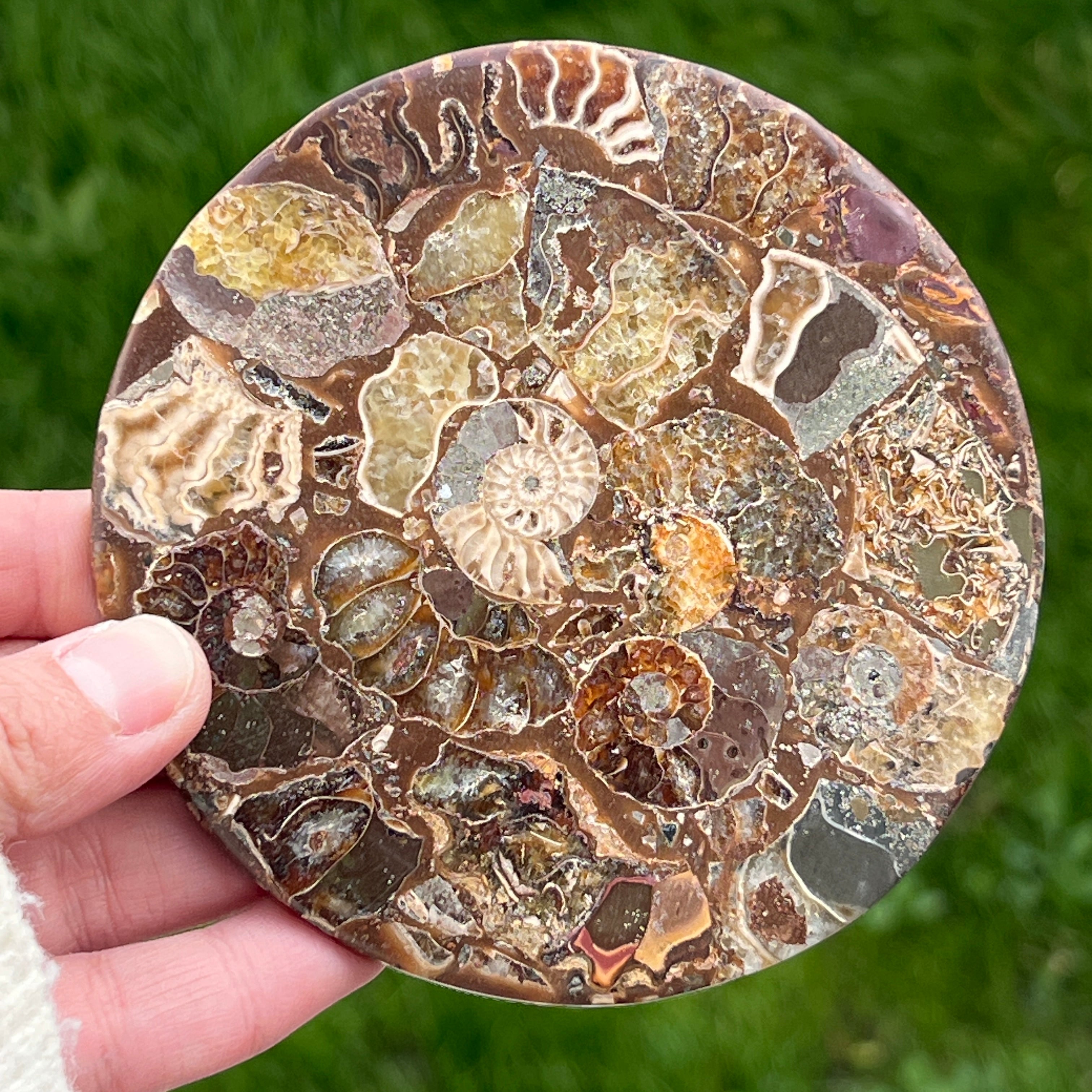Fossil ammonite crystals are made from genuine ammonite fossils. These fossils can have different sizes and ornaments, depending on the species and the geological period in which they lived.