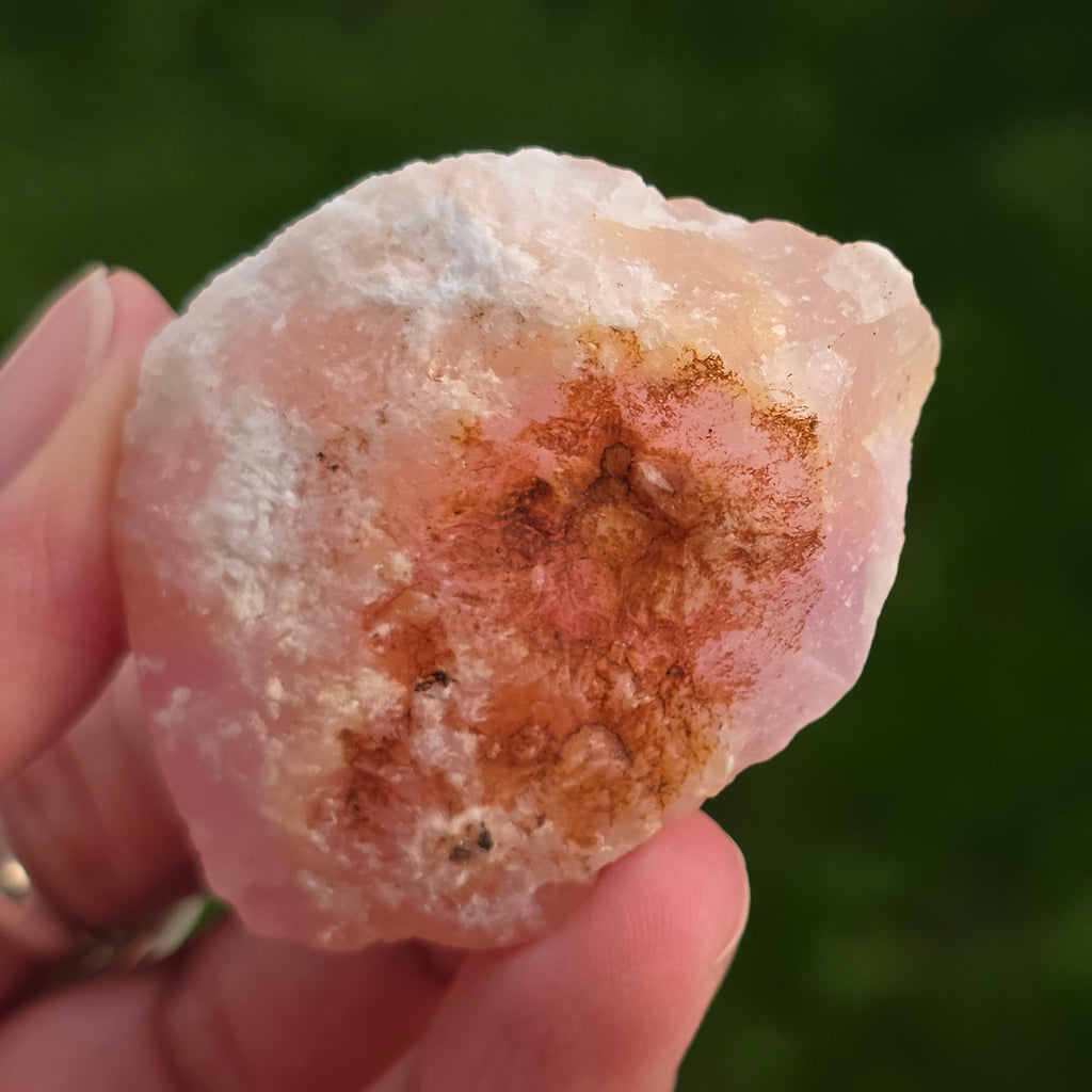Pink aragonite is a rare semi-precious stone. It is made of calcium carbonate and has a pink-orange color due to iron impurities.