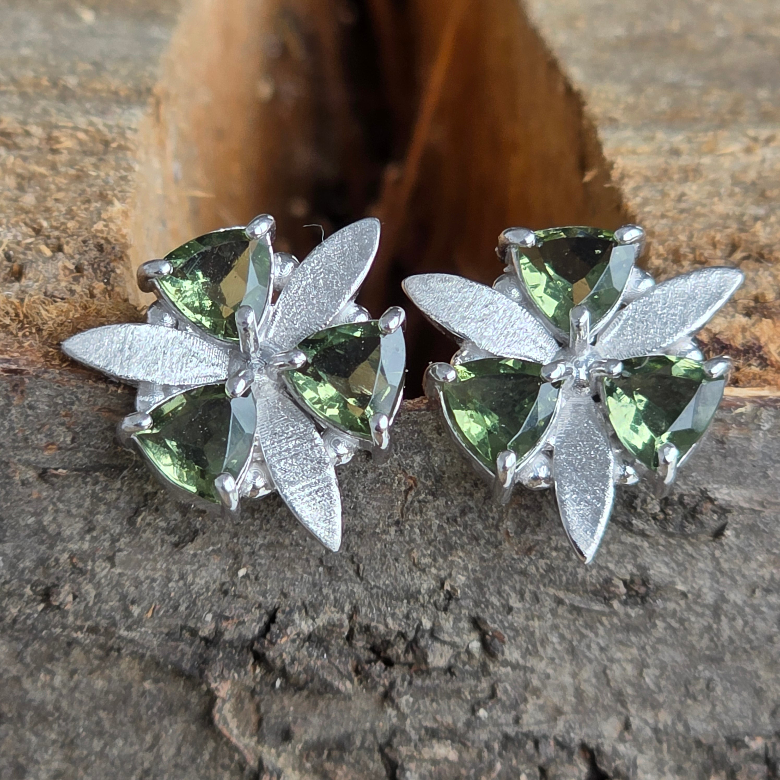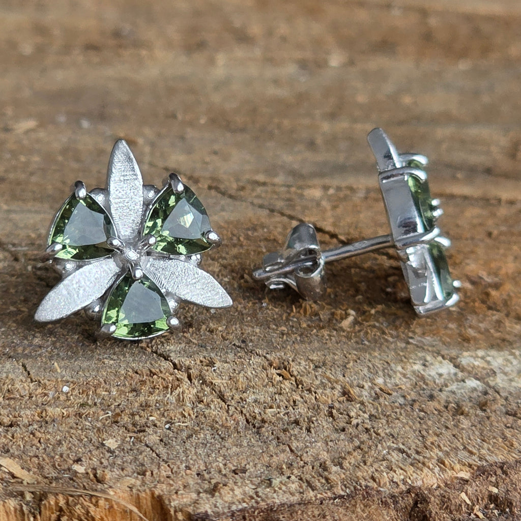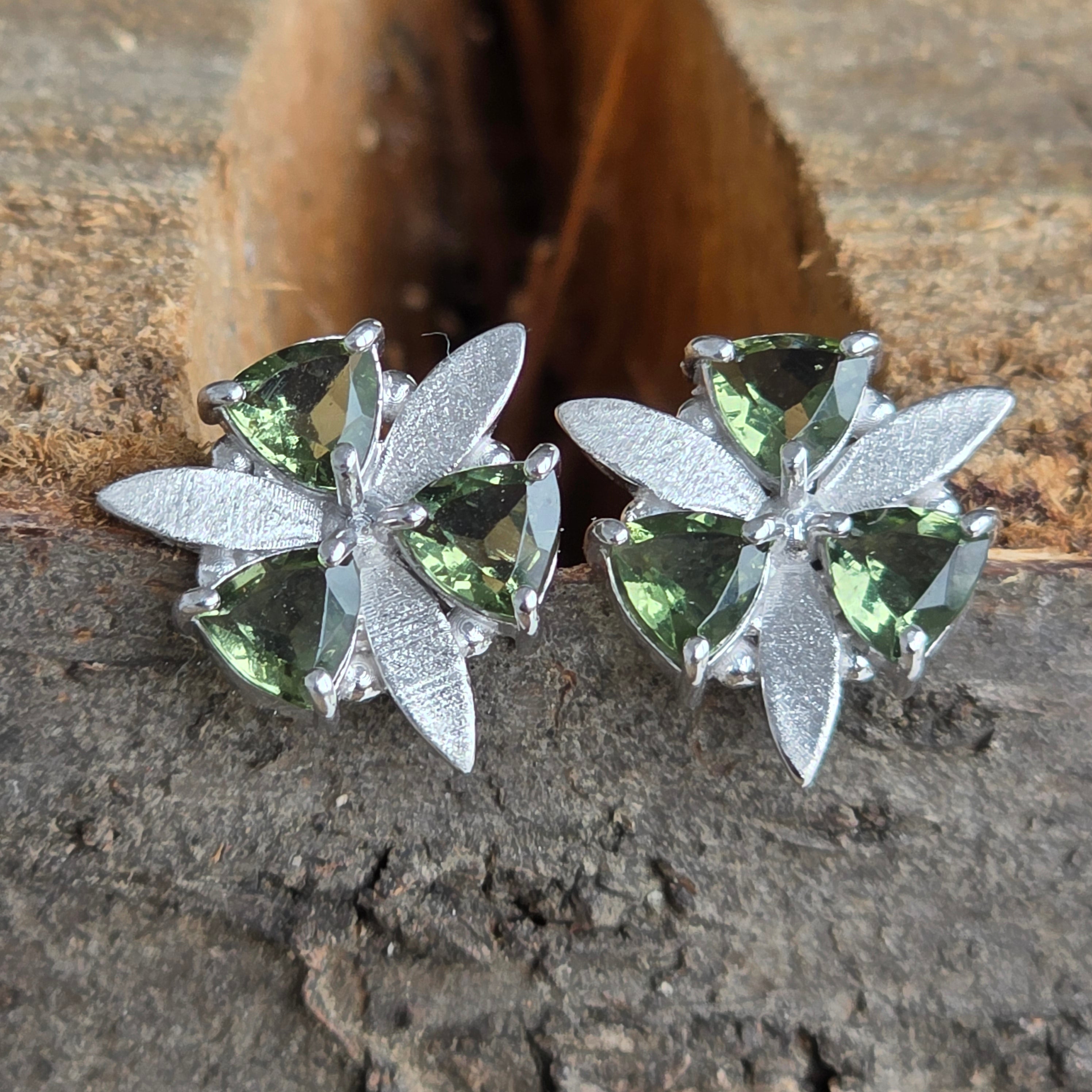 These elegant 925 silver earrings bring the natural beauty of Moldavit to a floral inspiration. Each earring is made up of three faceted Moldovit stones, arranged harmoniously like the petals of a rare flower, which combines the delicacy of the design with the unique stone vibration.