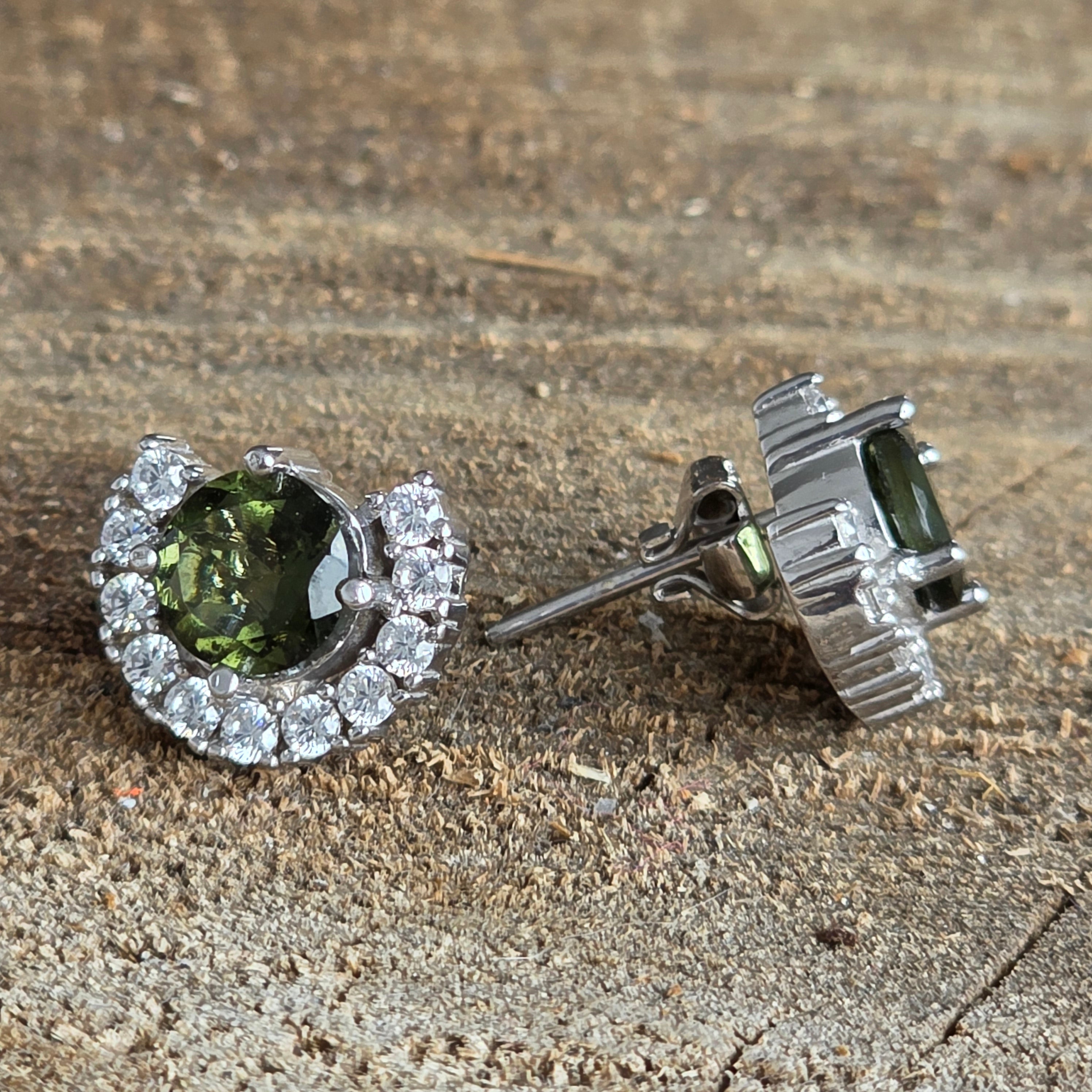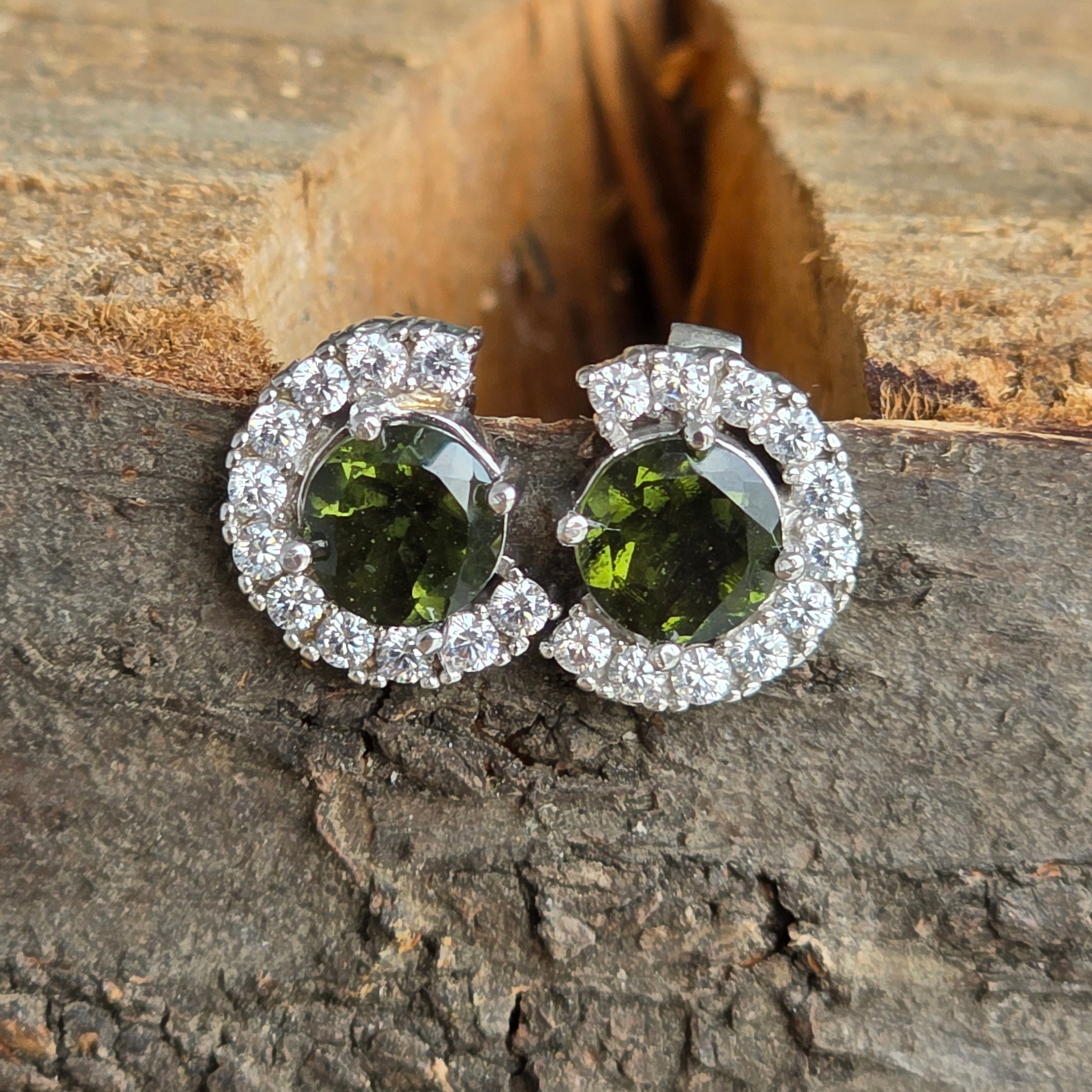 These refined silver earrings 925 highlight the rare beauty of the natural Moldavit, centrally mounted and surrounded by a crown of shining zircons in style halo. The elegant design highlights the intense green hue of Moldavit, bringing extra brightness and elegance. They are suitable for both day and special occasions, being an excellent choice for lovers of rare stone and timeless jewelry.