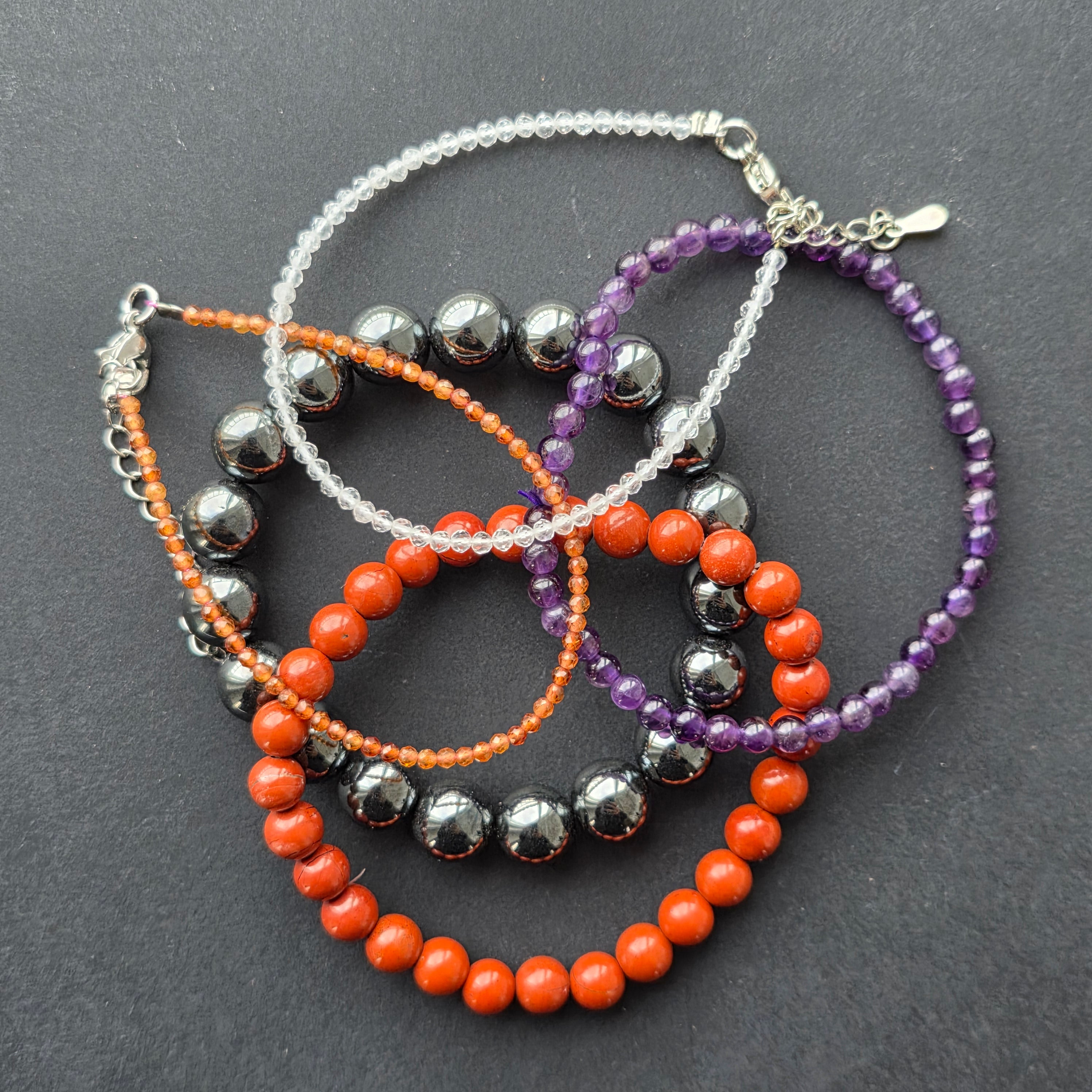Amethyst at 4 mm offers calm, intuition, and balance, tempering impulses and creating space for clarity.