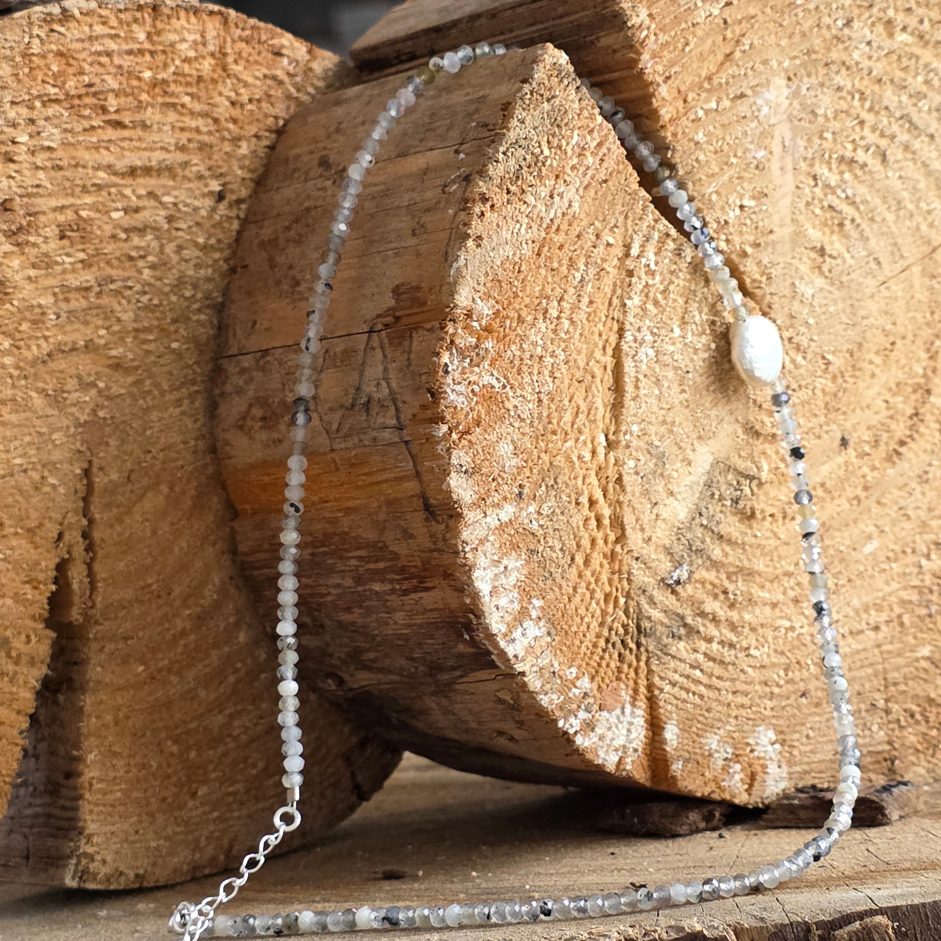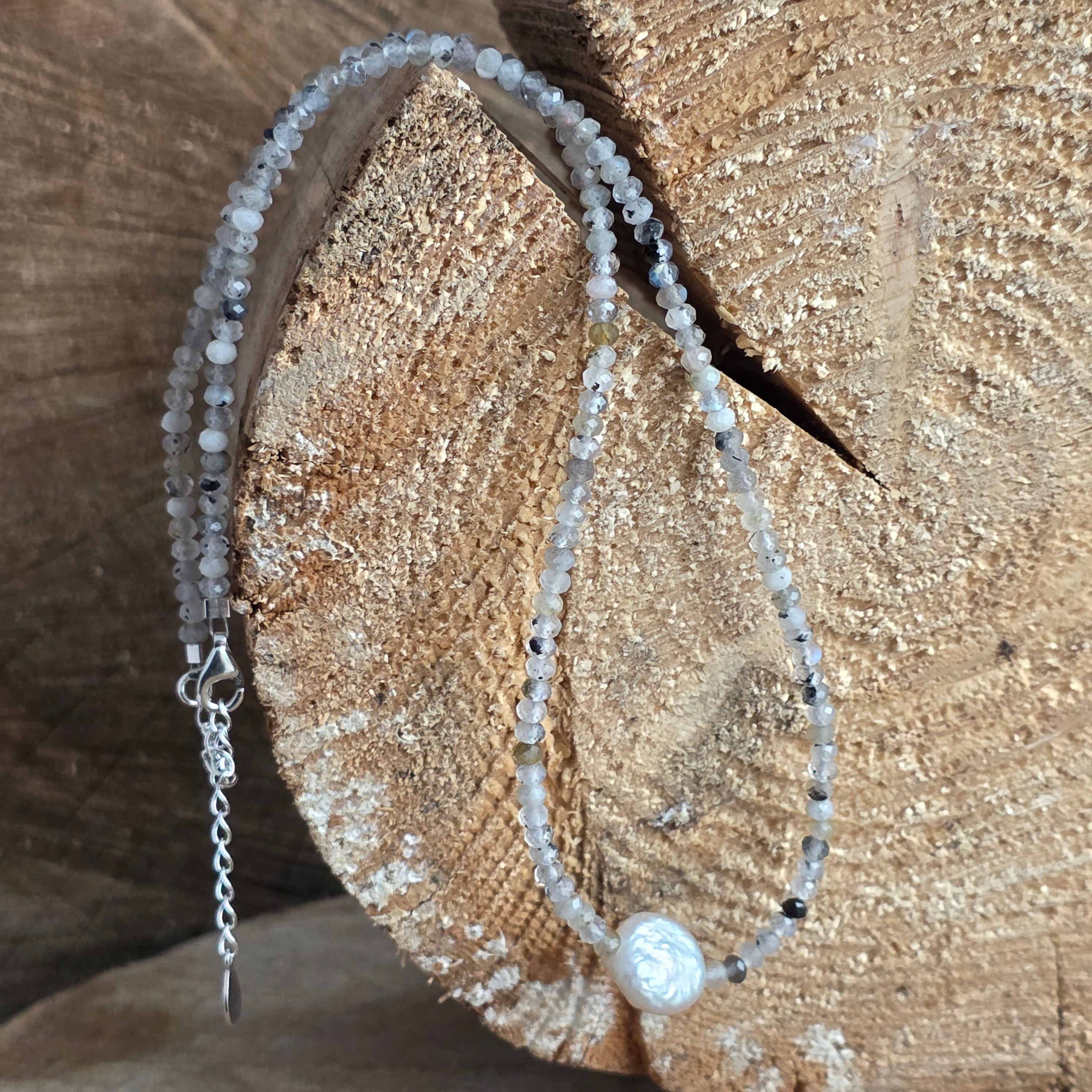 A necklace that seems born from polar light, where the sky touches the earth and colors merge into a single breath. Labradorite, with its blue, green, and golden reflections, hides in each 3 mm sphere the mystery of the universe and the charm of the unknown.