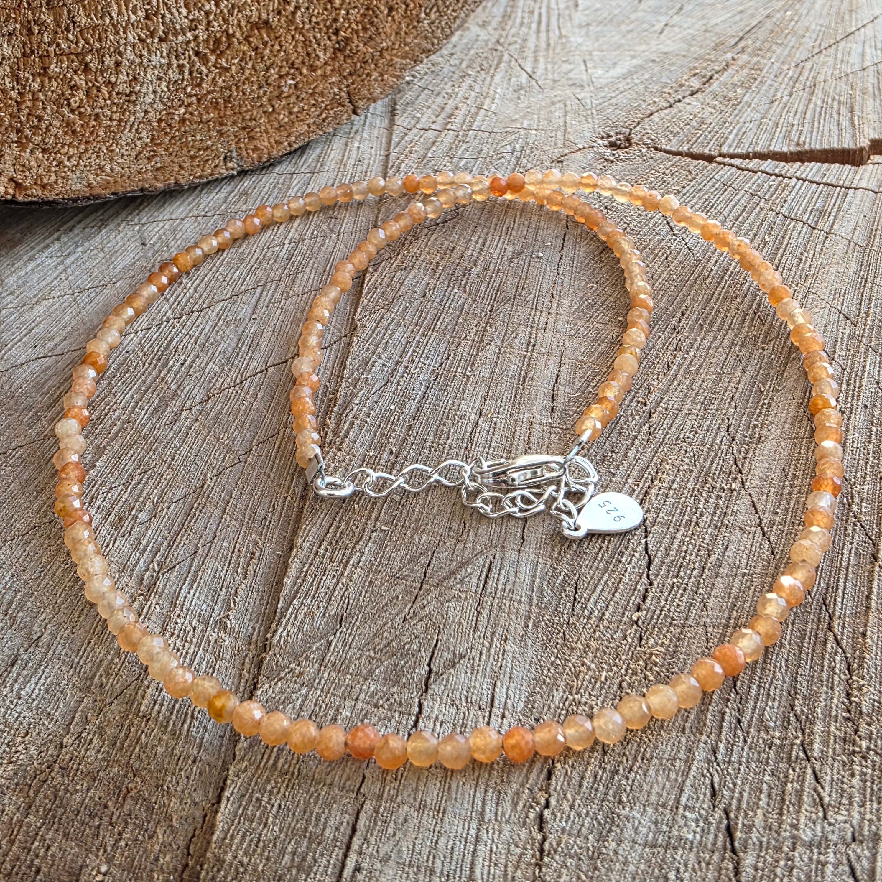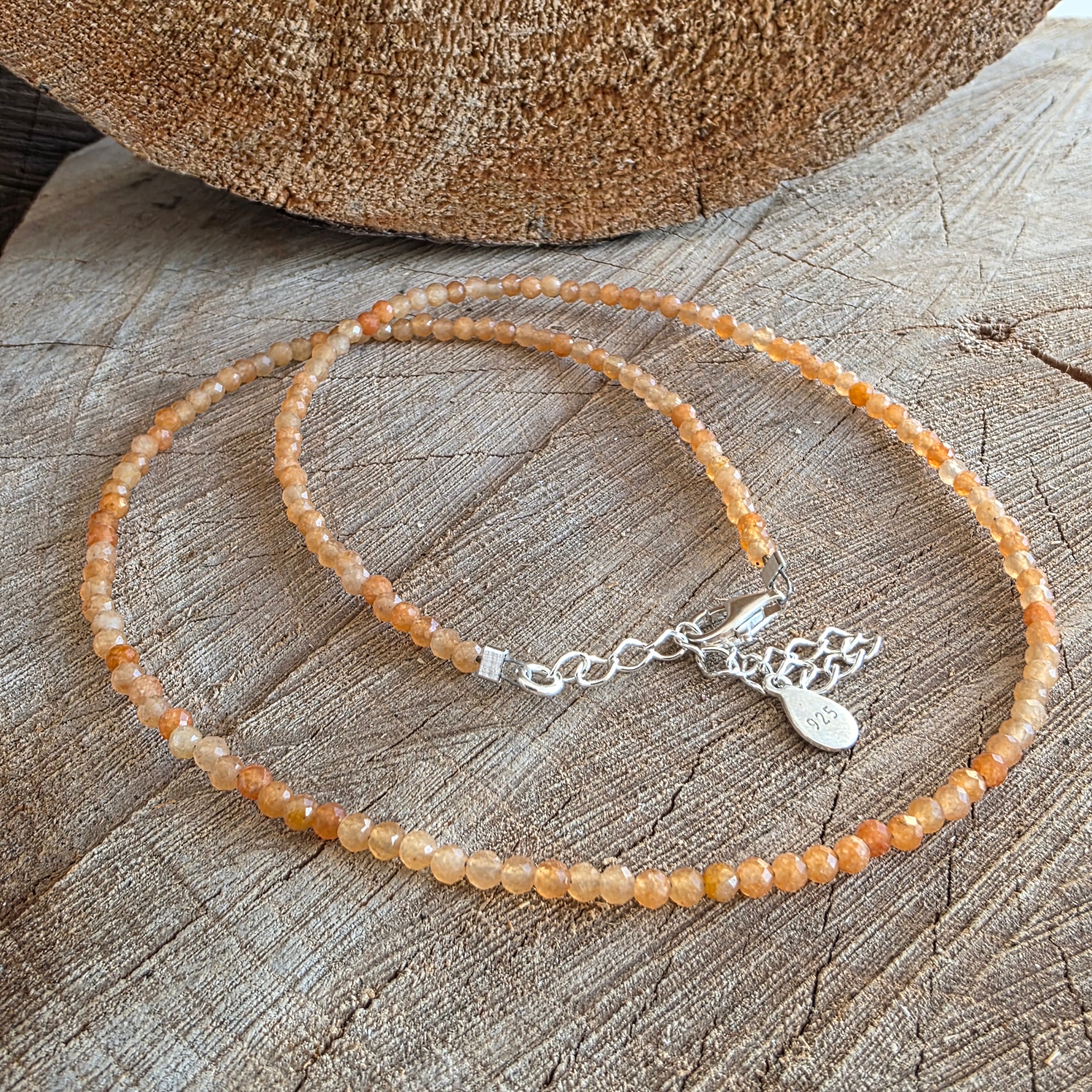 The thread is composed entirely from spheres of faceted by 2.5 mm orange adventurine, fine beads, transparent in some angles and silky in others, which catch the light in gentle sparks, like the glimmer of the west over the warm sand. The shades vary between the extinguished peach and a subtle tint of light amber - a solar color, but undisturbing, which comforts, does not blind.