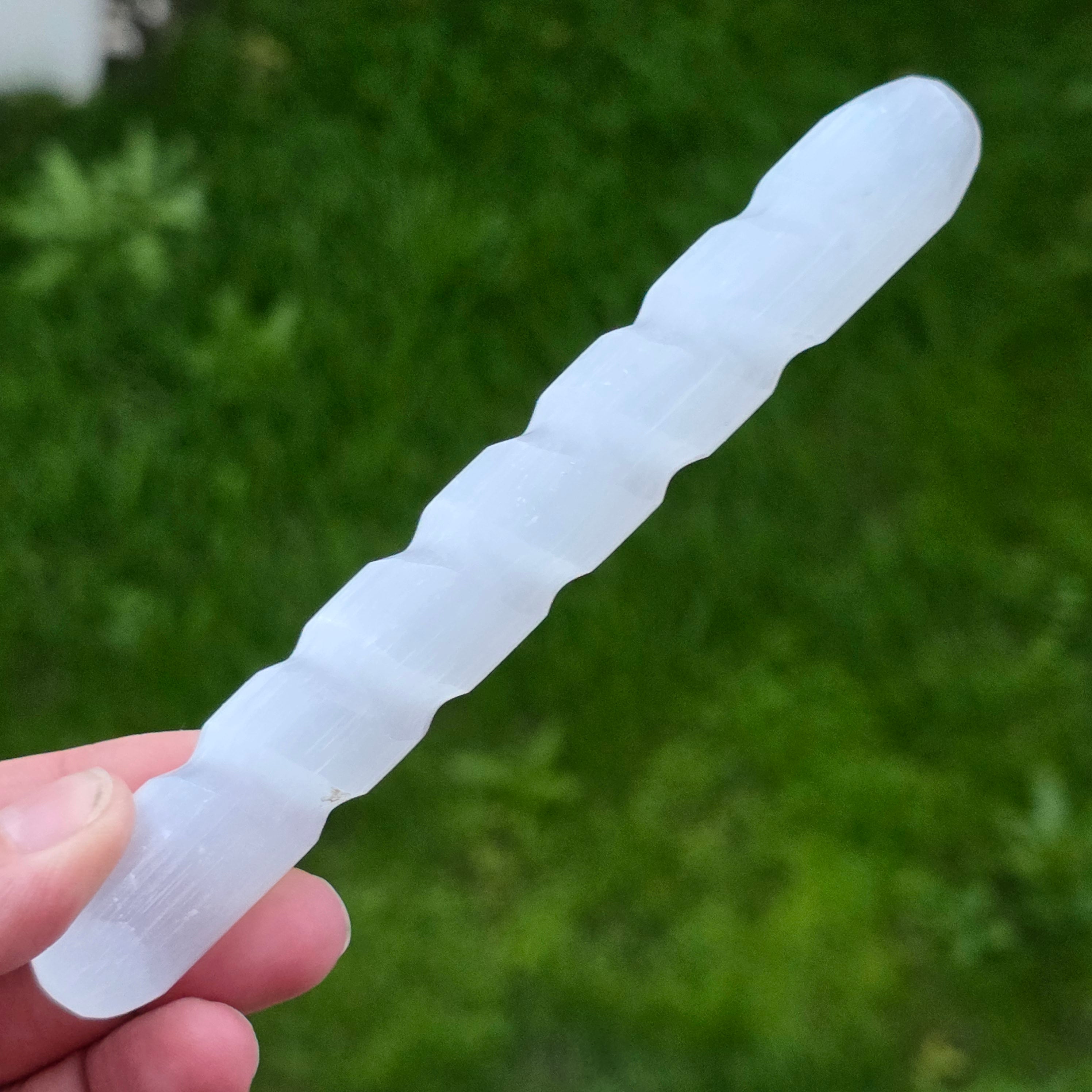 Selenitul este adesea folosit ca un cristal de sprijin în practicile spirituale, ajutând la deschiderea și activarea chakrelor 6 si 7, care sunt asociate cu intuiția, clarviziunea și conexiunea la nivel spiritual.
