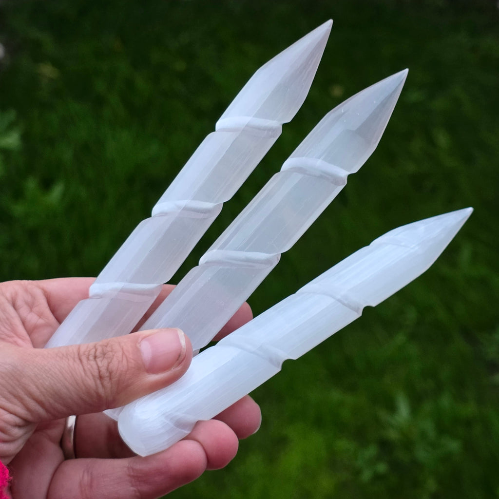 Selenitul este adesea folosit ca un cristal de sprijin în practicile spirituale, ajutând la deschiderea și activarea chakrelor 6 si 7, care sunt asociate cu intuiția, clarviziunea și conexiunea la nivel spiritual.