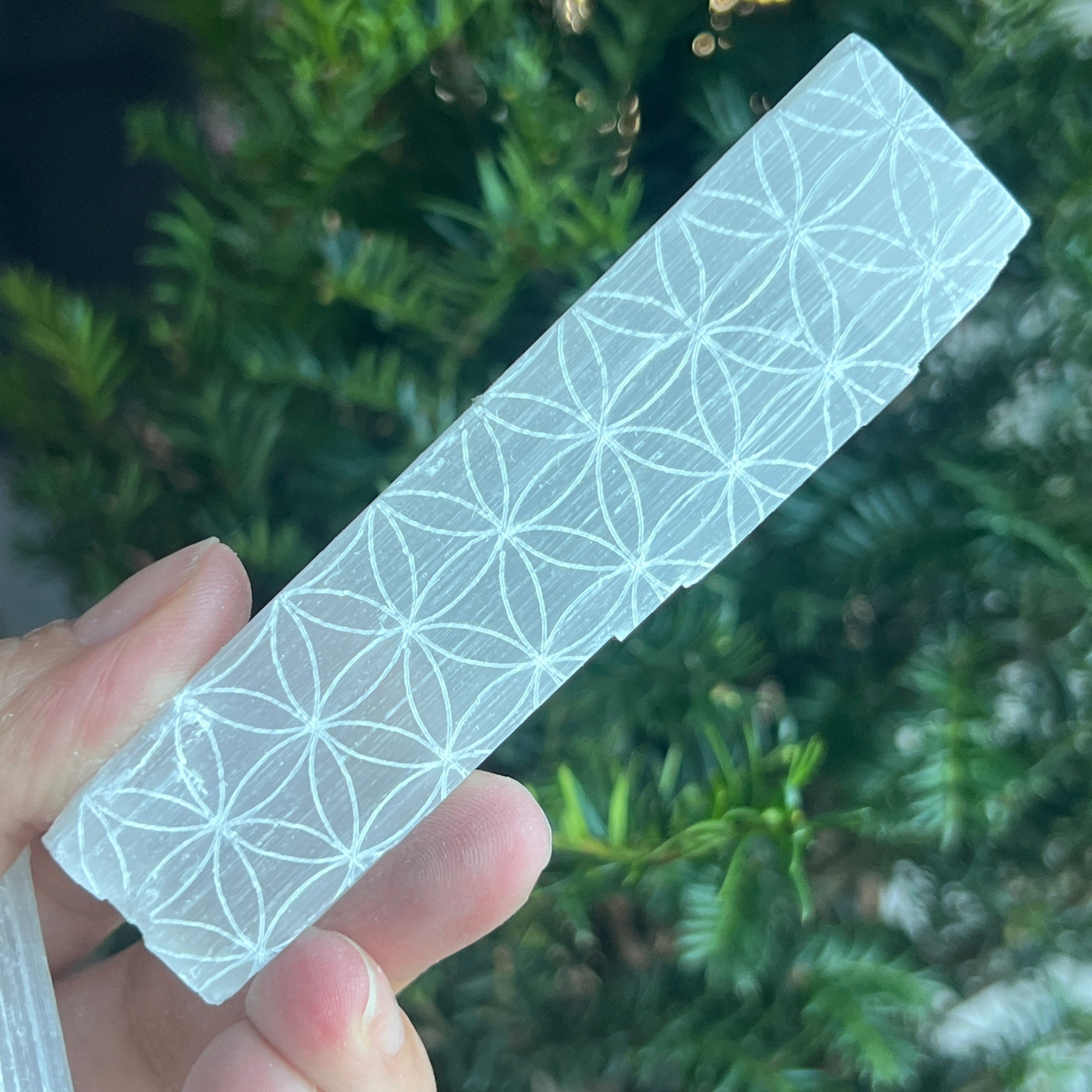 Formă: baghetă / felie, gravată cu Floarea Vieții (Flower of Life)