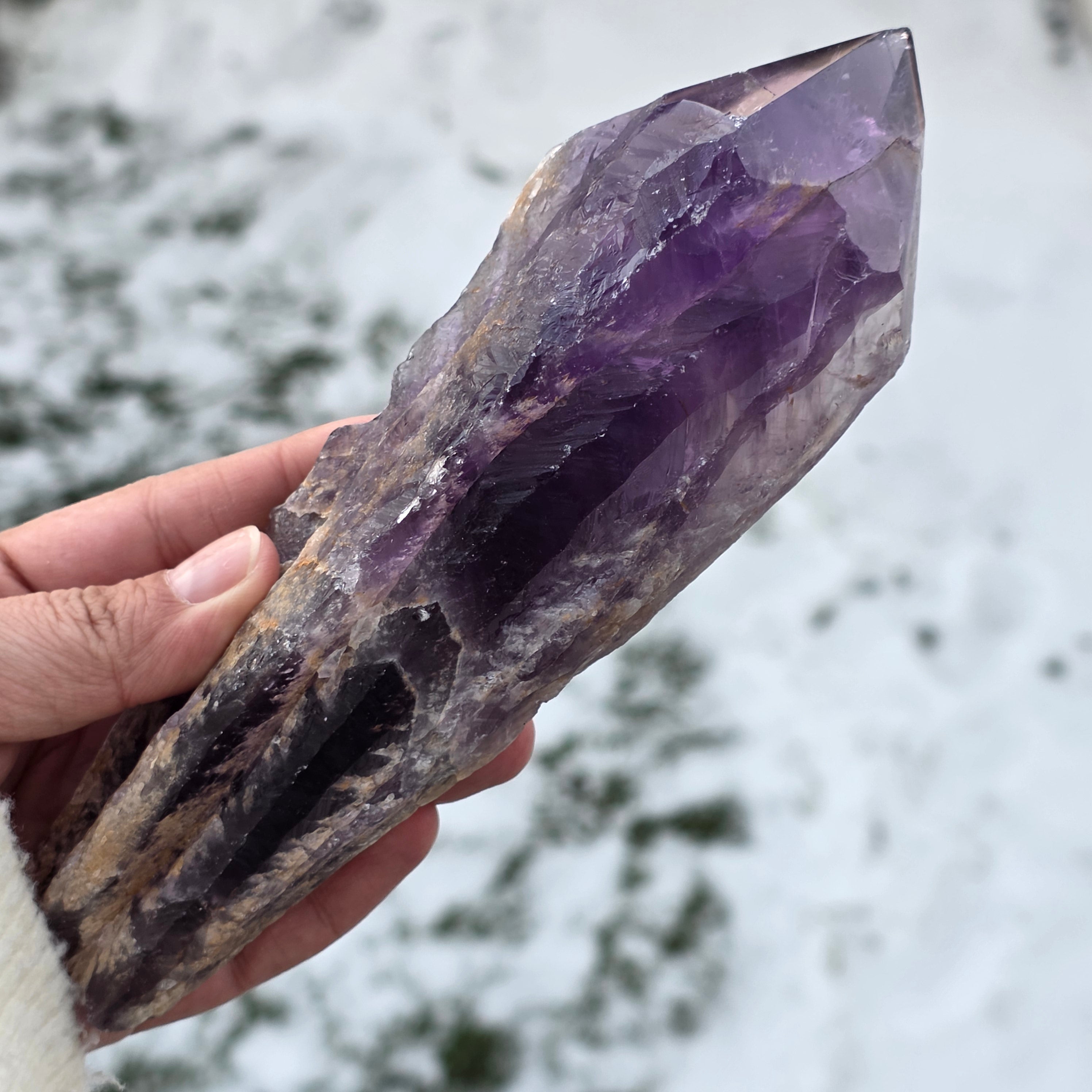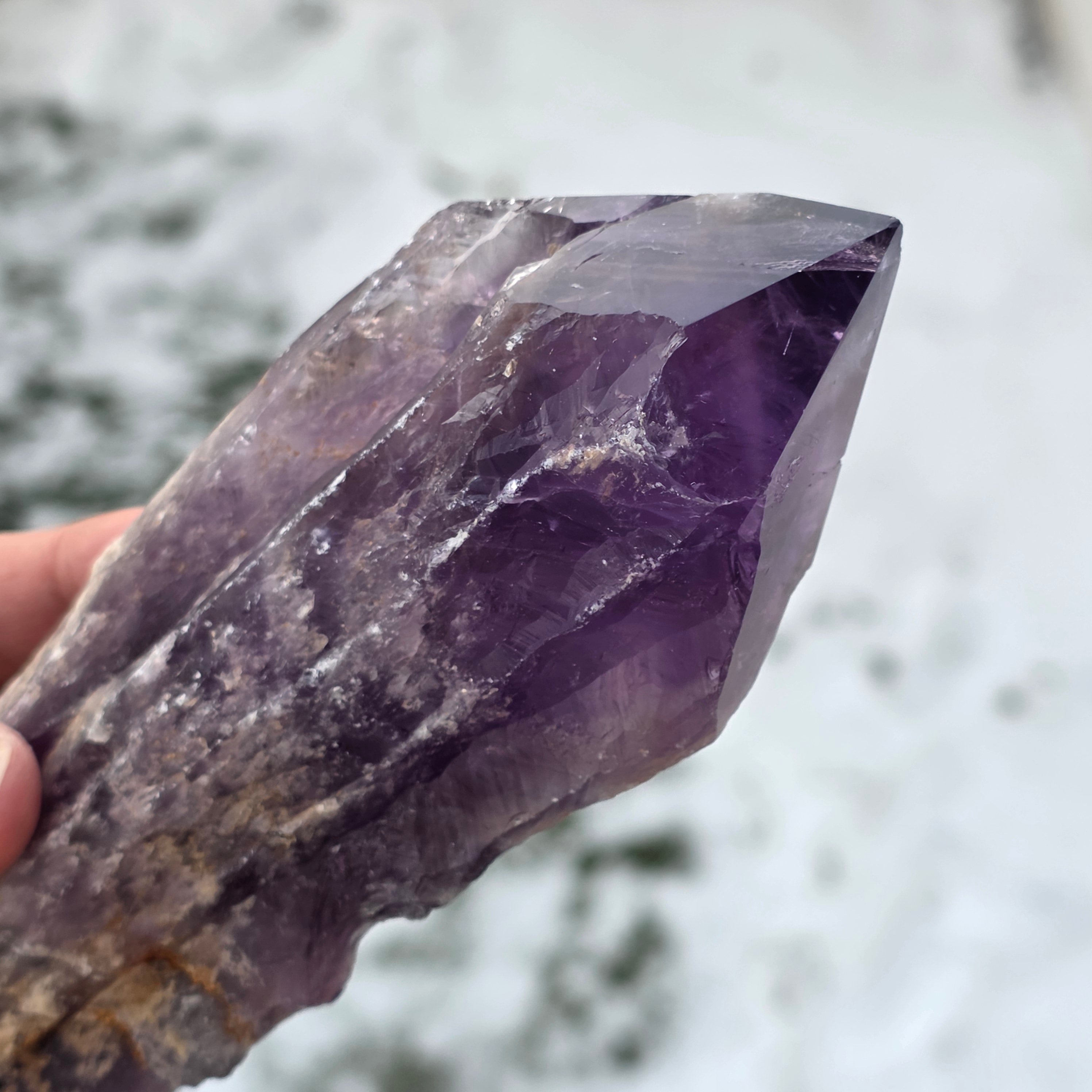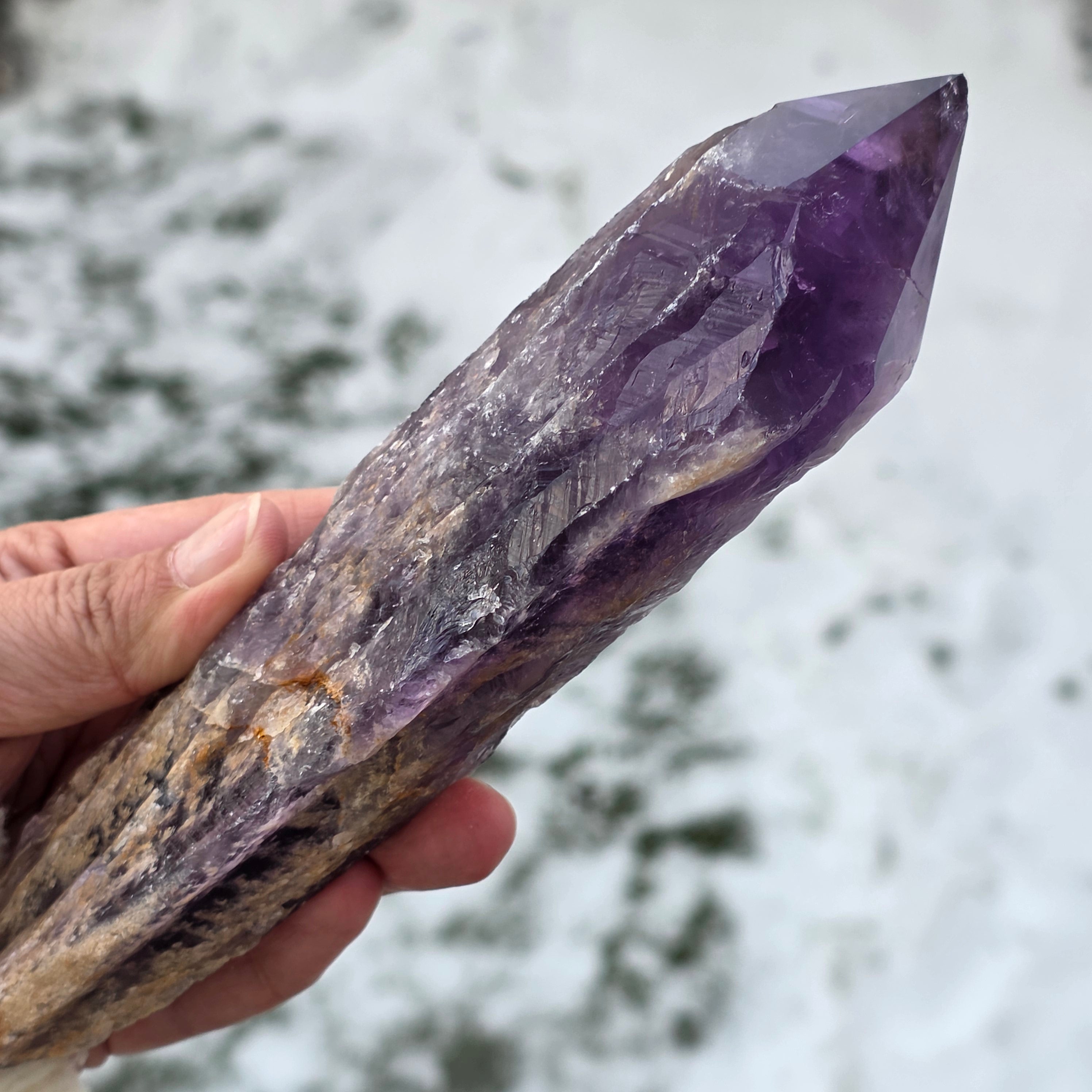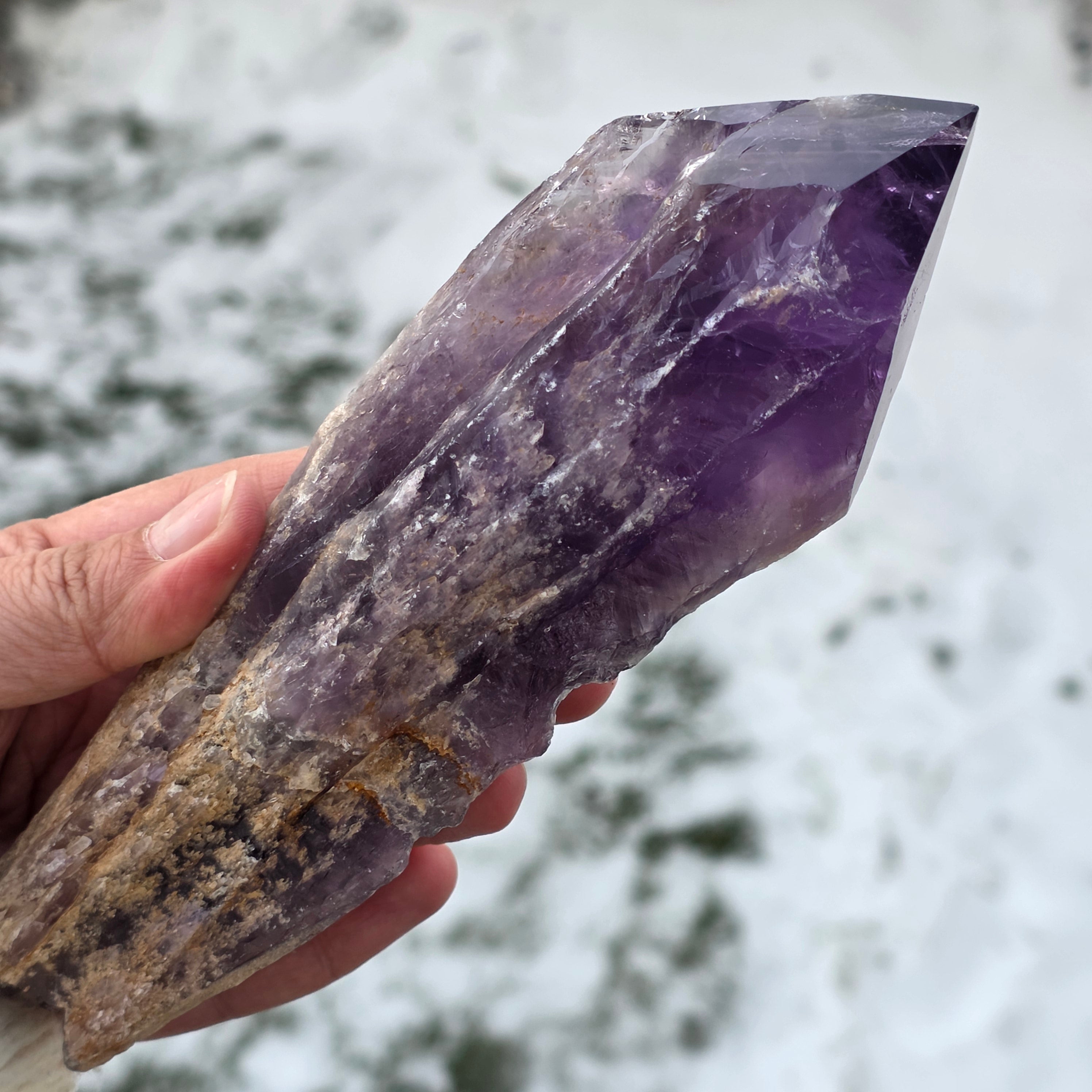 Bahia Amethyst, sometimes called "Dragon's Corner", is mined from the Bahia region of Brazil. Each crystal is a unique natural specimen with a well-defined crystalline shape and features keys or protrusions along its entire length. These crystals are not detached from a larger group, but are formed individually, one by one.