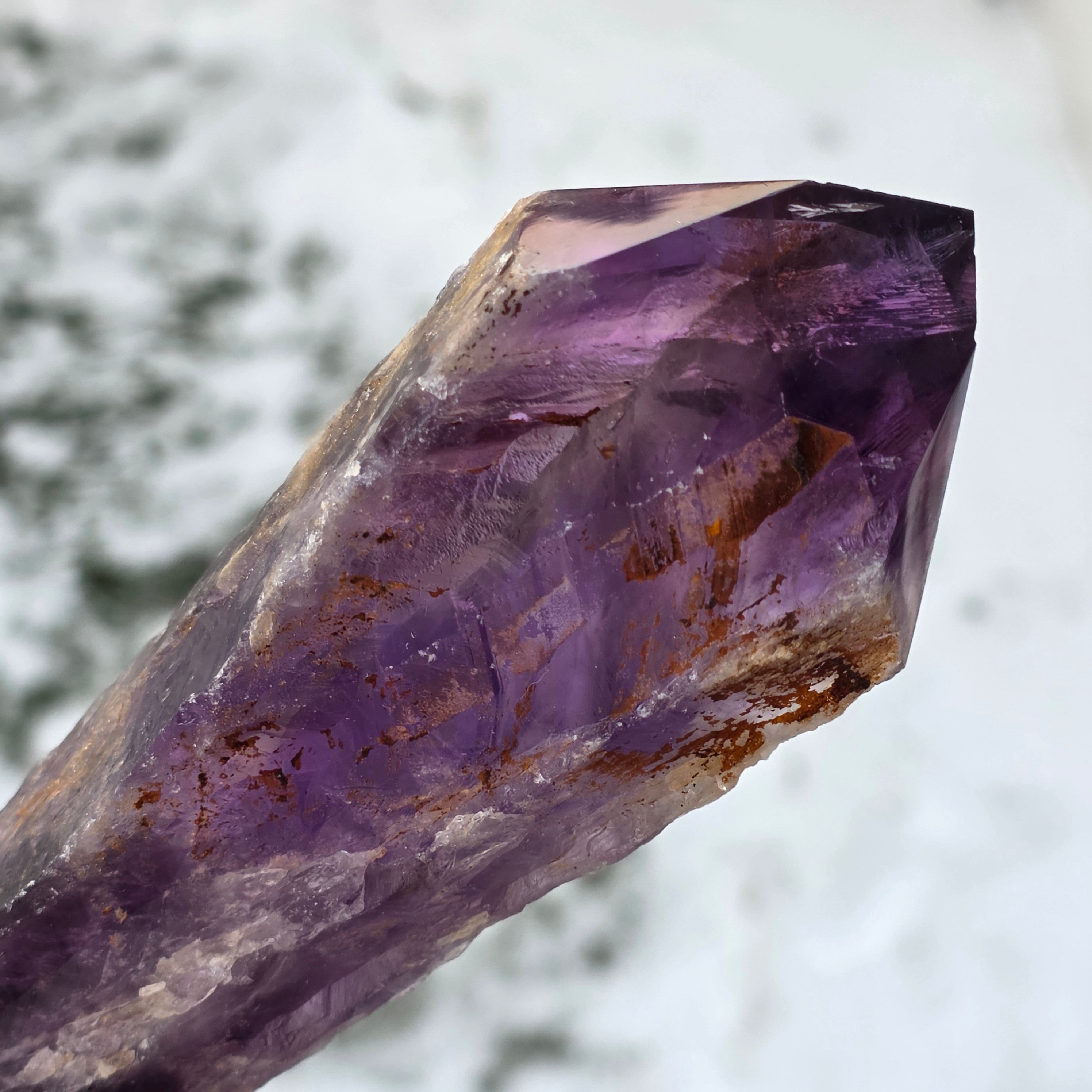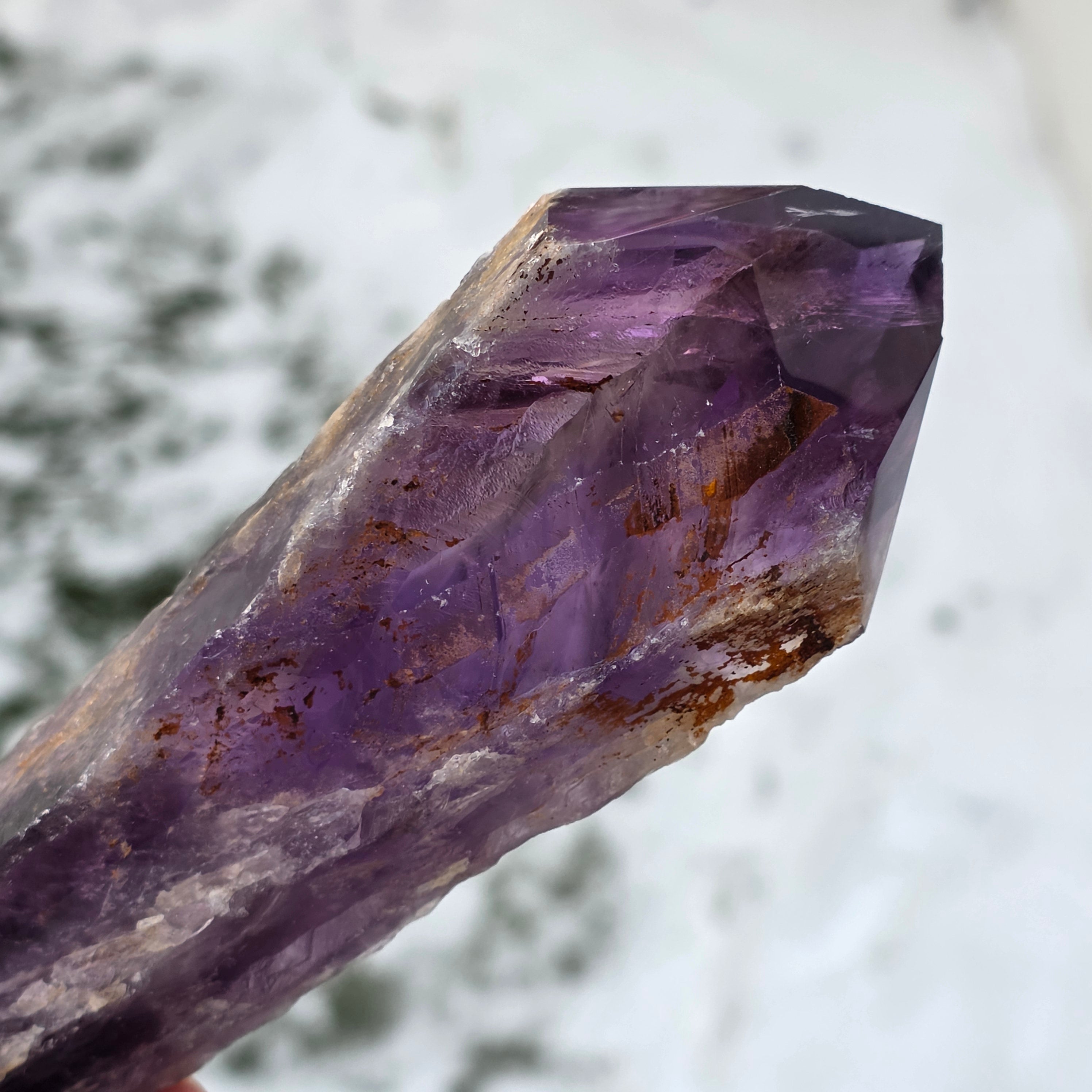 Bahia Amethyst, sometimes called "Dragon's Corner", is mined from the Bahia region of Brazil. Each crystal is a unique natural specimen with a well-defined crystalline shape and features keys or protrusions along its entire length. These crystals are not detached from a larger group, but are formed individually, one by one.