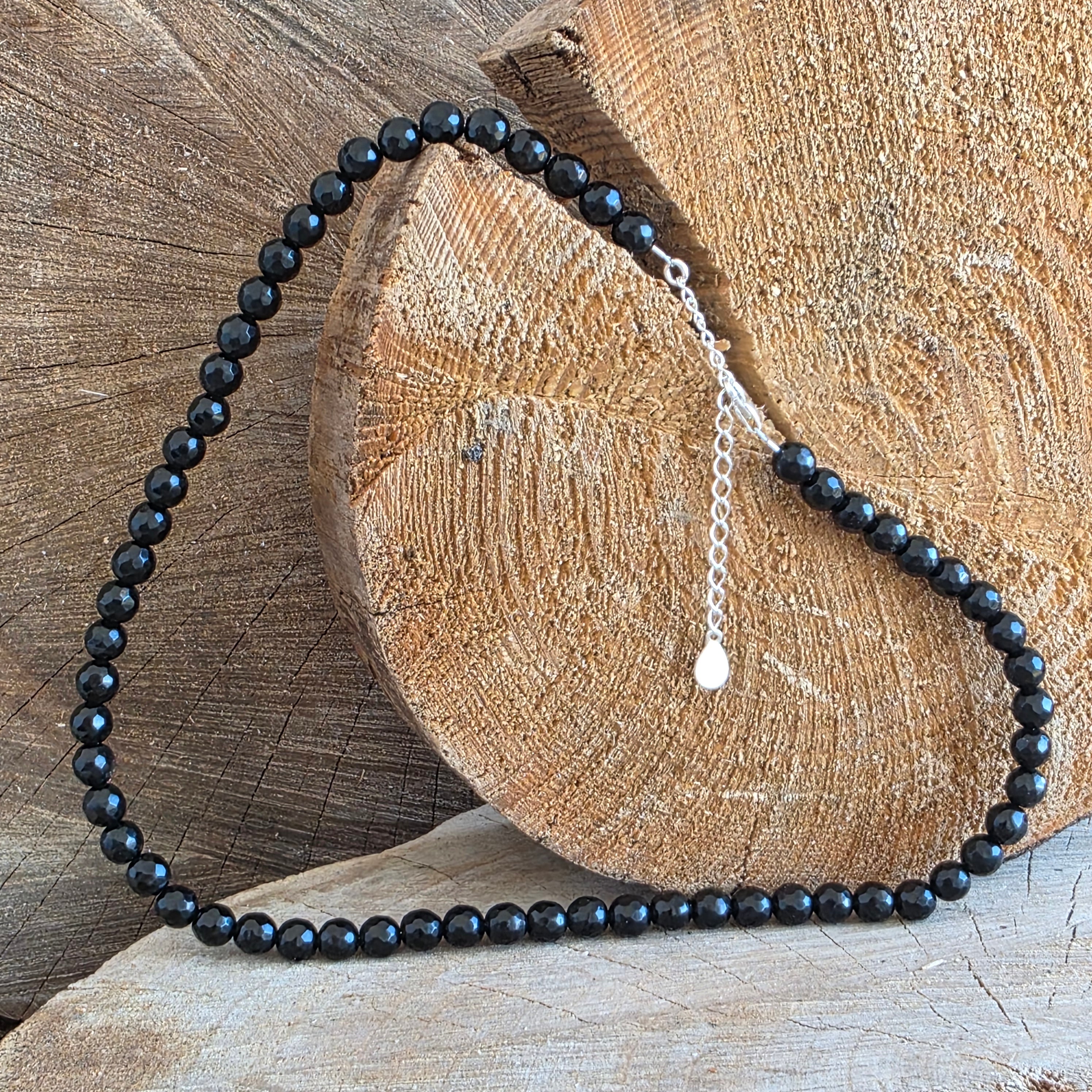 A delicate and intense necklace made from 2.5 mm faceted black obsidian beads, creating a subtle yet well-defined line around the neck. The deep black, with a discreet glassy sheen, catches the light in fine, almost graphic reflections, giving the jewelry a modern and balanced look. The small size of the beads maintains a minimalist design, highlighting the purity of the form and visual clarity.