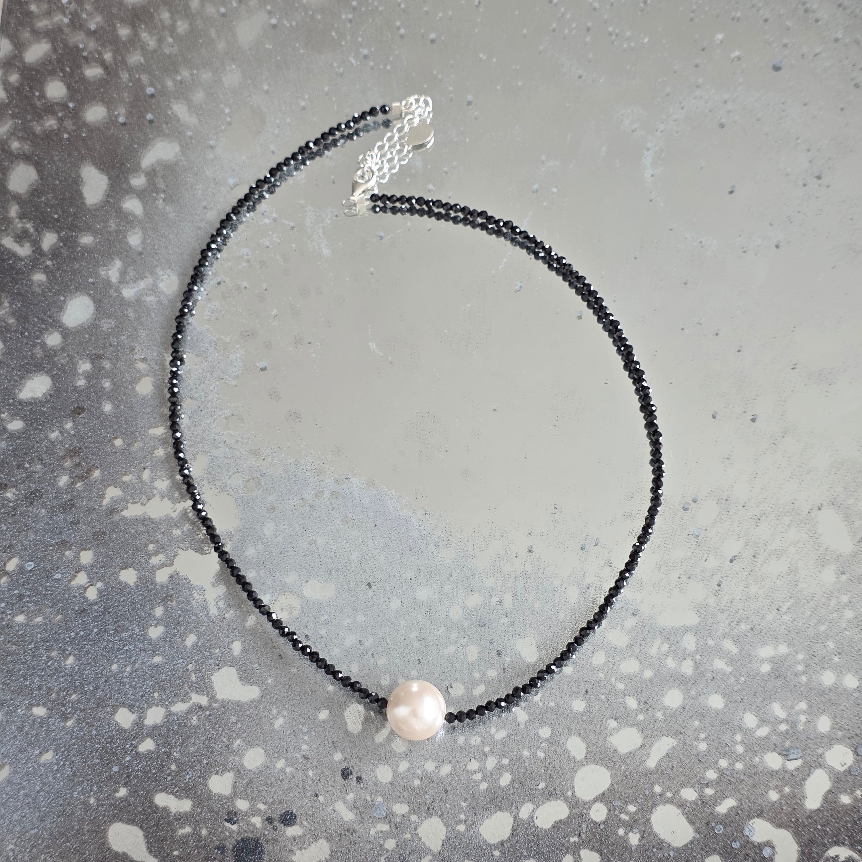 Materials: 2 mm faceted black spinel, 925 silver, 1 cm pearl