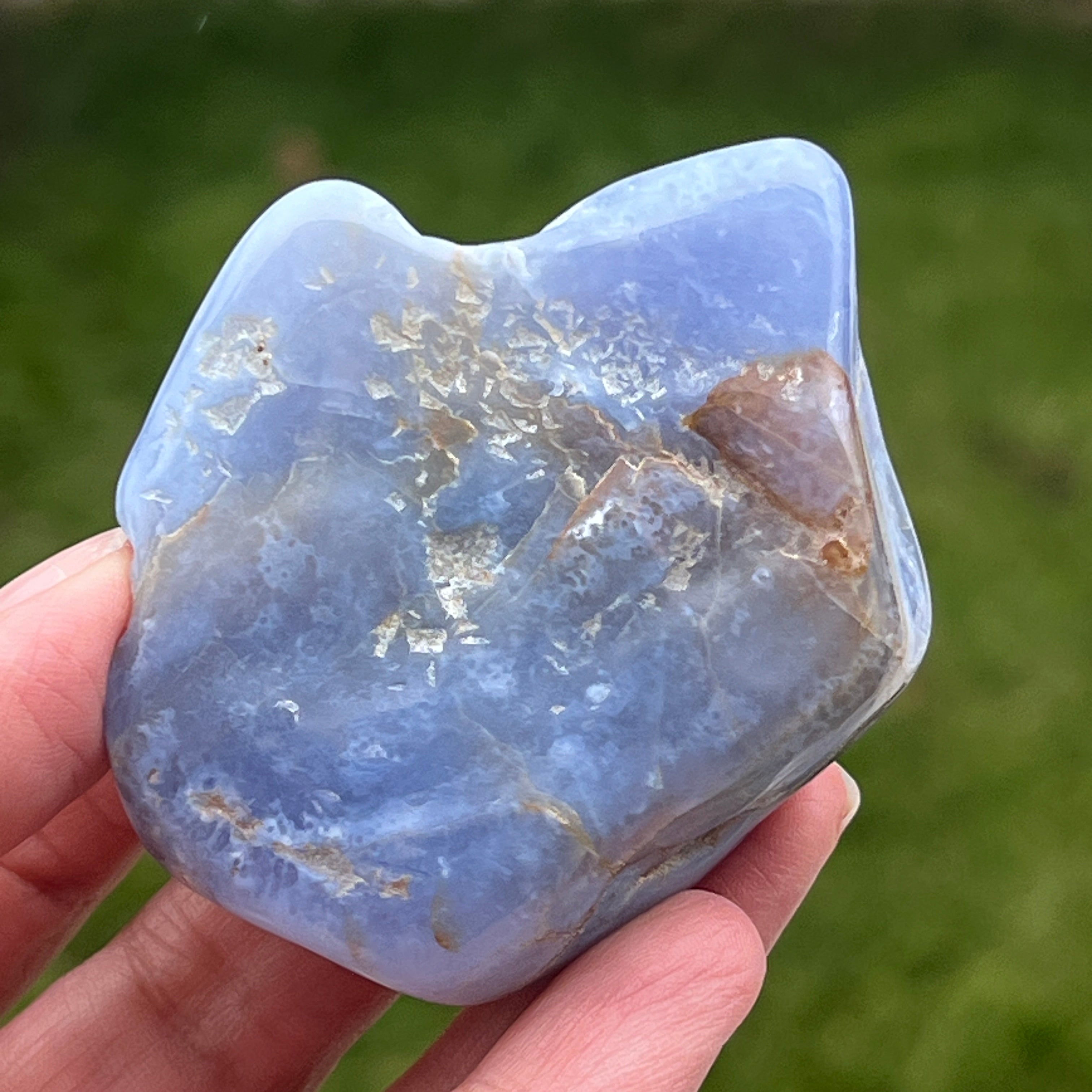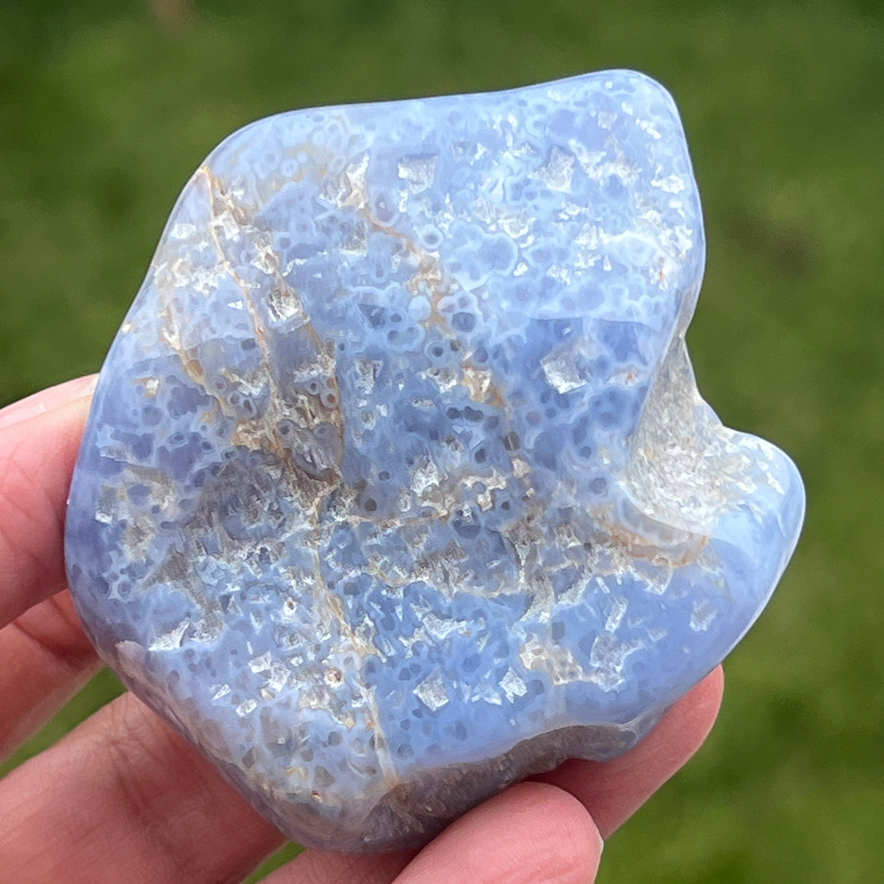 Blue chalcedony is generally associated with communication, self-expression, and truth, and it can help stimulate authentic communication.