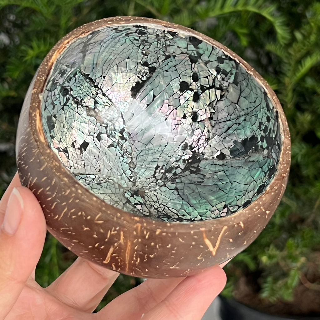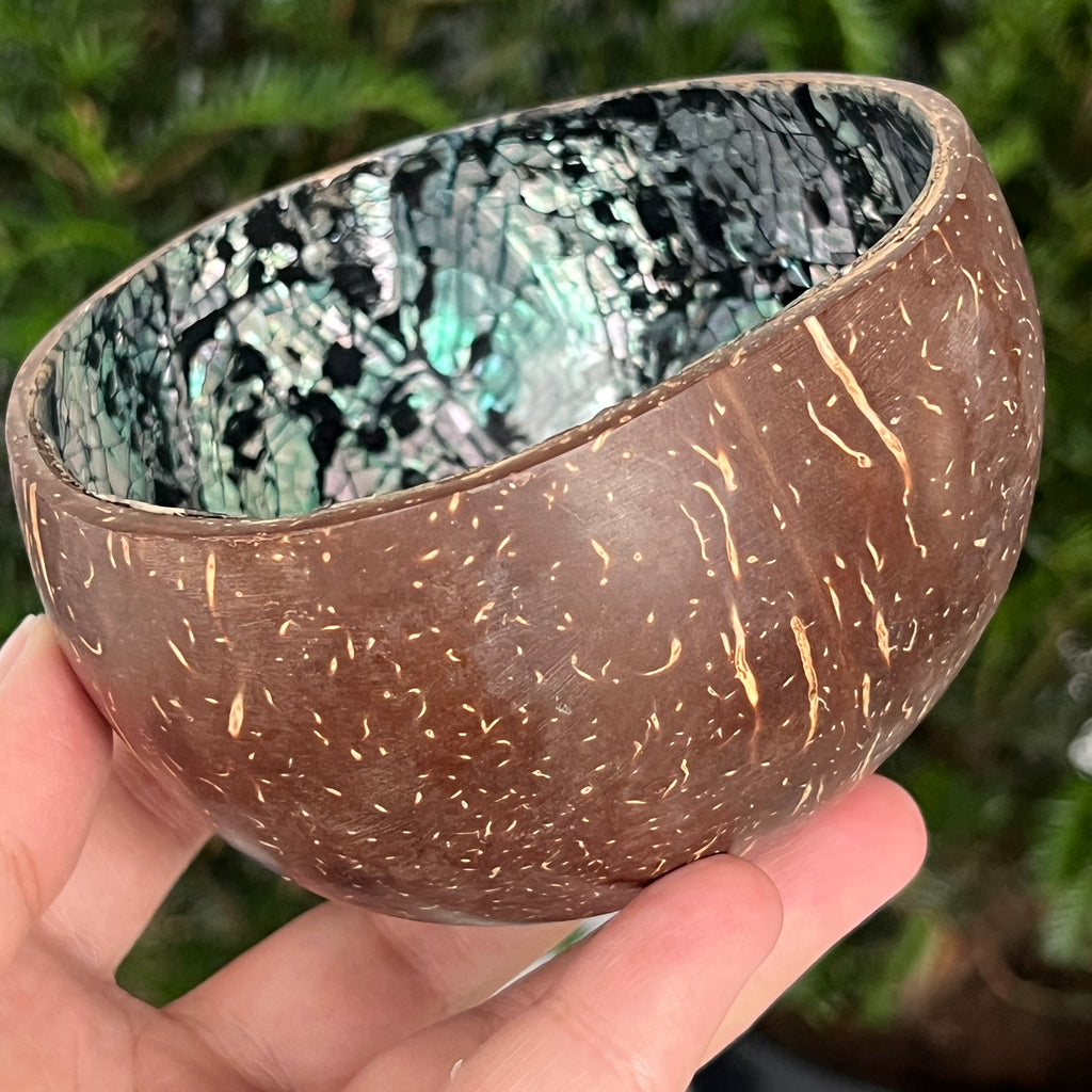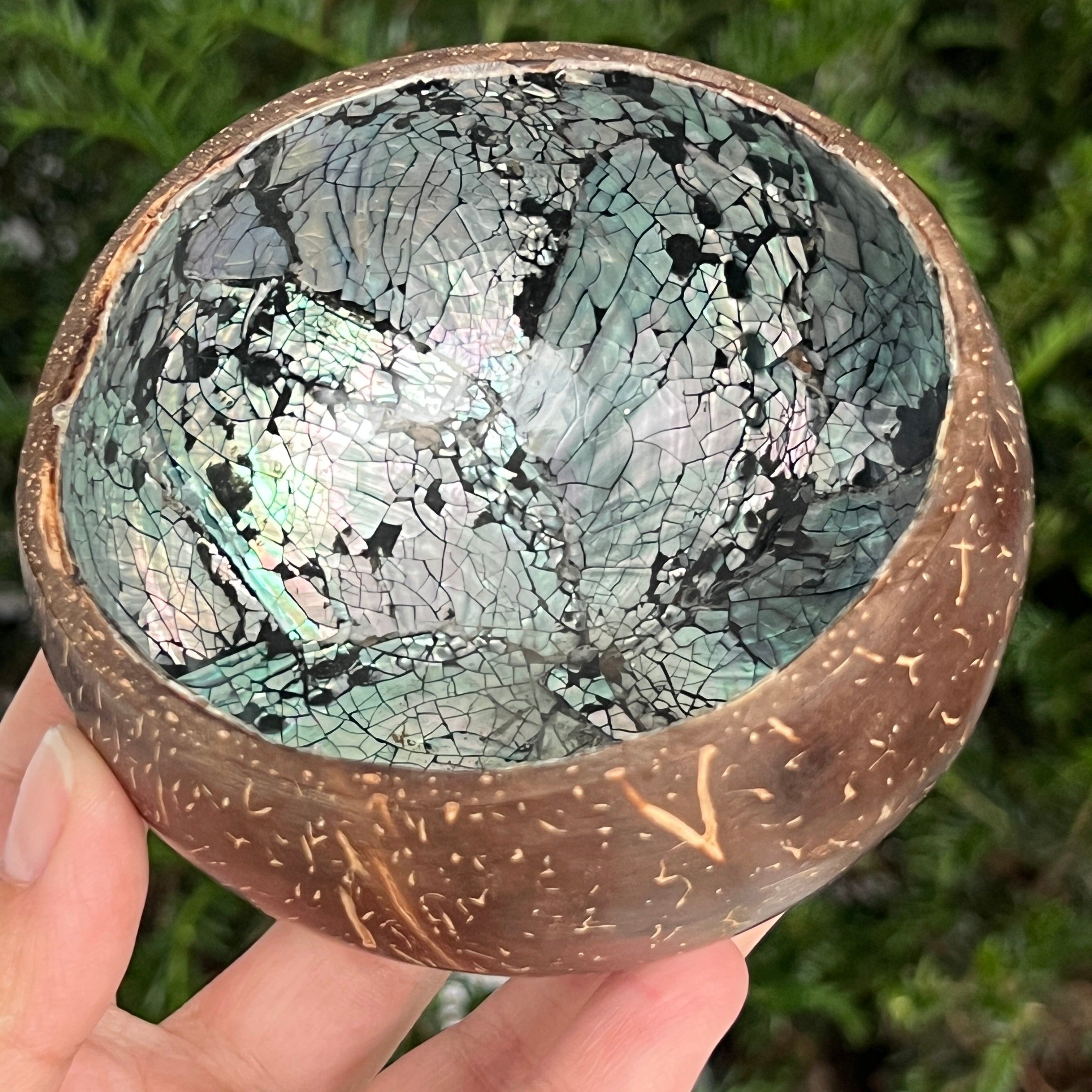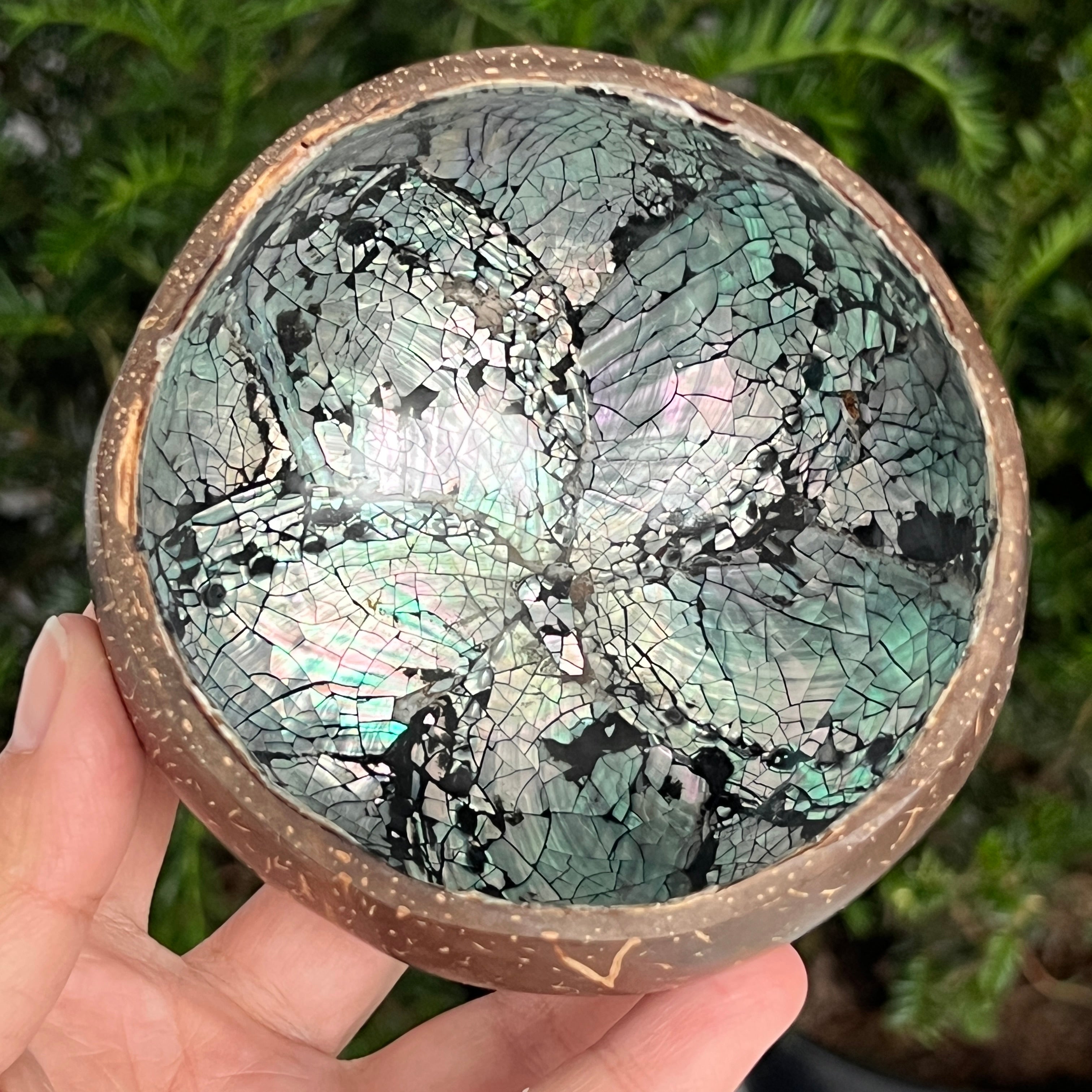 • Finisaj: interior din scoică abalone cu luciu sidefat, exterior din cocos natural, lustruit manual