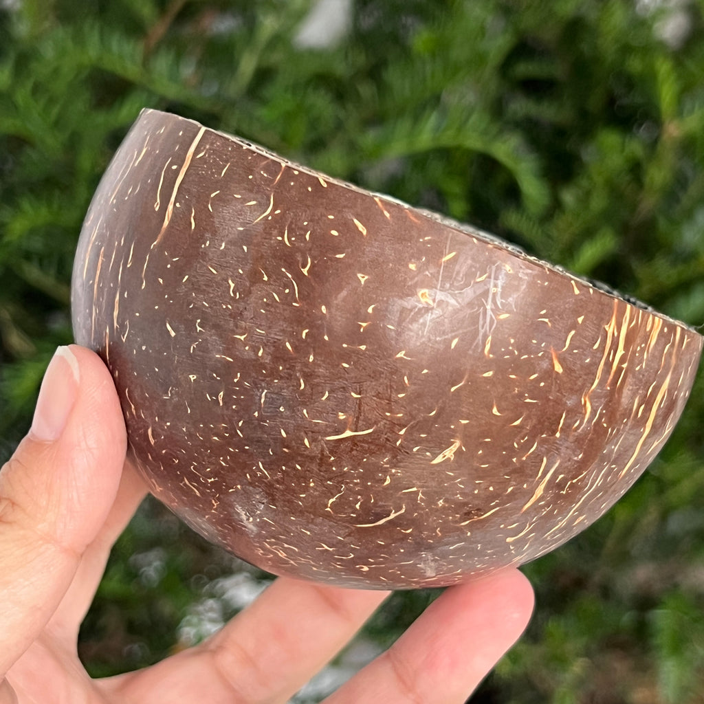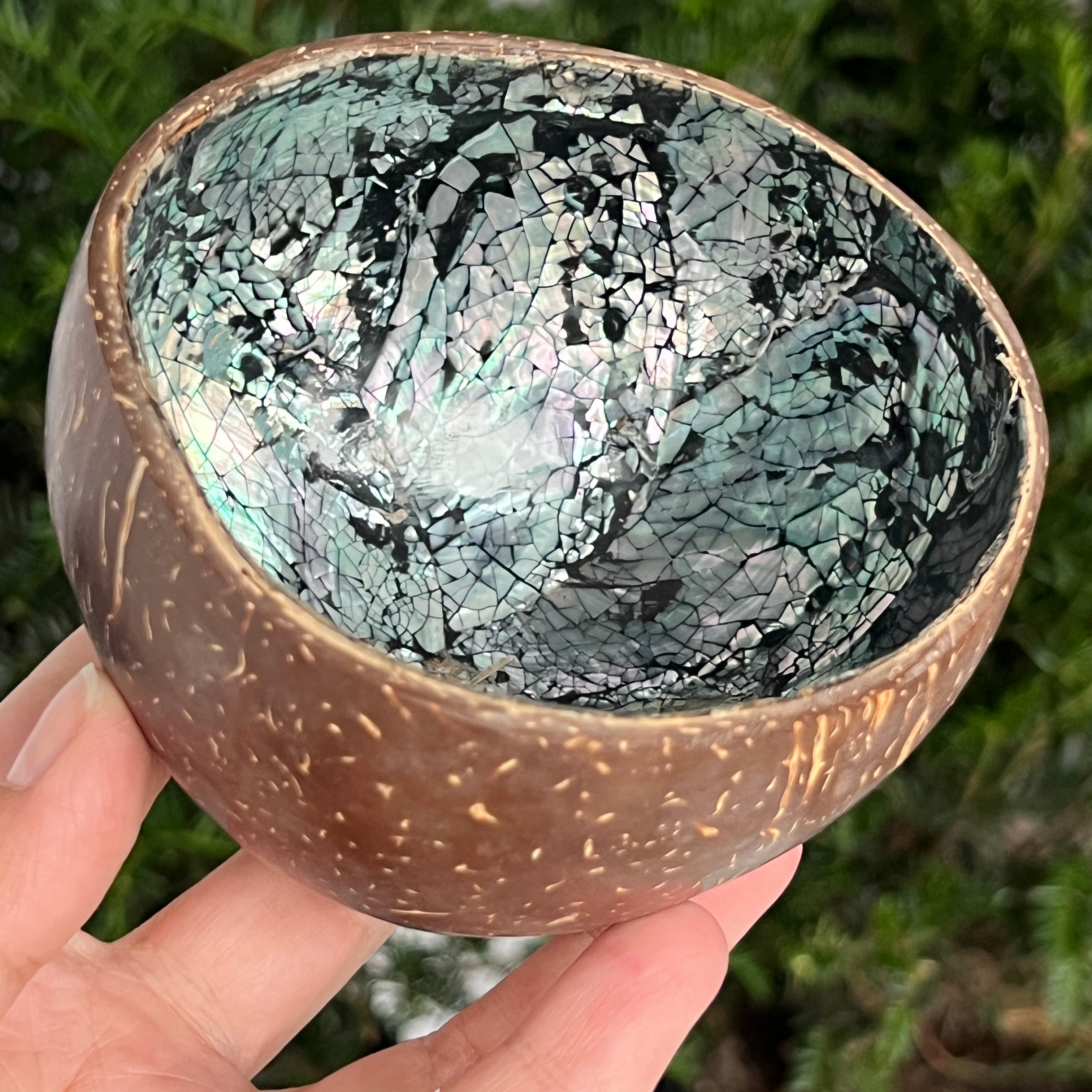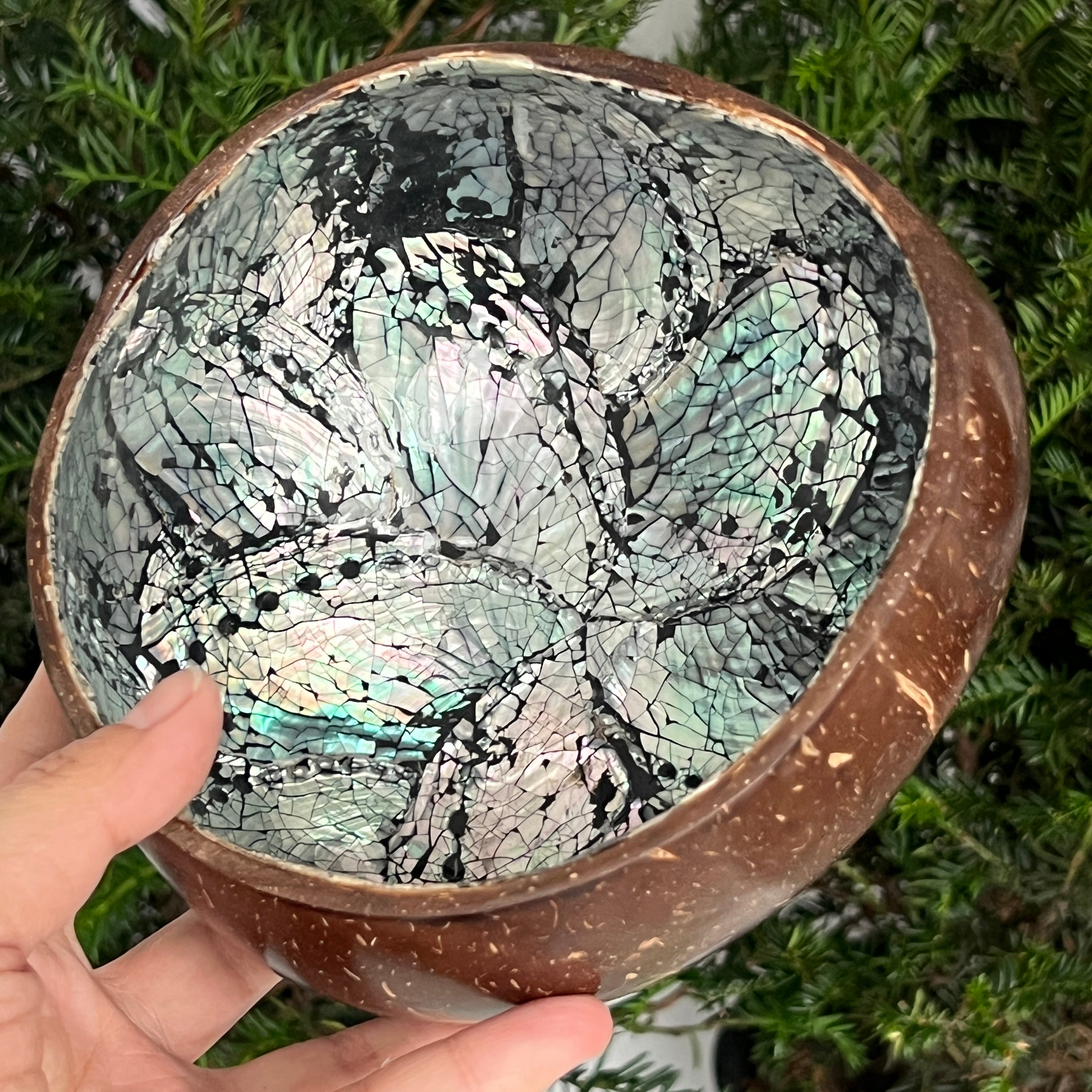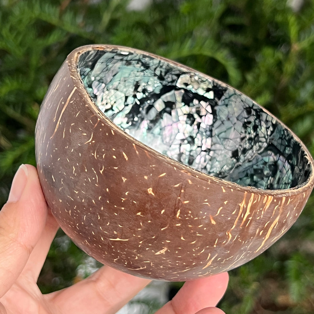 • Finisaj: interior din scoică abalone cu luciu sidefat, exterior din cocos natural, lustruit manual