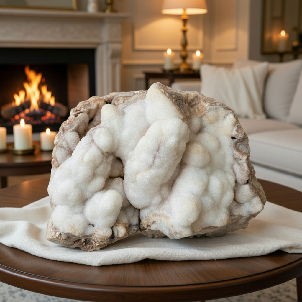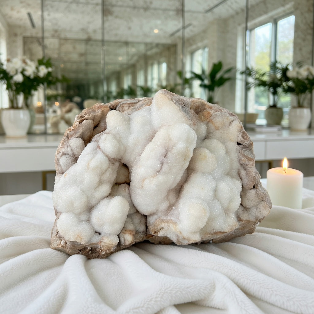 The botryoidal structure – resembling fused bunches or mineral clouds – is a rare expression of how quartz can manifest when it grows freely in cavities slowly filled with silica. It is not just a stone, but a geological work that combines the raw energy of the Earth with an ethereal beauty.