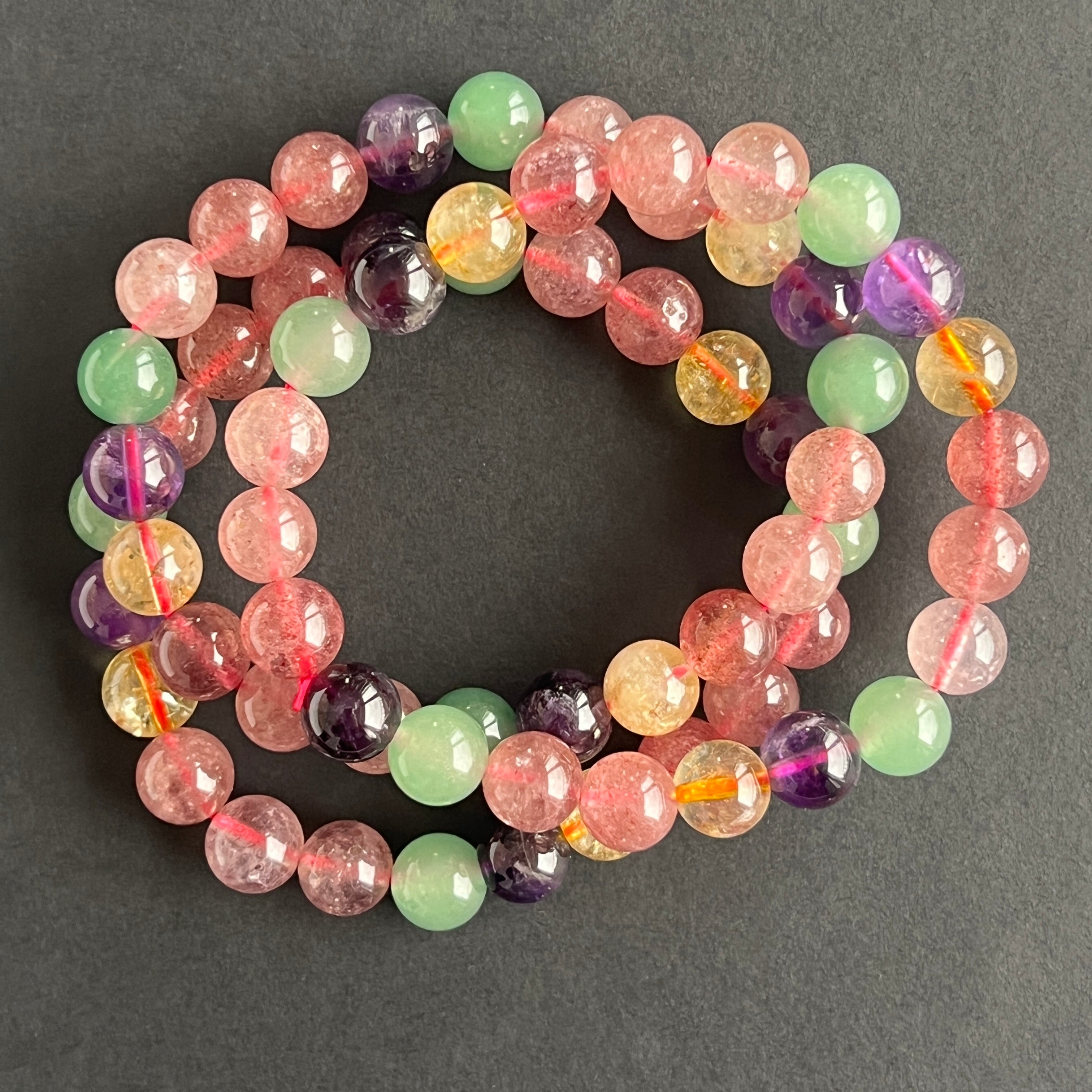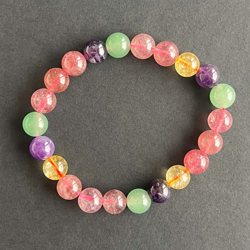 - Pietre: aventurin, cuarț rutilat, cuarț strawberry, ametist (mix natural de cristale)