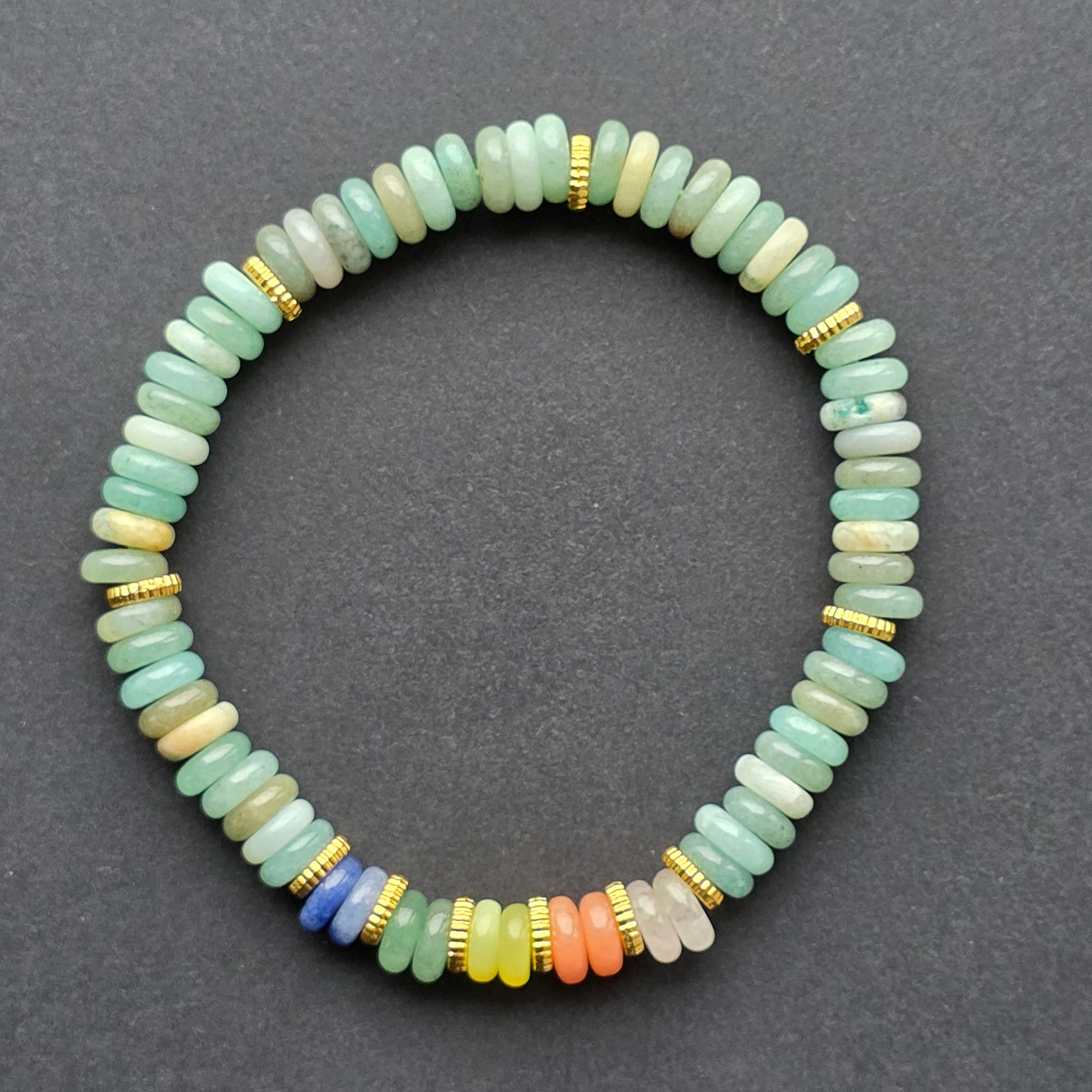În partea frontală, segmentul 7 chakre aduce un accent vibrant, menit să ofere un echilibru cromatic și simbolic. Culorile calde și reci se armonizează firesc cu tonurile acvatice ale amazonitului, transformând brățara într-o piesă cu expresie vizuală puternică: liniște, inspirație și energie interioară bine dirijată.