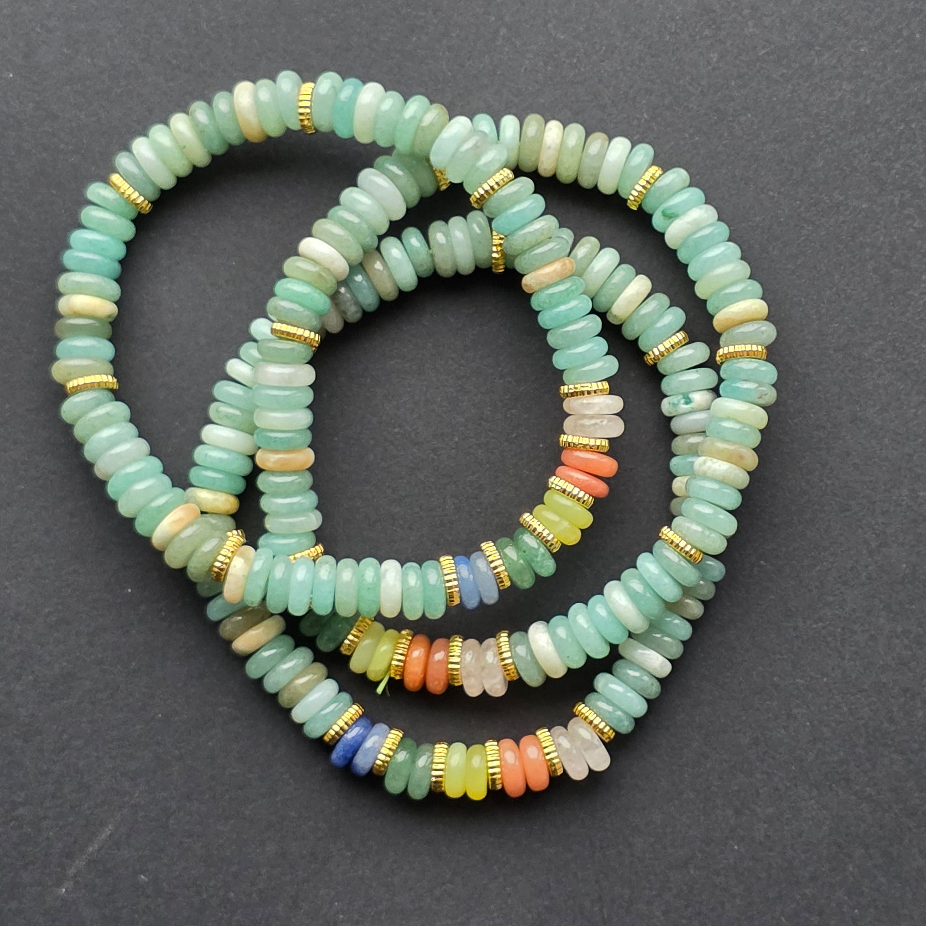 Brățara din amazonit natural surprinde prin nuanțele sale blânde de verde și turcoaz, cu mici variații specifice pietrei brute, ce dau unicitate fiecărui disc. Lumina pare să se așeze delicat pe suprafața cristalină a amazonitului, creând o strălucire subtilă și o textură calmă, perfectă pentru un accesoriu purtat zi de zi.