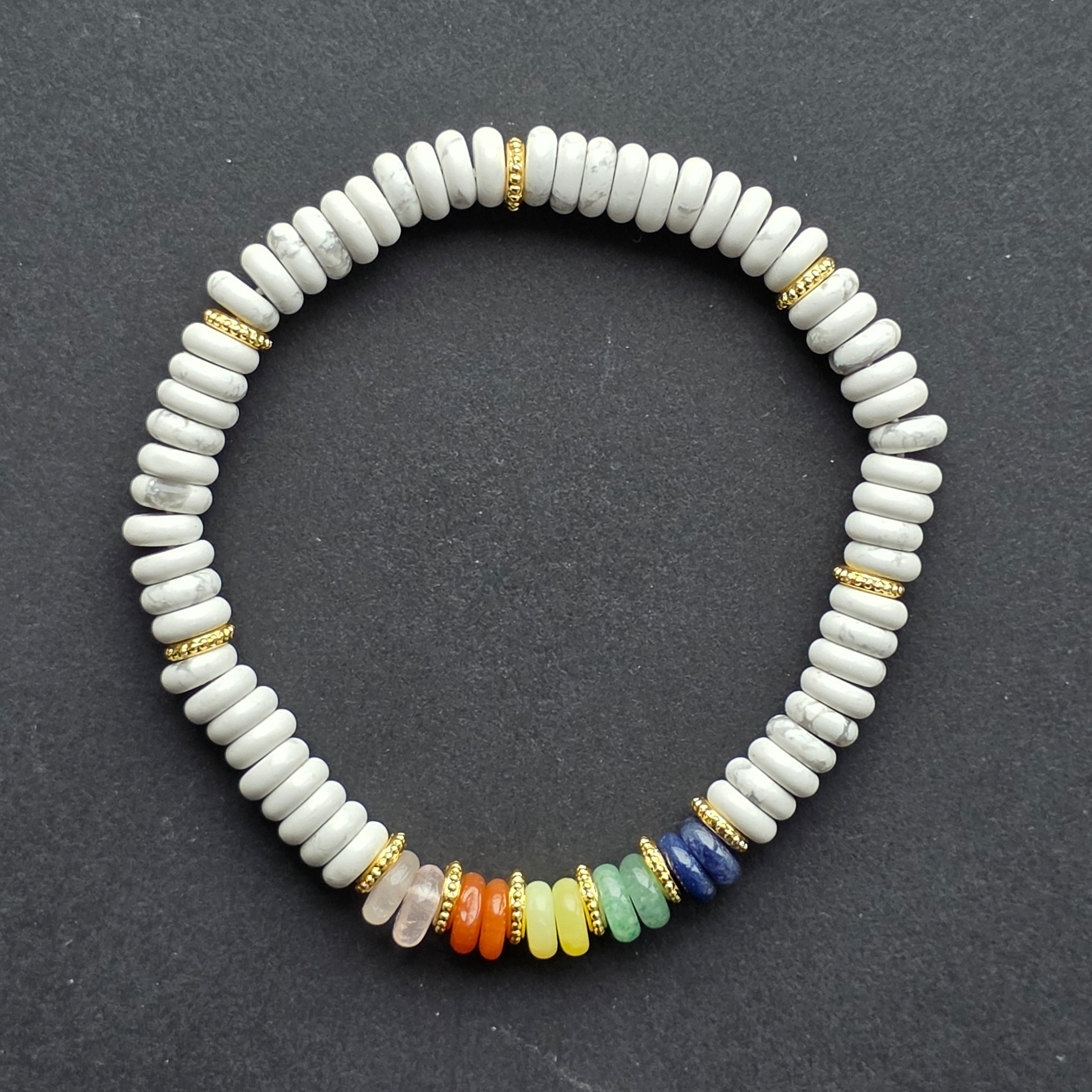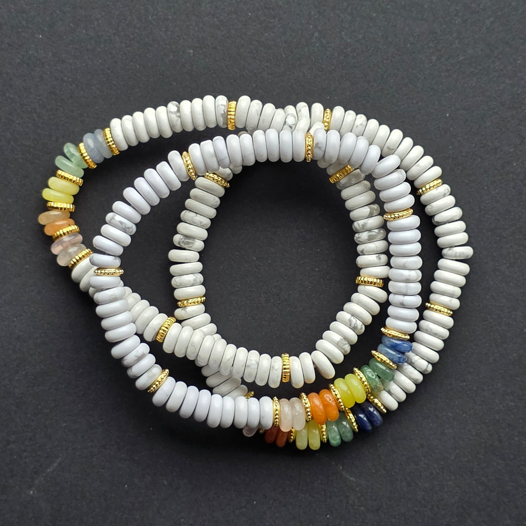 Brățară creată din howlit alb natural, un mineral cunoscut pentru liniile sale subtile și pentru aspectul calm, minimalist. Discurile fine creează o textură plăcută la atingere, iar nuanțele albe, marmorate, oferă o eleganță pură și neutră — ușor de asortat cu orice ținută.