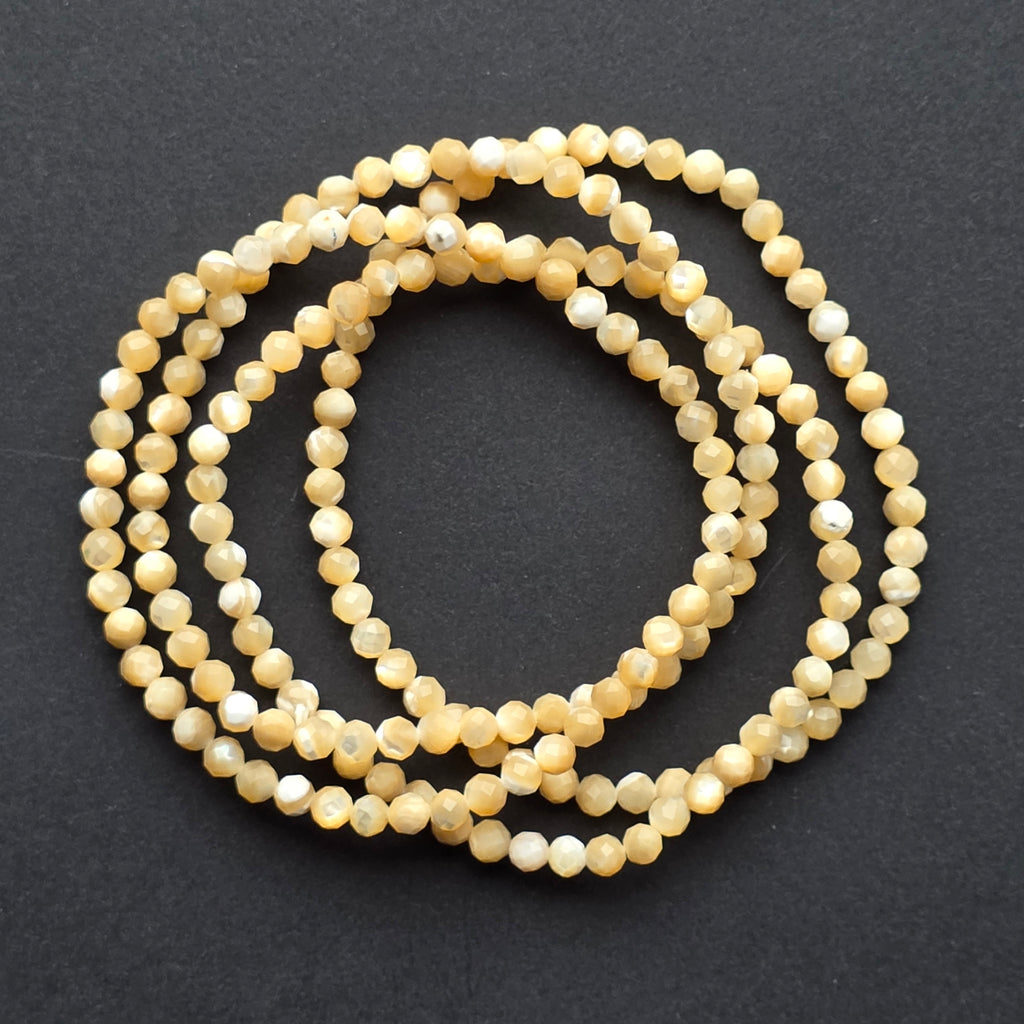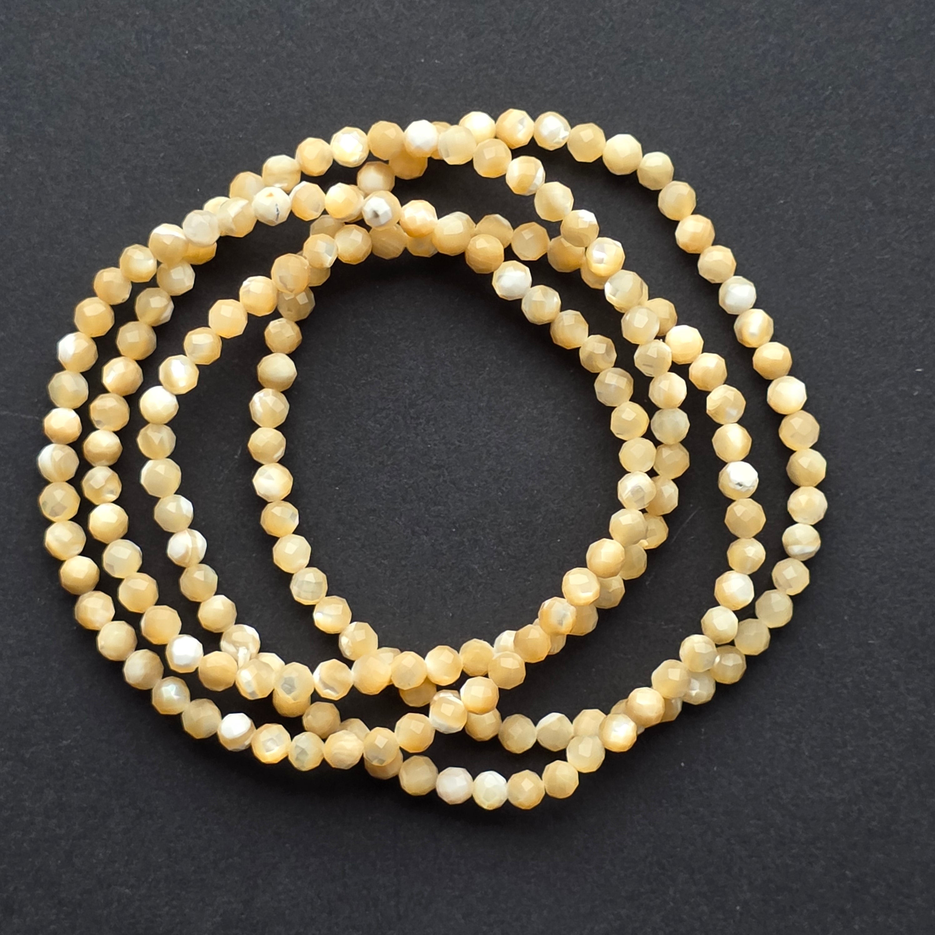 Brățara fațetată din sidef este o piesă cu lumină proprie — delicată, caldă și subtil perlată. Mărgelele mici, atent fațetate, surprind fiecare rază de lumină într-un joc fin de reflexii, păstrând totuși naturalețea organică a scoicii din care sunt create.