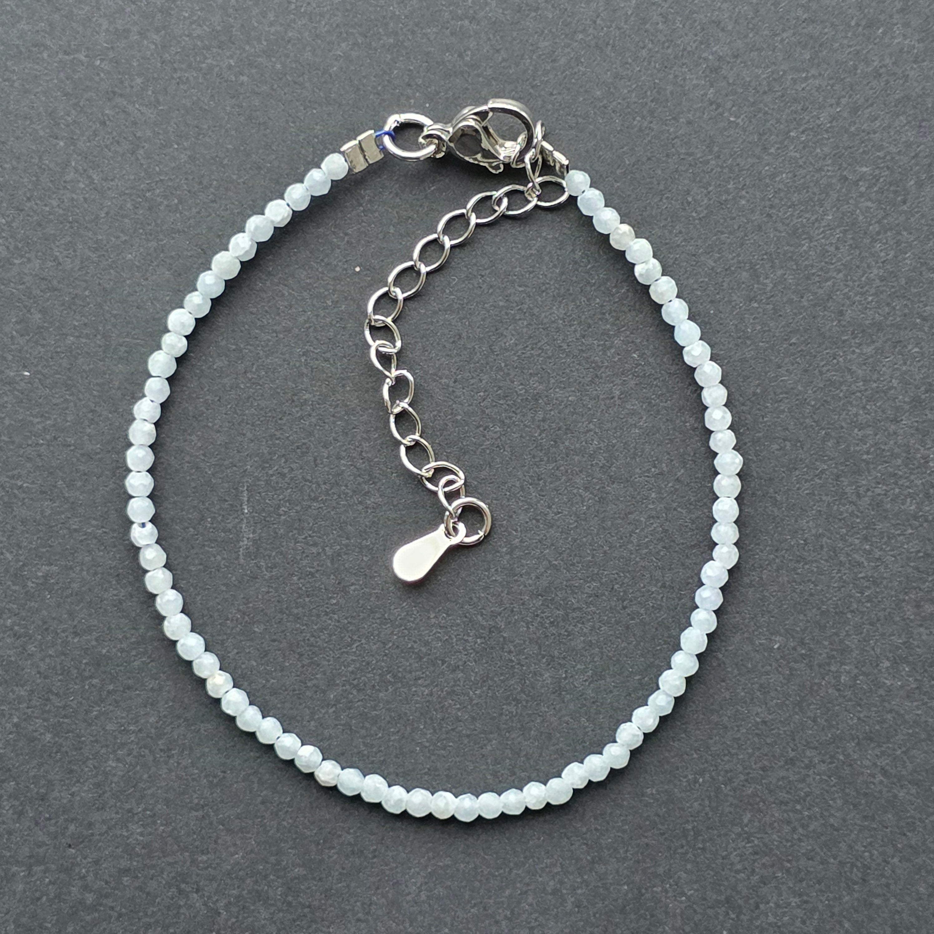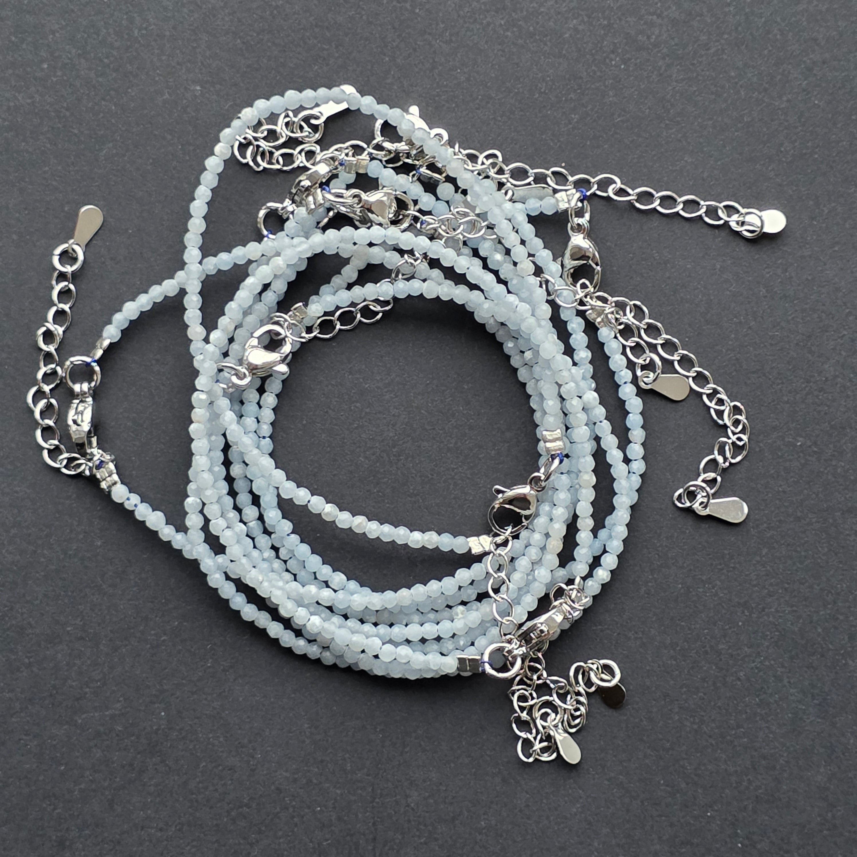 Angelitul este o piatră cu o vibrație suavă, ca o lumină filtrată prin norii dimineții. În această brățară delicată, mărgelele fațetate de 2 mm surprind nuanțe blânde de albastru, împrumutând bijuteriei o senzatie de calm, puritate și liniște interioară.