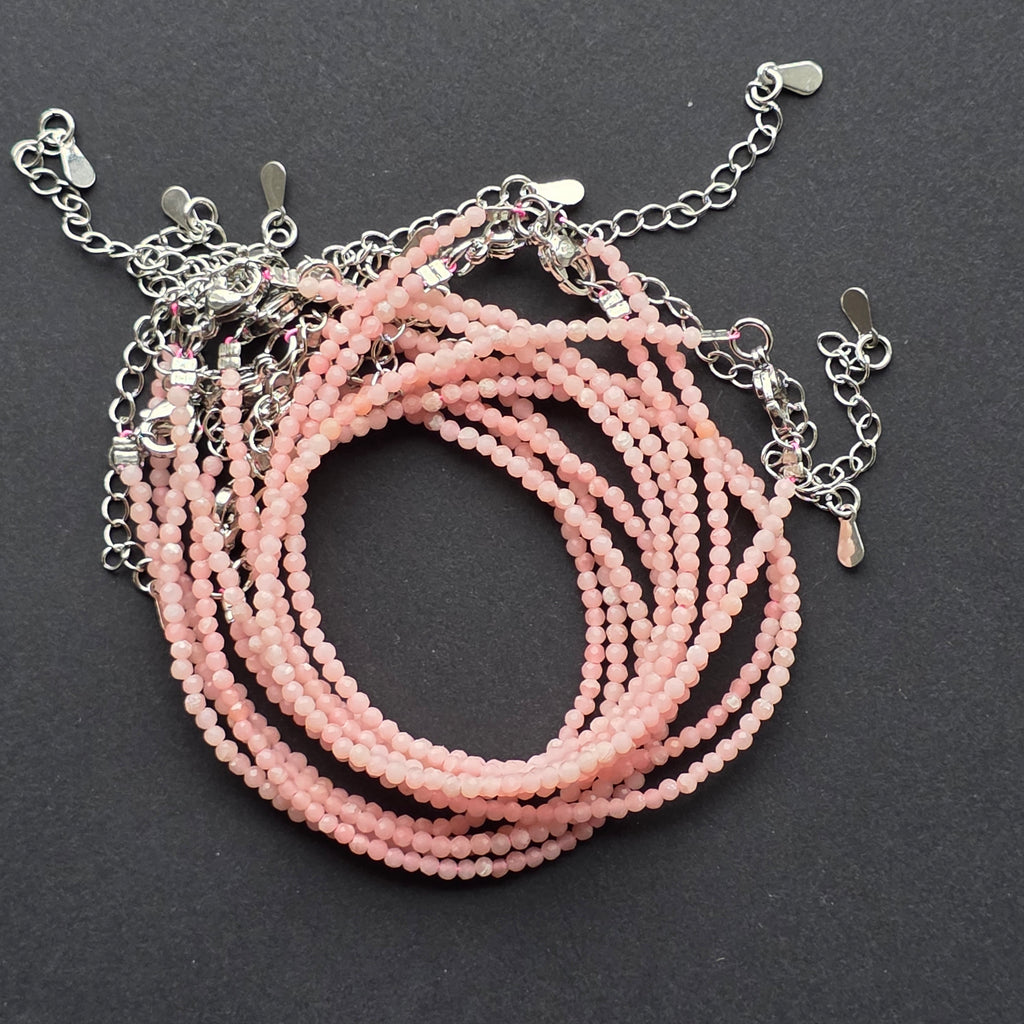Cuartul roz este una dintre cele mai îndrăgite pietre ale lumii minerale, cunoscut pentru delicatețea și lumina sa caldă. În această variantă „mix”, fiecare mărgea păstrează o nuanță ușor diferită — de la roz lapte foarte deschis până la rose pudrat sau transparent, ca reflexele unei dimineți liniștite. Cu dimensiuni fine de doar 2 mm, mărgelele fațetate surprind lumina într-un mod discret, asemenea unor picături ce pulsează cu blândețe.