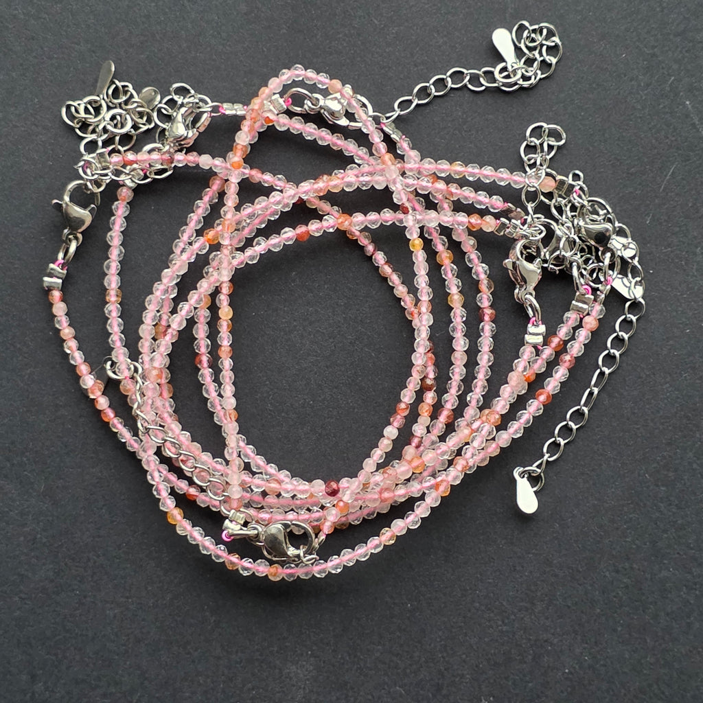 Cuartul roz este una dintre cele mai îndrăgite pietre ale lumii minerale, cunoscut pentru delicatețea și lumina sa caldă. În această variantă „mix”, fiecare mărgea păstrează o nuanță ușor diferită — de la roz lapte foarte deschis până la rose pudrat sau transparent, ca reflexele unei dimineți liniștite. Cu dimensiuni fine de doar 2 mm, mărgelele fațetate surprind lumina într-un mod discret, asemenea unor picături ce pulsează cu blândețe.