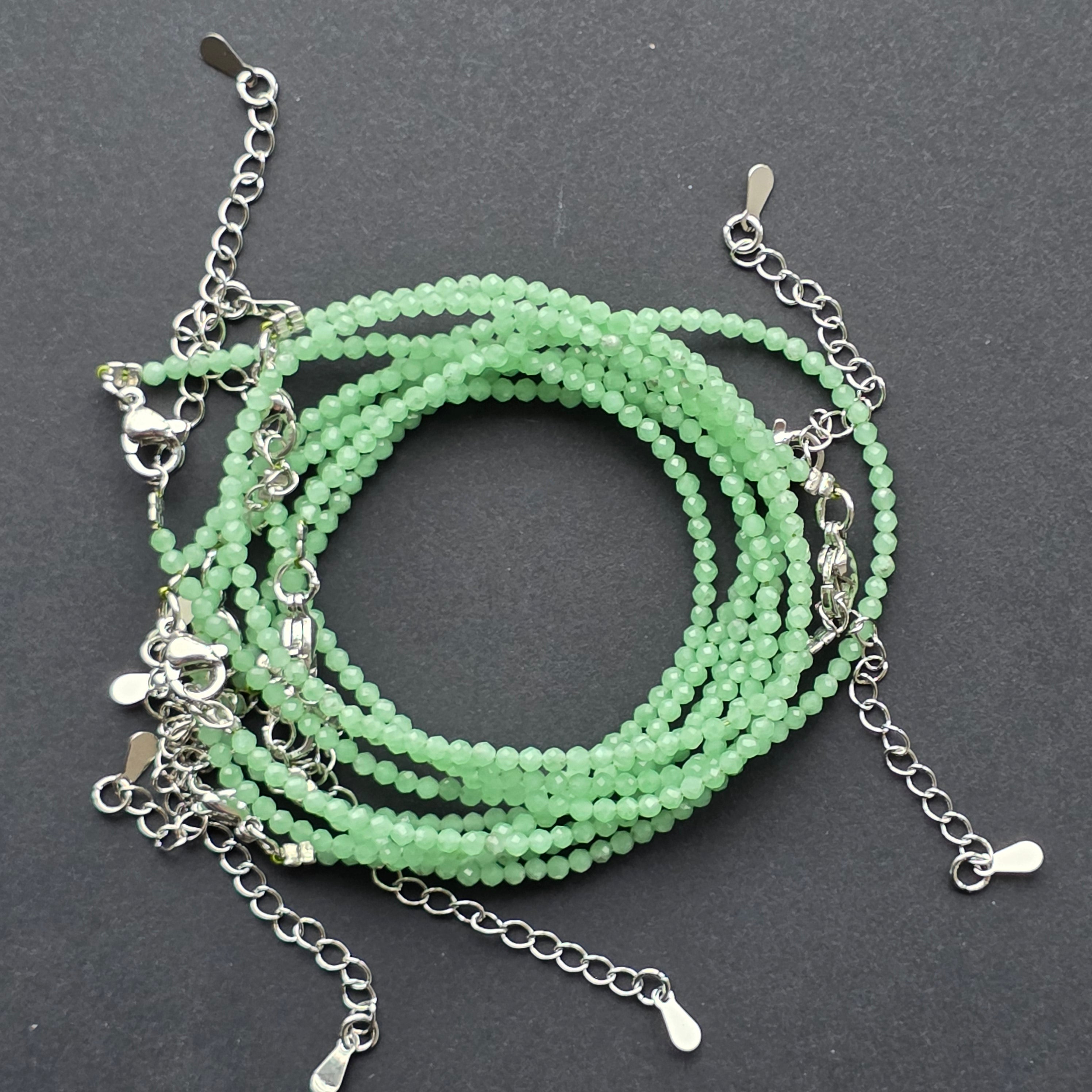 O brățară delicată, senină, construită din mărgele fine de jad new — o piatră atât de luminoasă încât pare să păstreze în ea o respirație de primăvară. Fațetele minuscule ale mărgelelor de 2 mm surprind lumina într-un joc subtil, aproape imperceptibil, ca o strălucire interioară care nu caută să impresioneze, ci să liniștească.