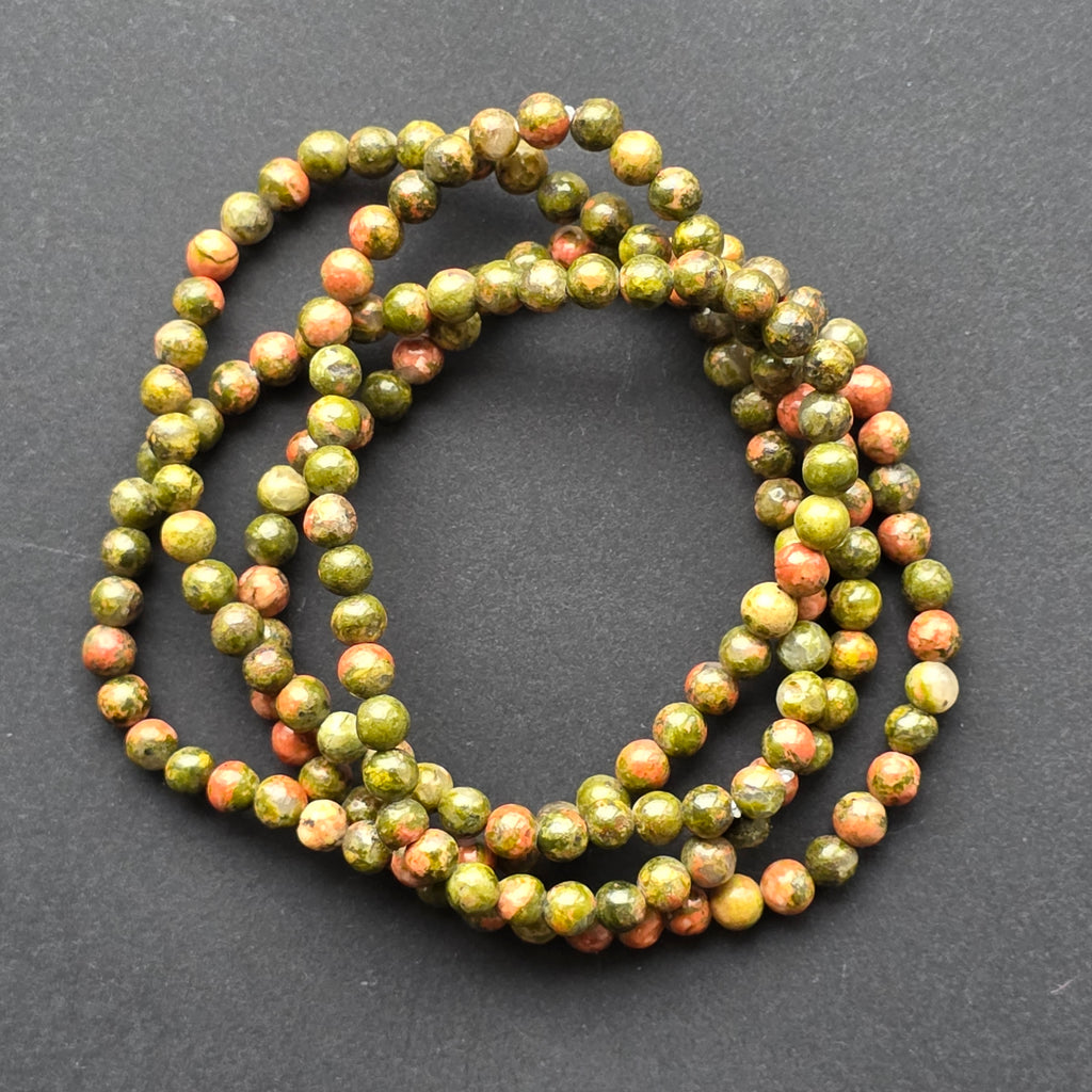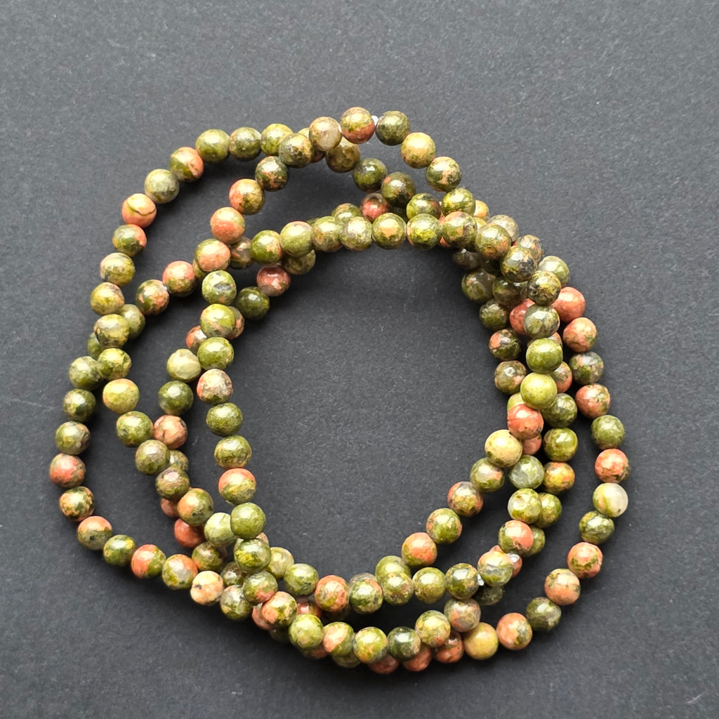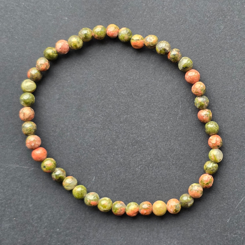 Brățara din unakit este o armonie subtilă între două culori ale naturii: verdele organic, calm și rotunjit, și tonurile cărămizii ale feldspatului roz-oranj, care par să lumineze fiecare mărgea. Împreună, creează o textură mozaicată, autentică, foarte ușor de recunoscut și îndrăgită de colecționarii de pietre naturale.