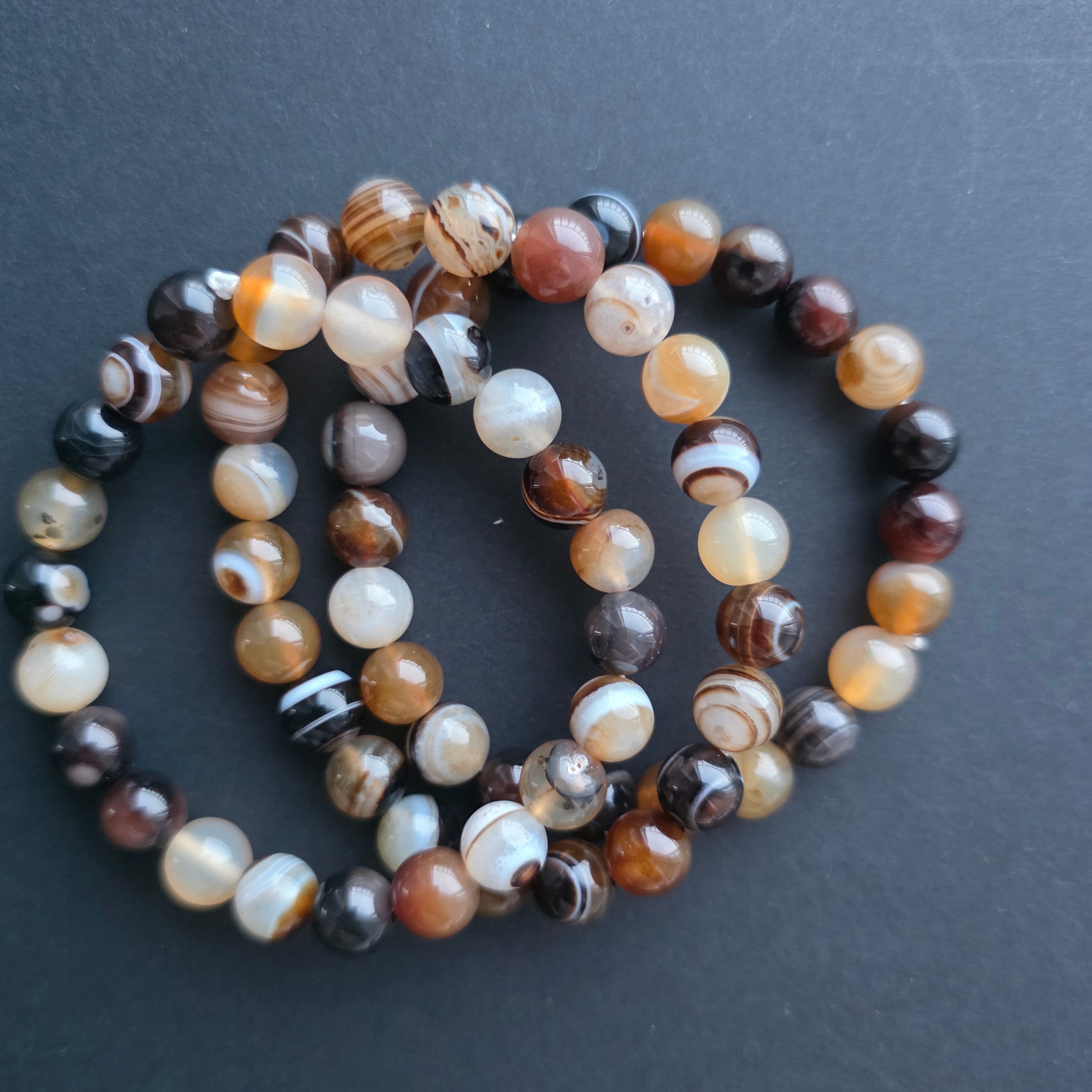 Texture: shiny surface, solid beads, with natural patterns and bands typical of agate
