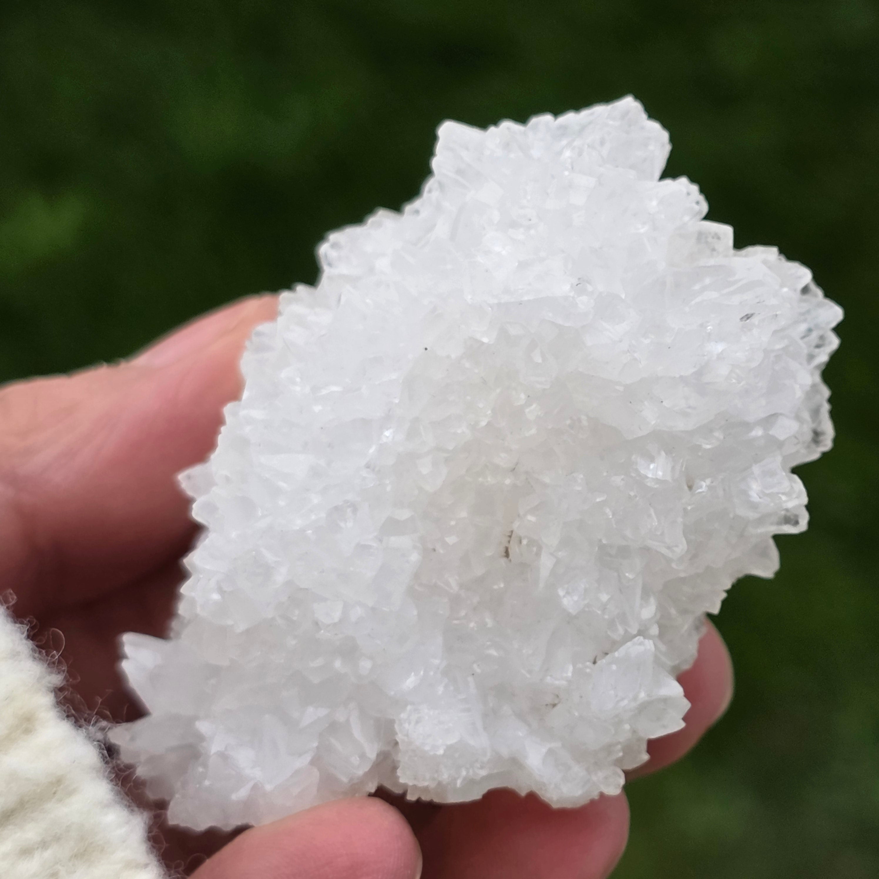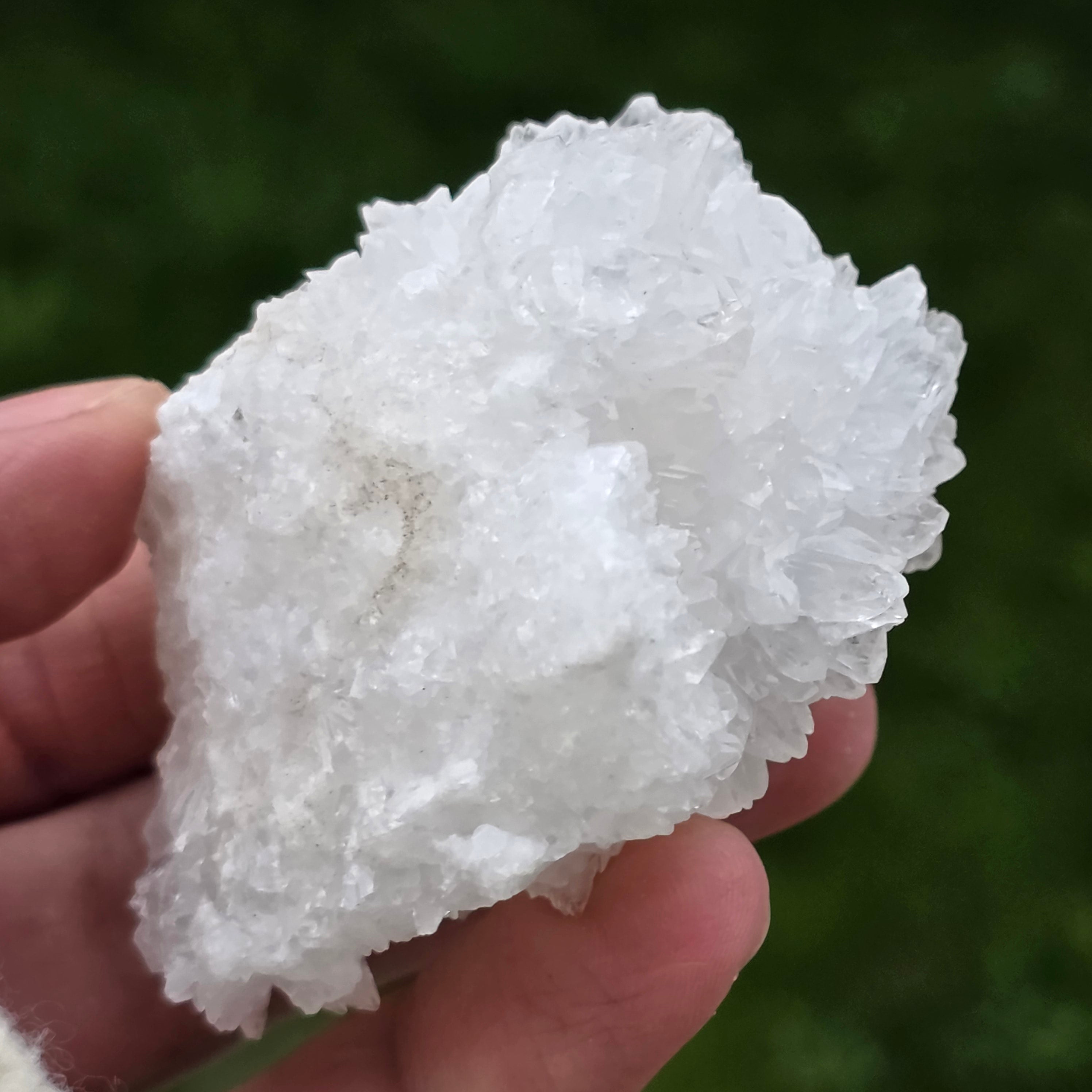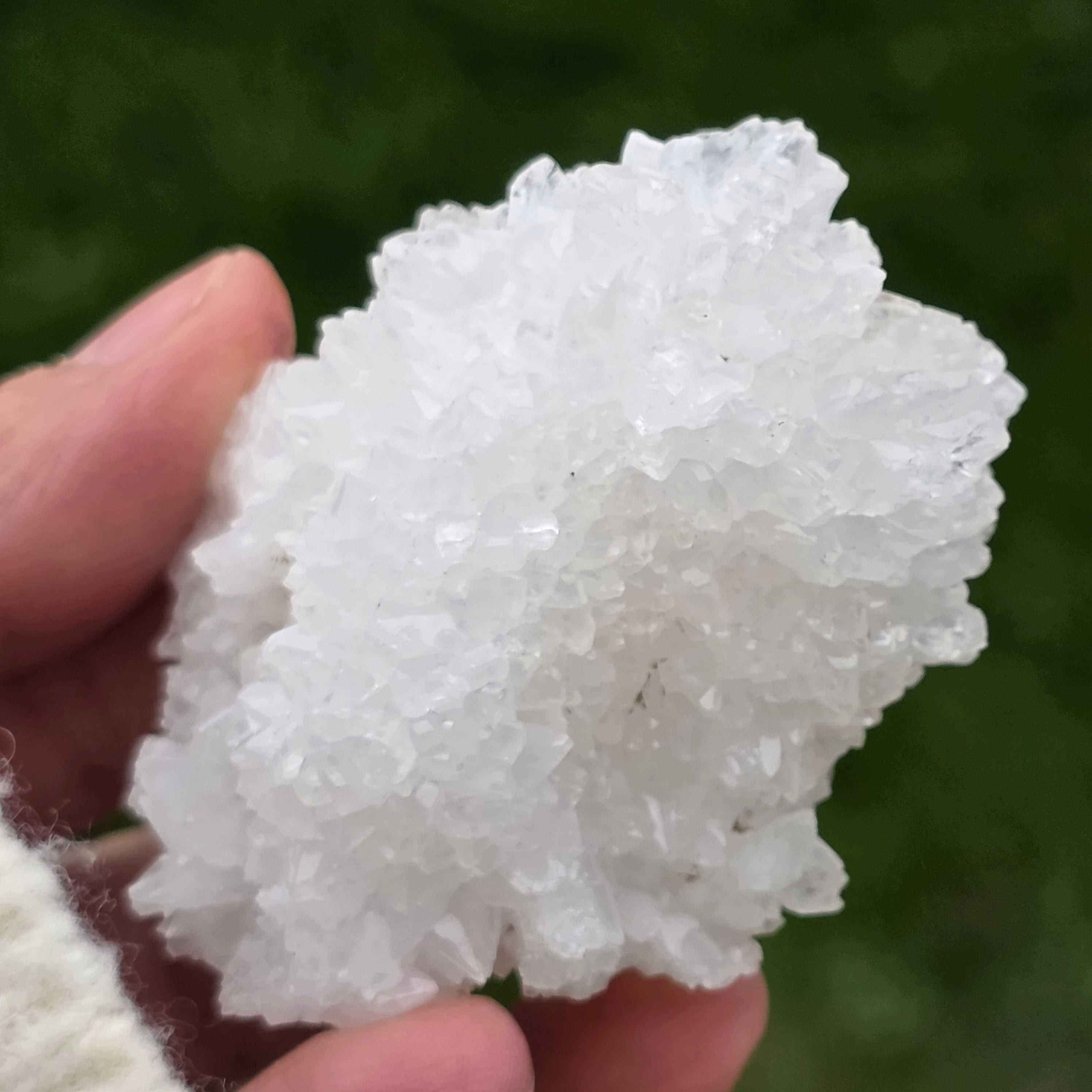 Cristalele sunt dispuse în structuri neregulate, rotunjite, cu suprafețe ușor sclipitoare, amintind de formațiuni întâlnite în interiorul peșterilor. Textura bogată și volumul bine definit conferă fiecărui exemplar un caracter autentic și expresiv, foarte apreciat în colecțiile de minerale și ca piesă decorativă naturală.