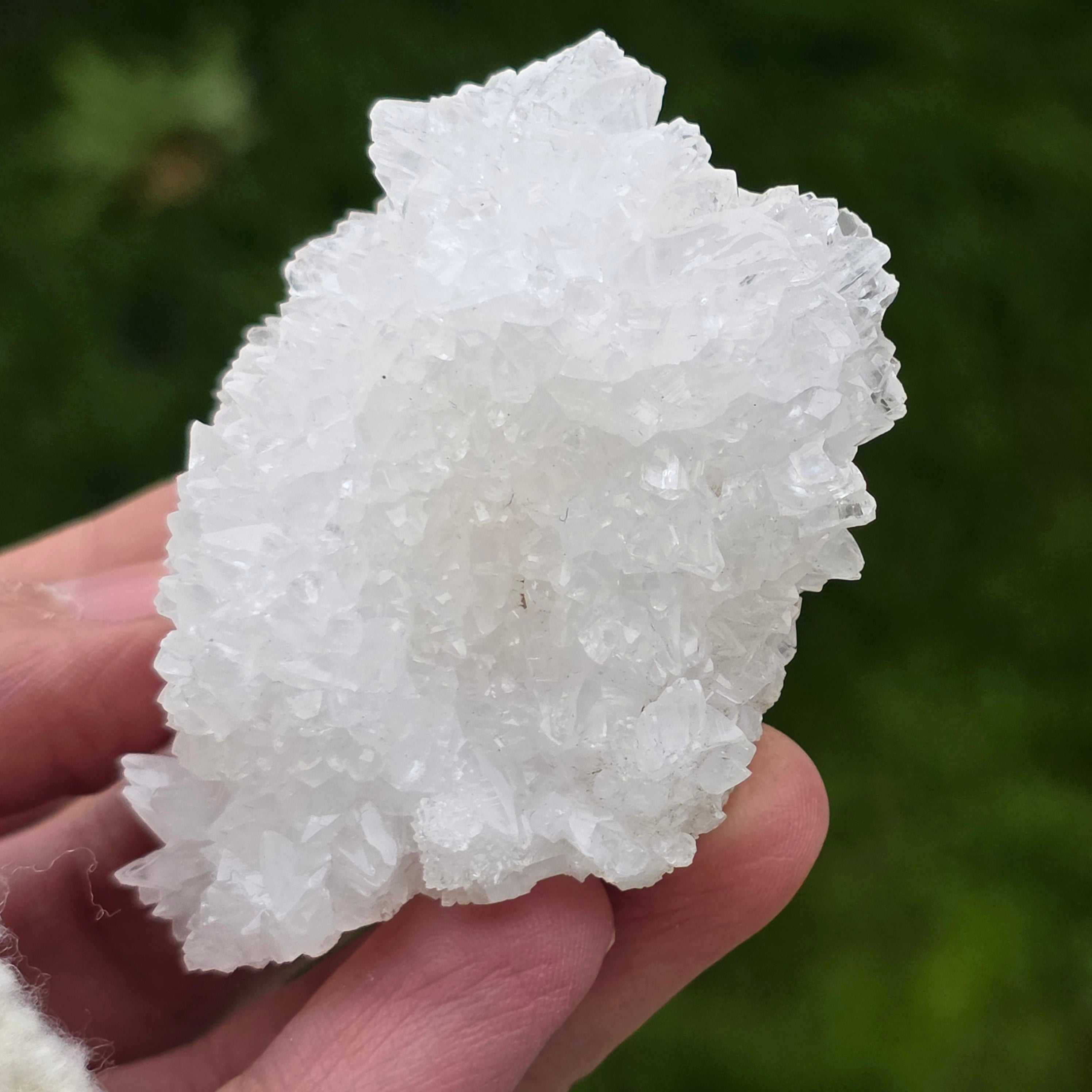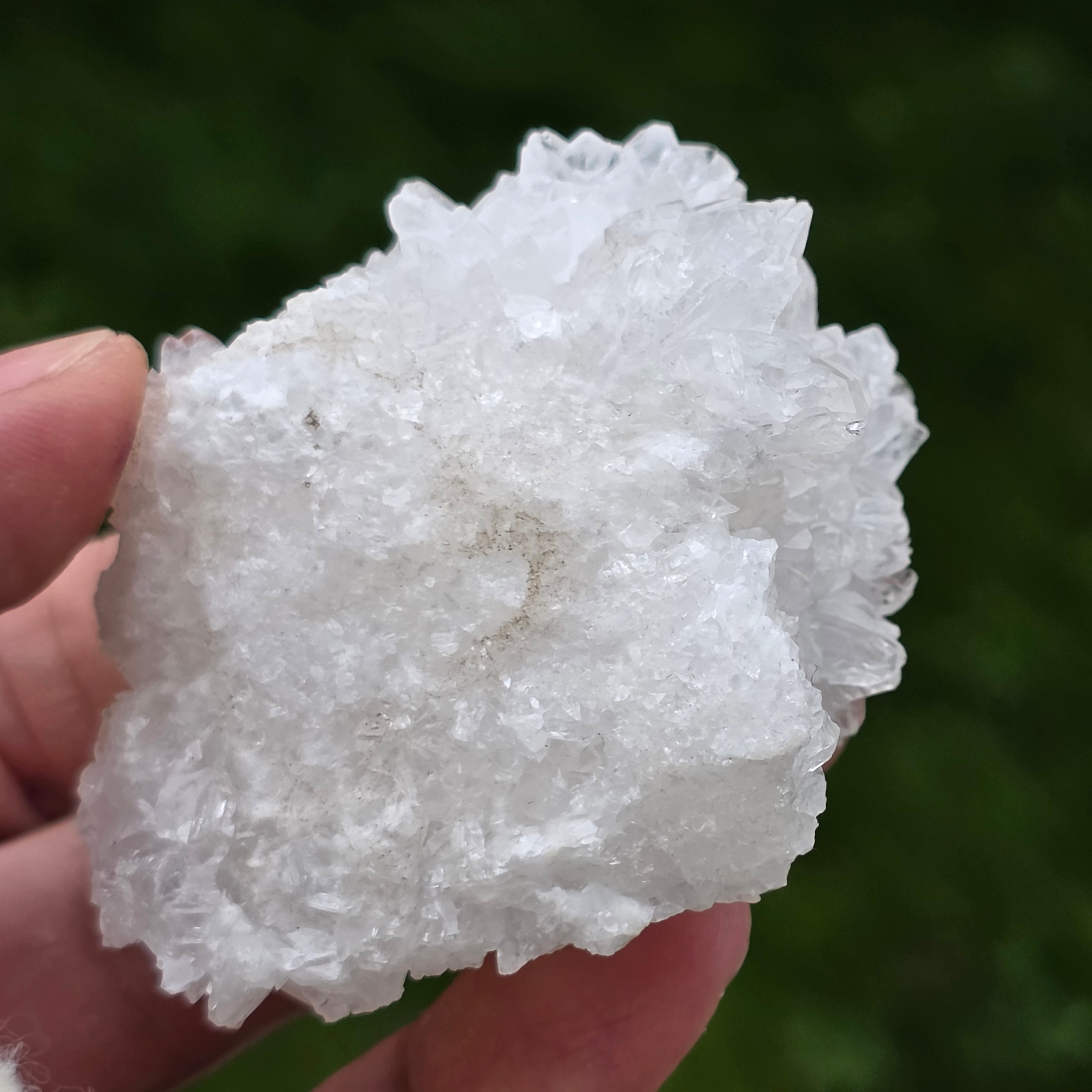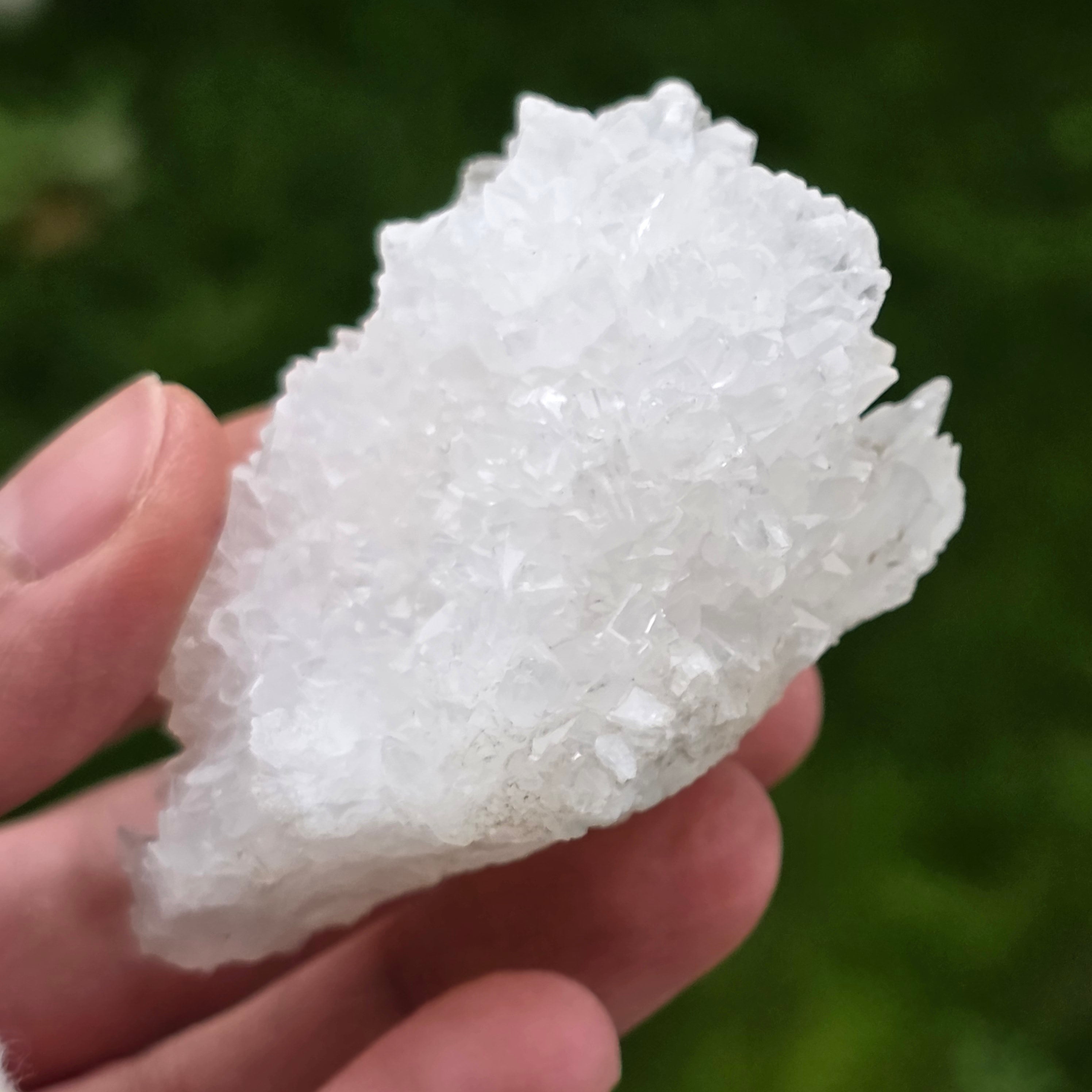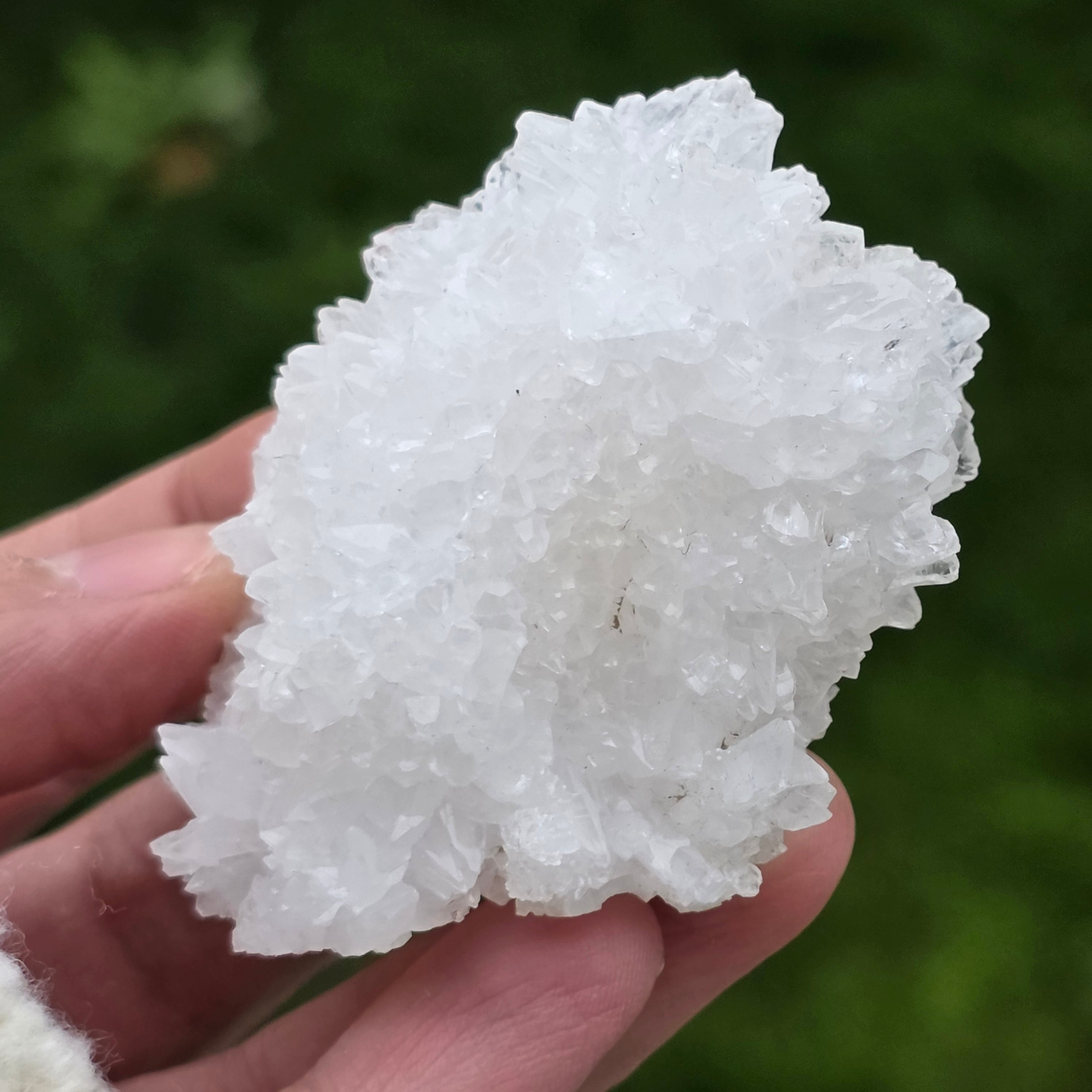 Cristalele sunt dispuse în structuri neregulate, rotunjite, cu suprafețe ușor sclipitoare, amintind de formațiuni întâlnite în interiorul peșterilor. Textura bogată și volumul bine definit conferă fiecărui exemplar un caracter autentic și expresiv, foarte apreciat în colecțiile de minerale și ca piesă decorativă naturală.