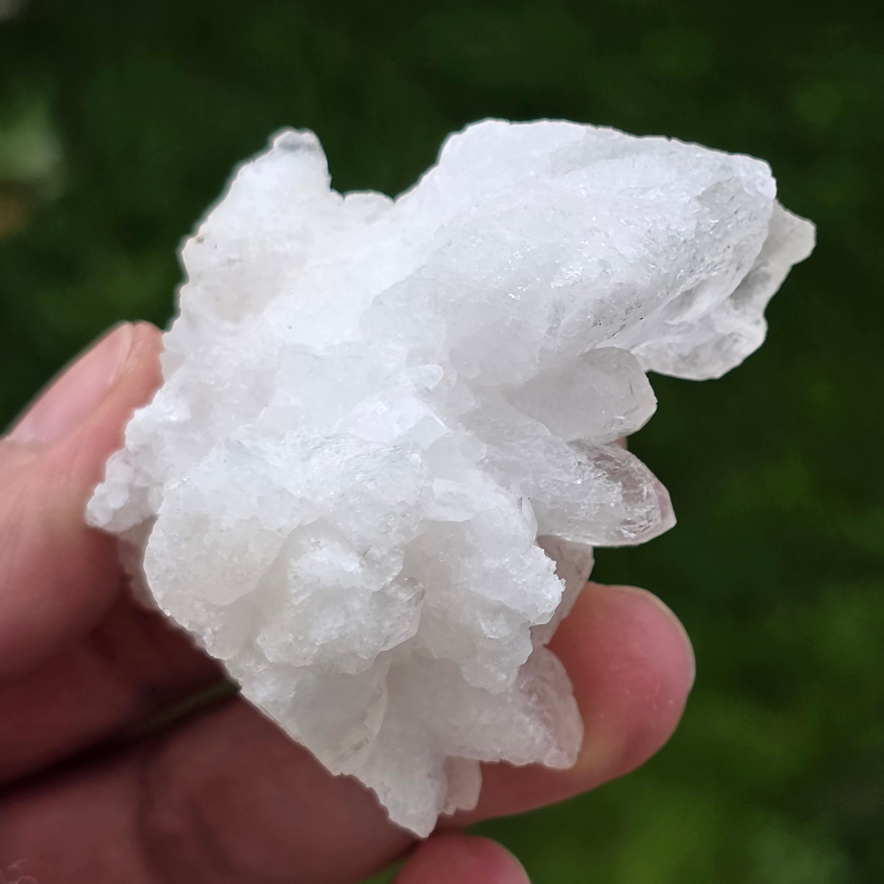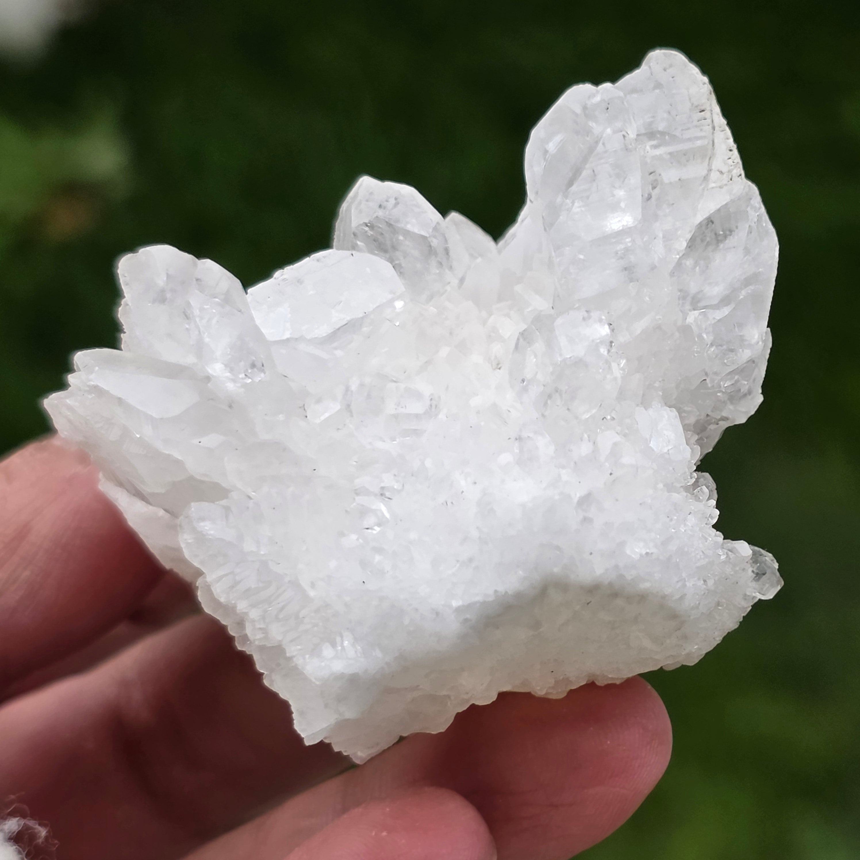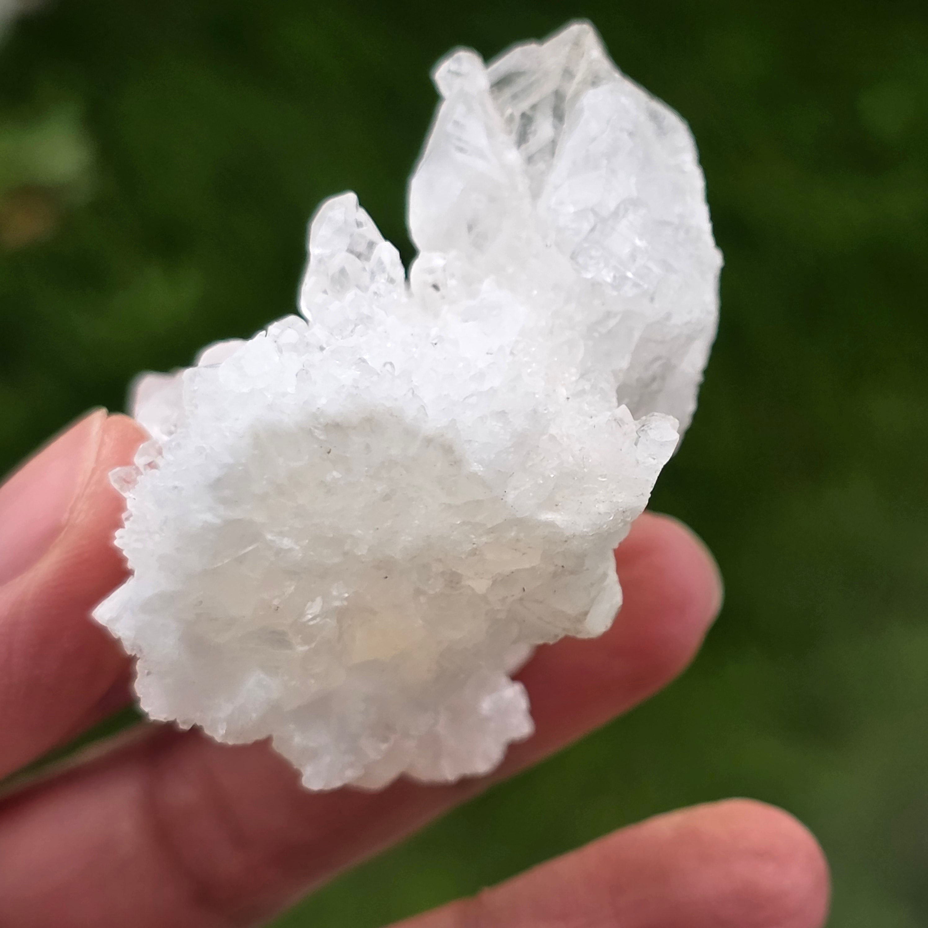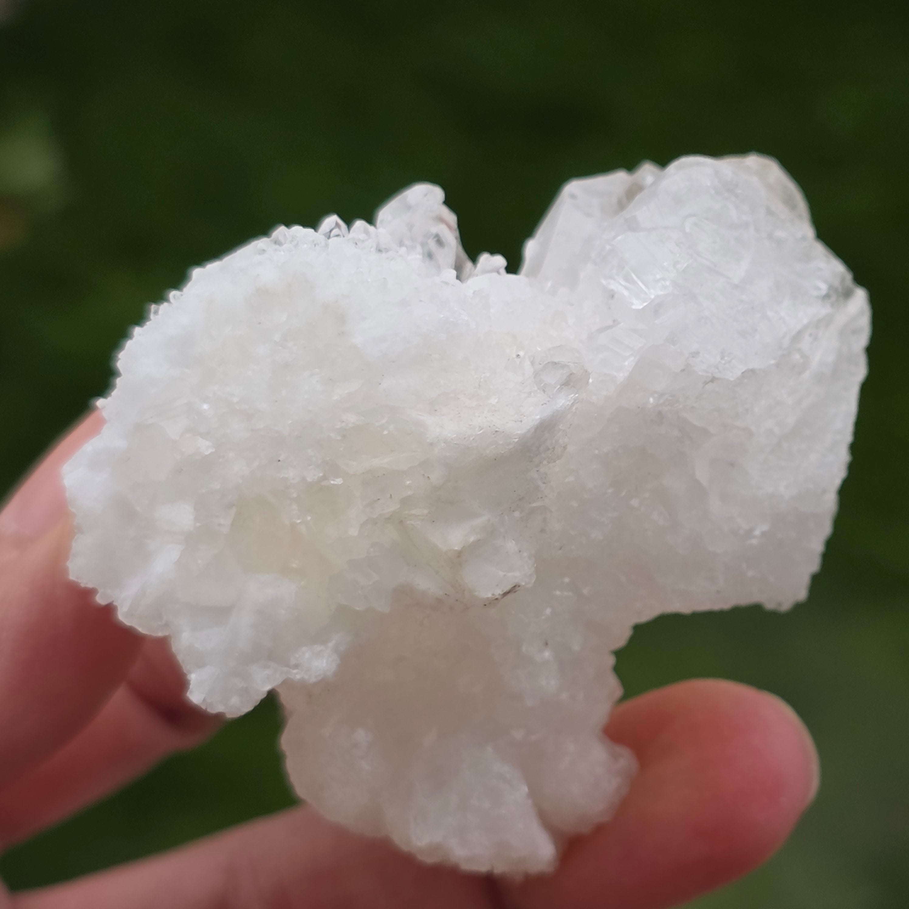 Cristalele sunt dispuse în structuri neregulate, rotunjite, cu suprafețe ușor sclipitoare, amintind de formațiuni întâlnite în interiorul peșterilor. Textura bogată și volumul bine definit conferă fiecărui exemplar un caracter autentic și expresiv, foarte apreciat în colecțiile de minerale și ca piesă decorativă naturală.