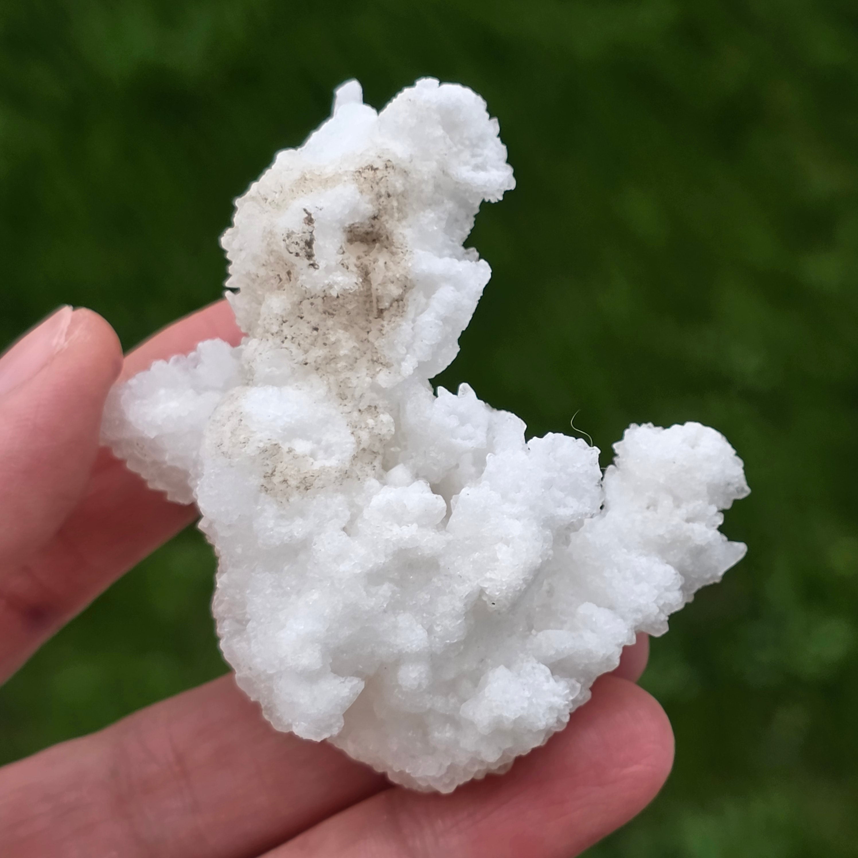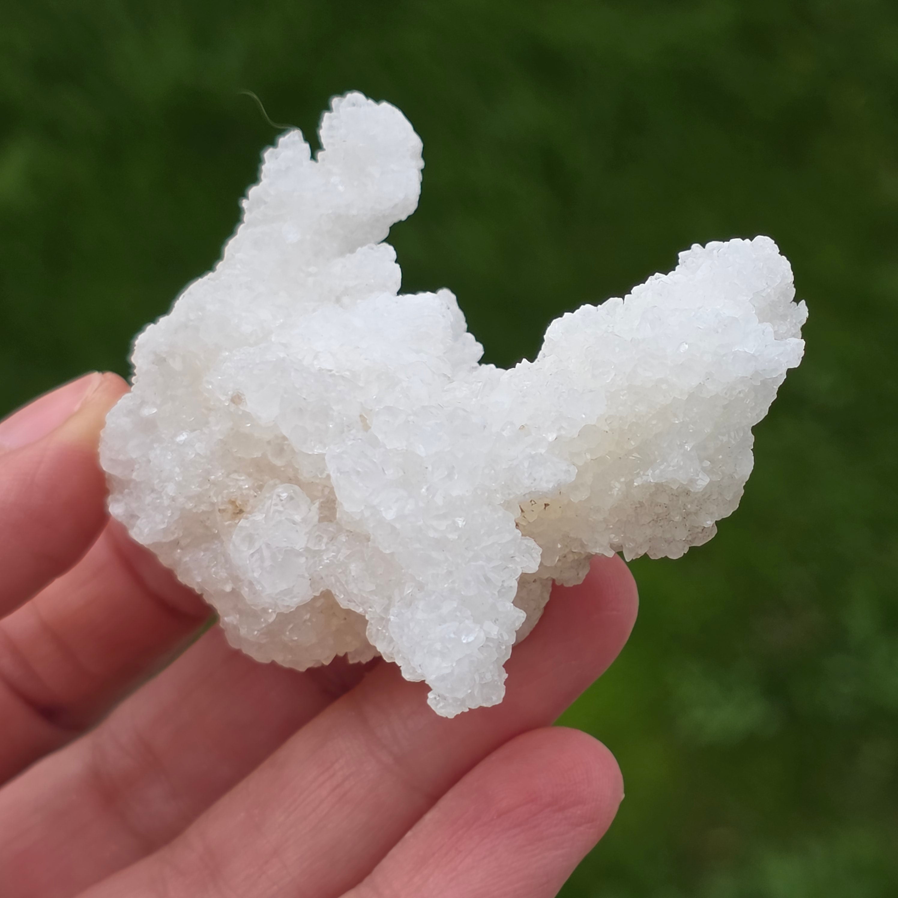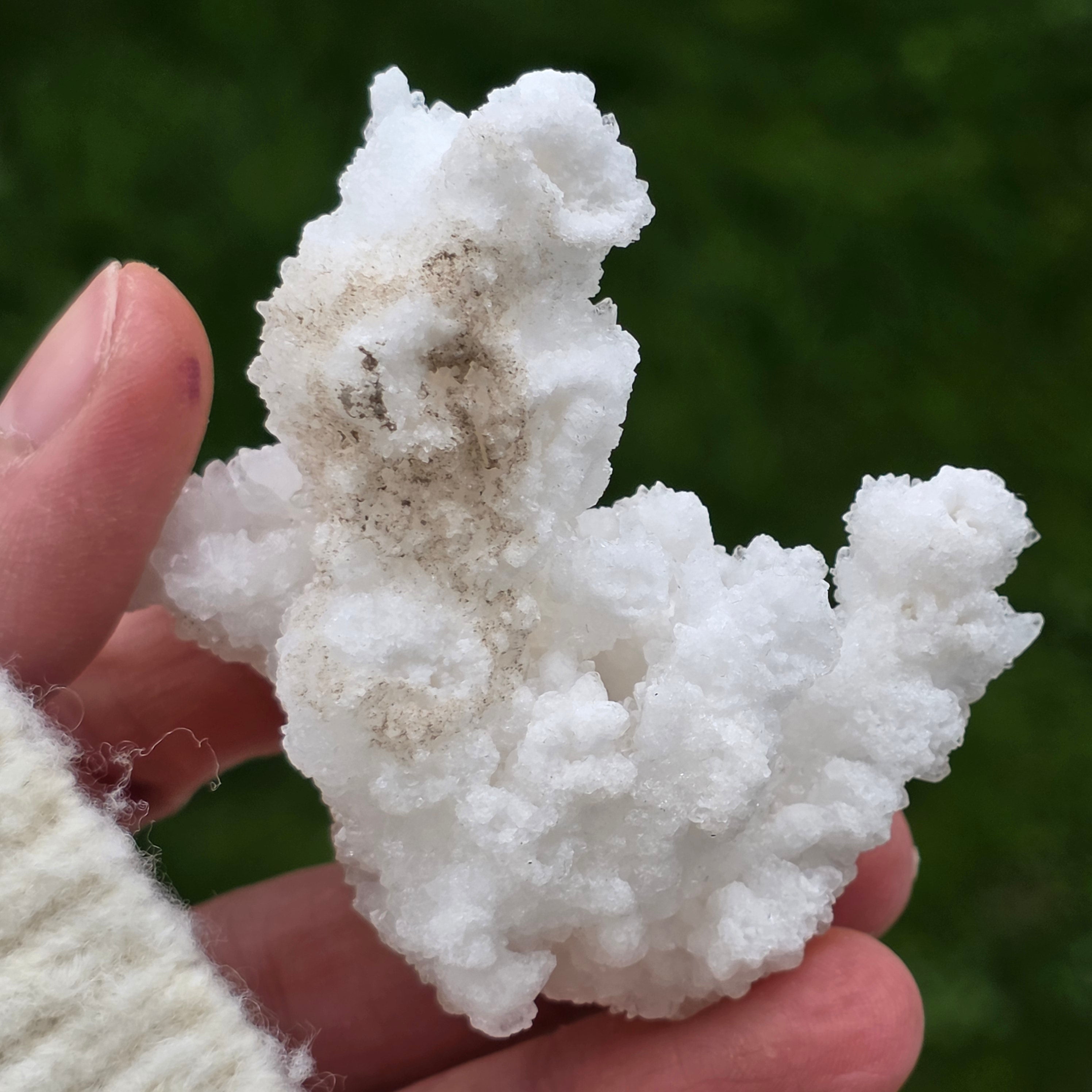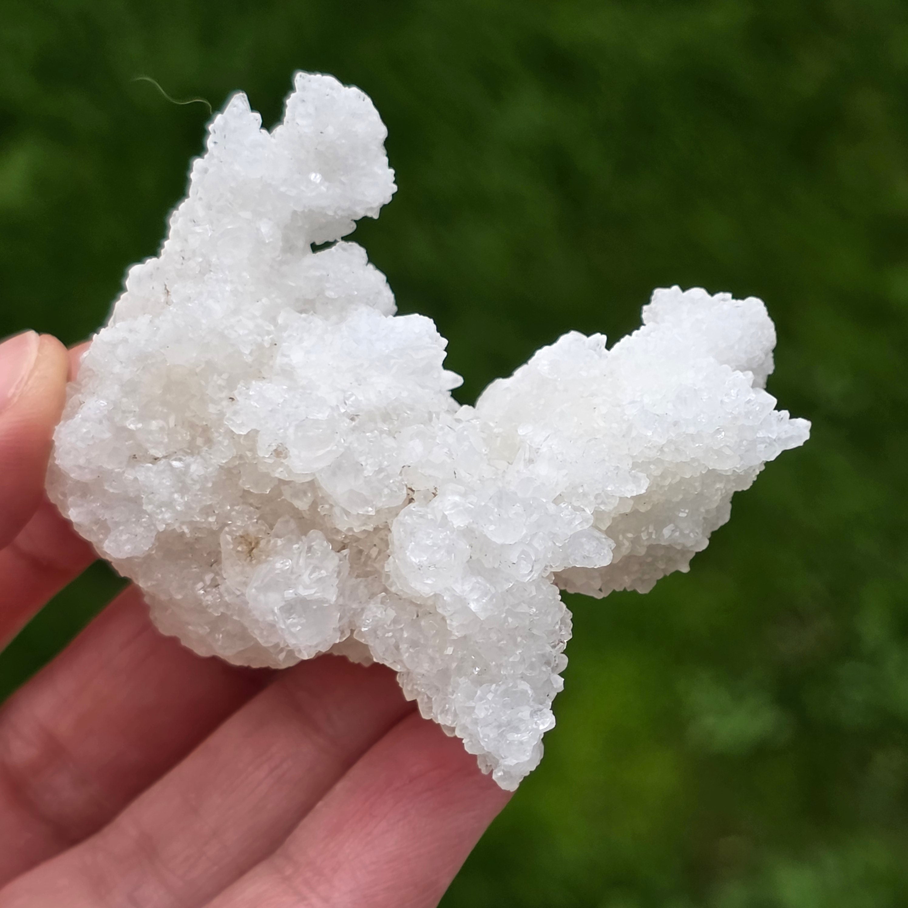 Cristalele sunt dispuse în structuri neregulate, rotunjite, cu suprafețe ușor sclipitoare, amintind de formațiuni întâlnite în interiorul peșterilor. Textura bogată și volumul bine definit conferă fiecărui exemplar un caracter autentic și expresiv, foarte apreciat în colecțiile de minerale și ca piesă decorativă naturală.
