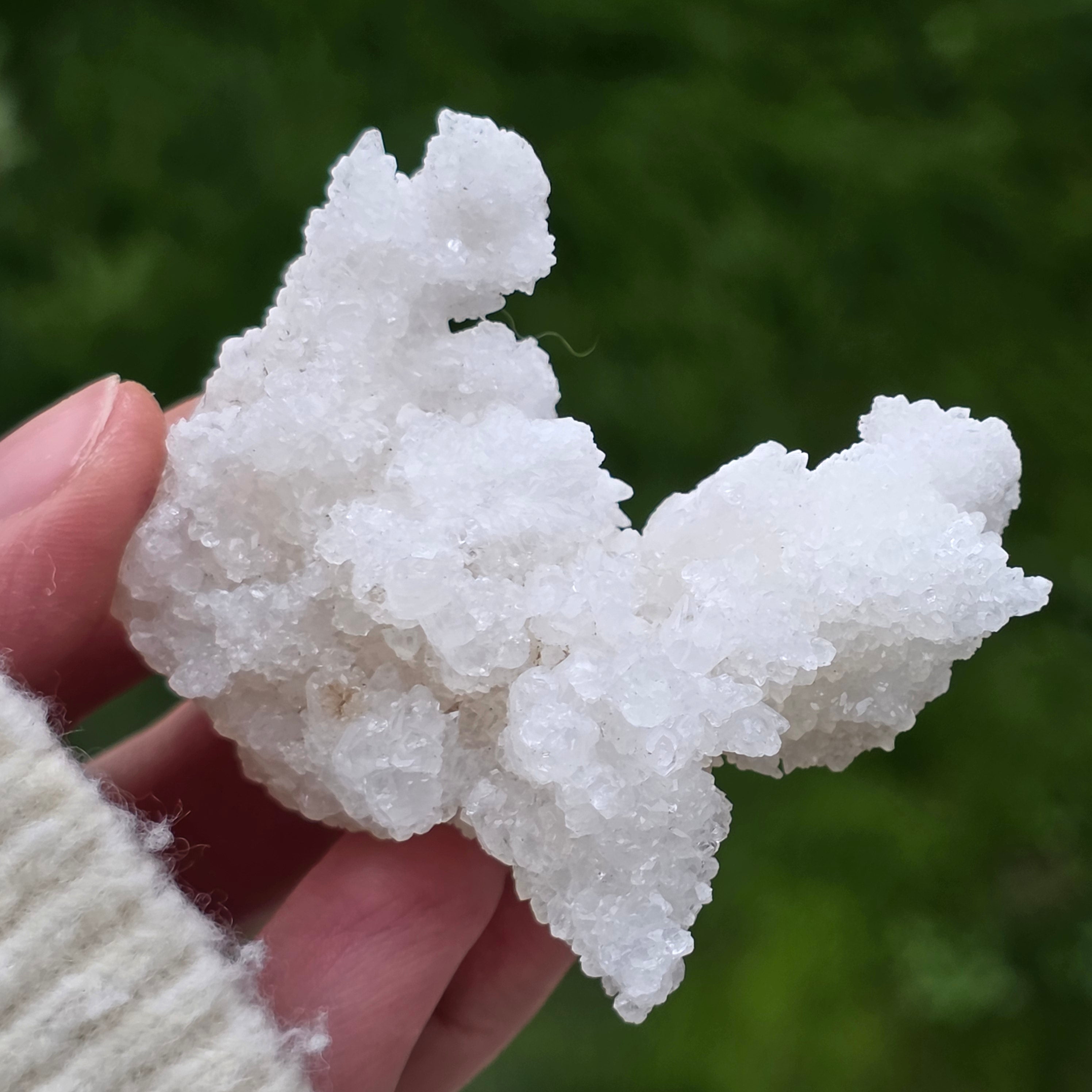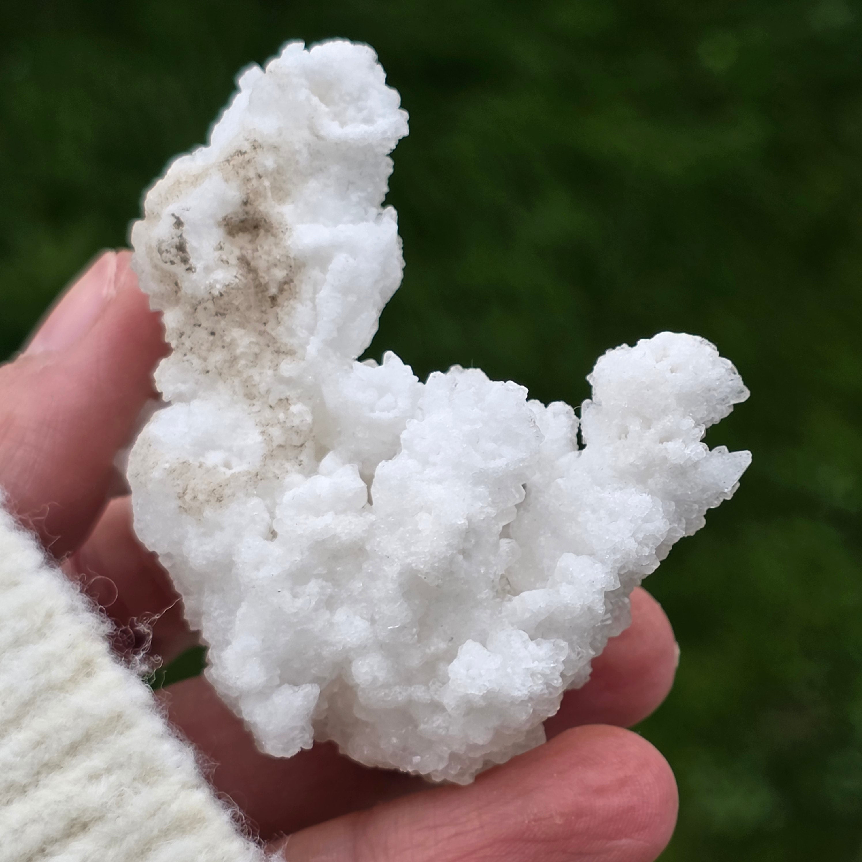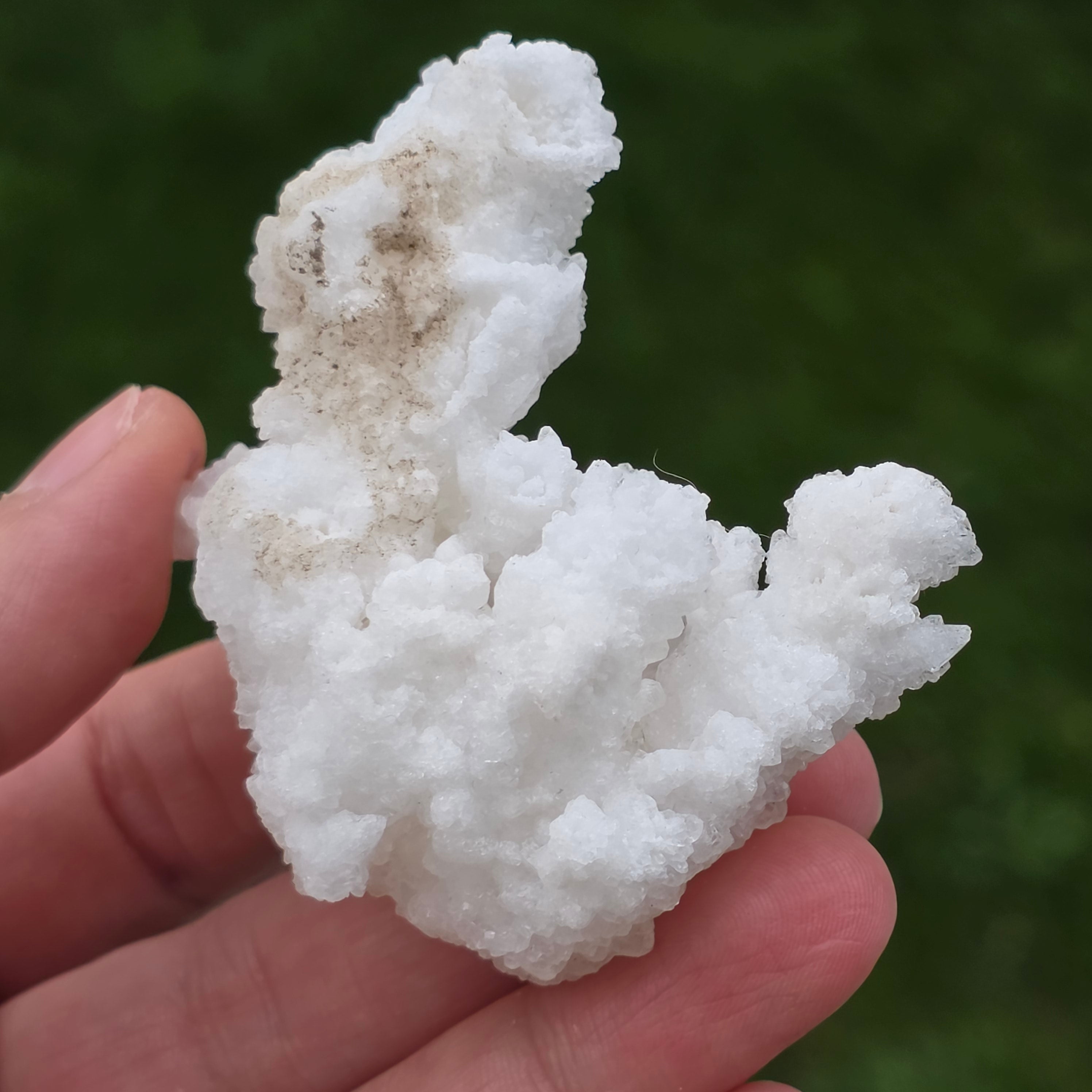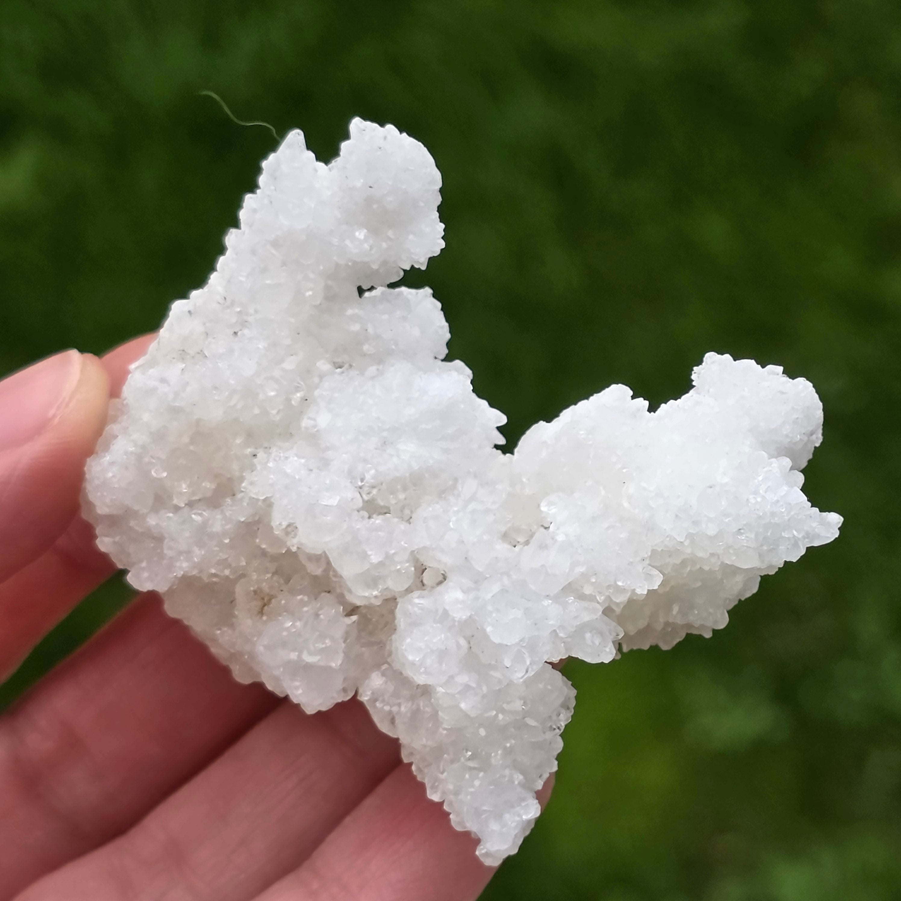 Cristalele sunt dispuse în structuri neregulate, rotunjite, cu suprafețe ușor sclipitoare, amintind de formațiuni întâlnite în interiorul peșterilor. Textura bogată și volumul bine definit conferă fiecărui exemplar un caracter autentic și expresiv, foarte apreciat în colecțiile de minerale și ca piesă decorativă naturală.