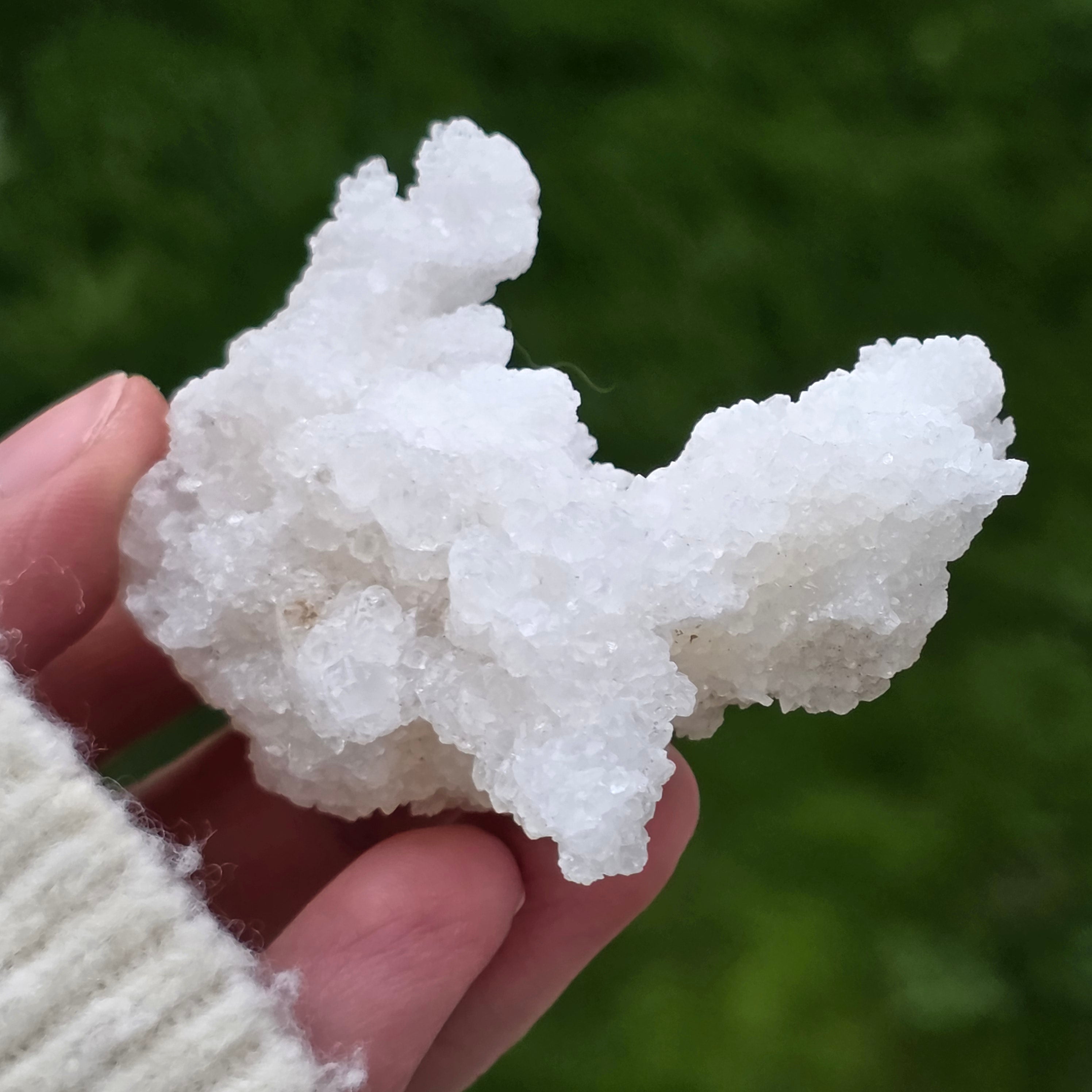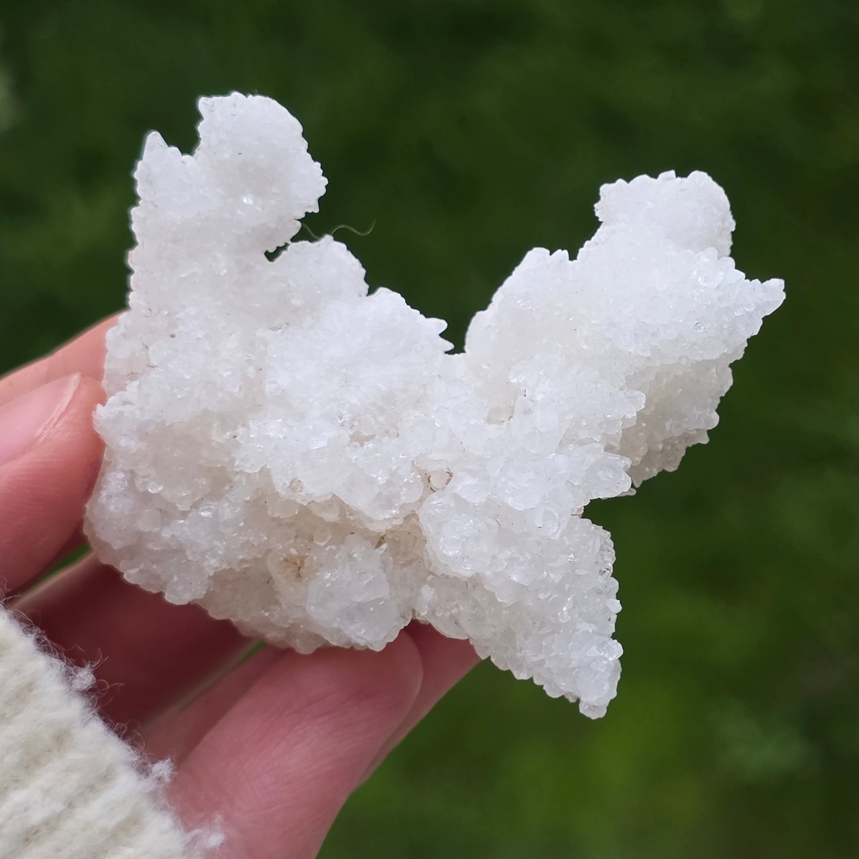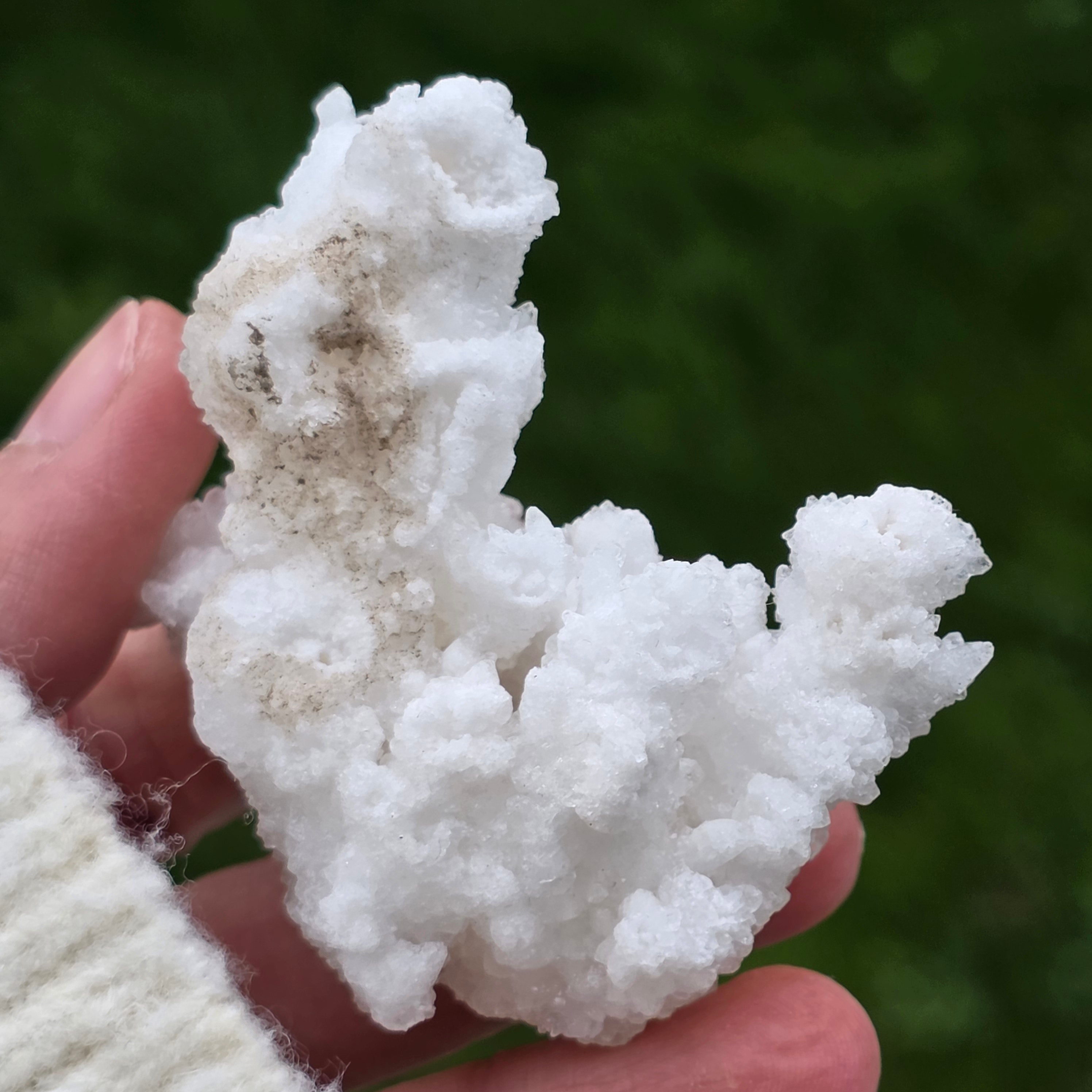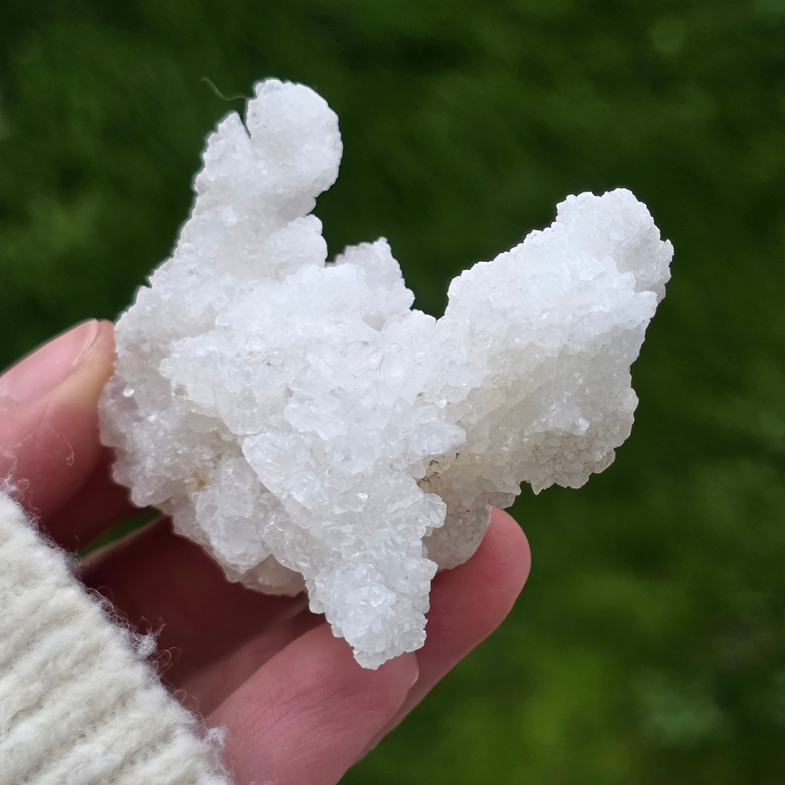 Cristalele sunt dispuse în structuri neregulate, rotunjite, cu suprafețe ușor sclipitoare, amintind de formațiuni întâlnite în interiorul peșterilor. Textura bogată și volumul bine definit conferă fiecărui exemplar un caracter autentic și expresiv, foarte apreciat în colecțiile de minerale și ca piesă decorativă naturală.