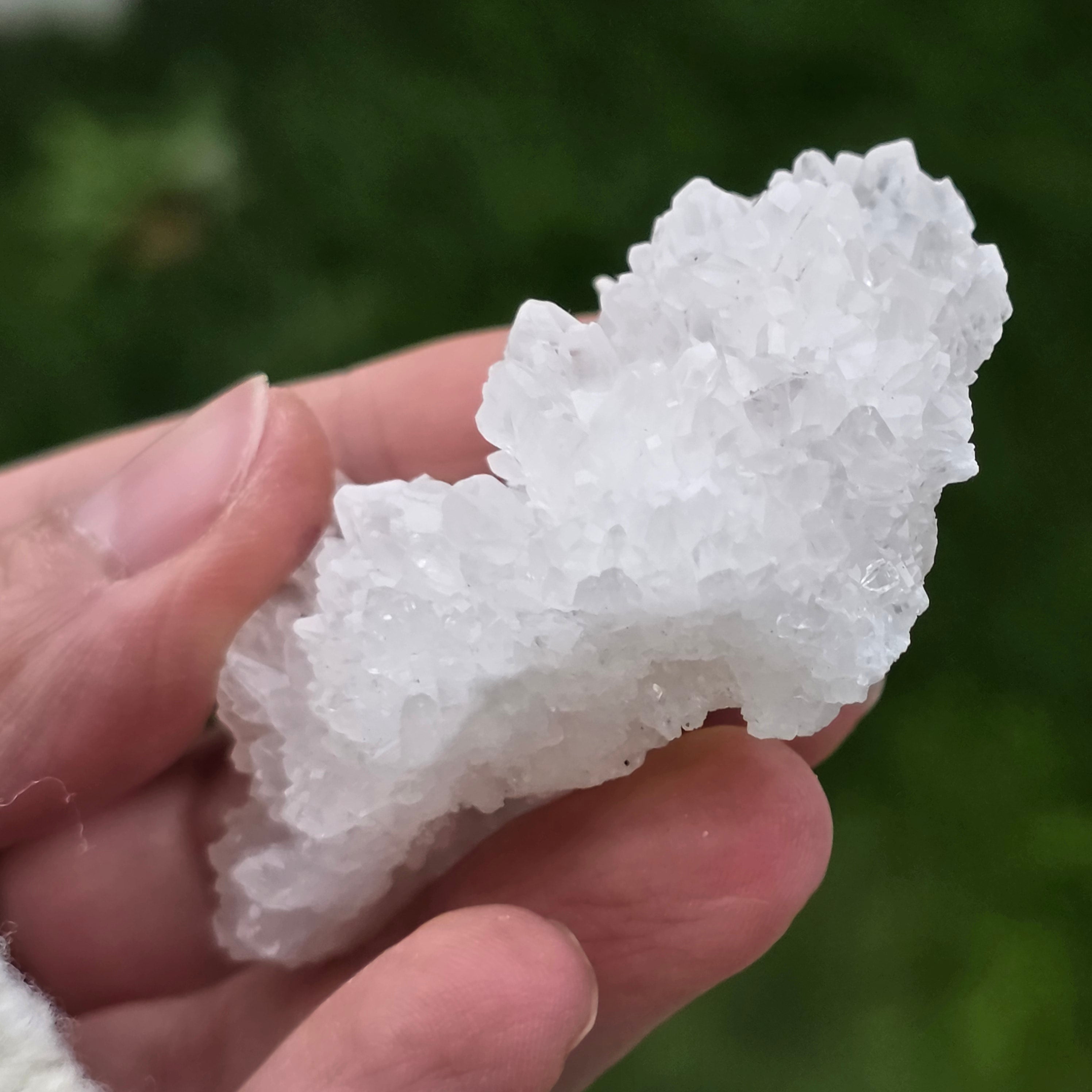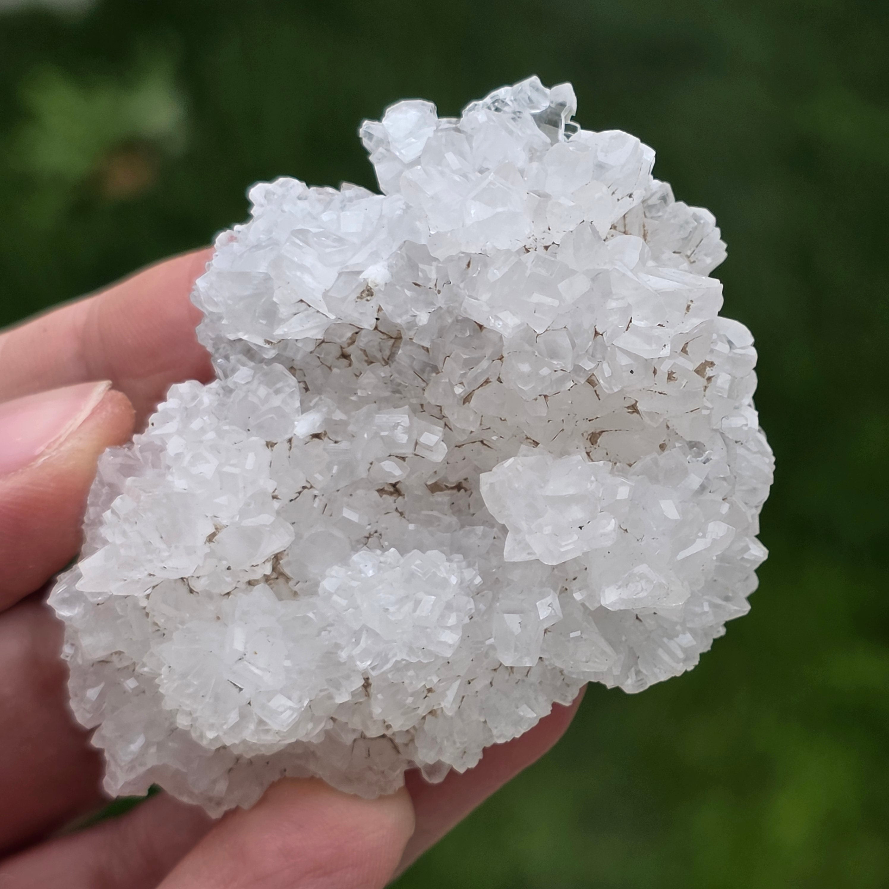 Cristalele sunt dispuse în structuri neregulate, rotunjite, cu suprafețe ușor sclipitoare, amintind de formațiuni întâlnite în interiorul peșterilor. Textura bogată și volumul bine definit conferă fiecărui exemplar un caracter autentic și expresiv, foarte apreciat în colecțiile de minerale și ca piesă decorativă naturală.