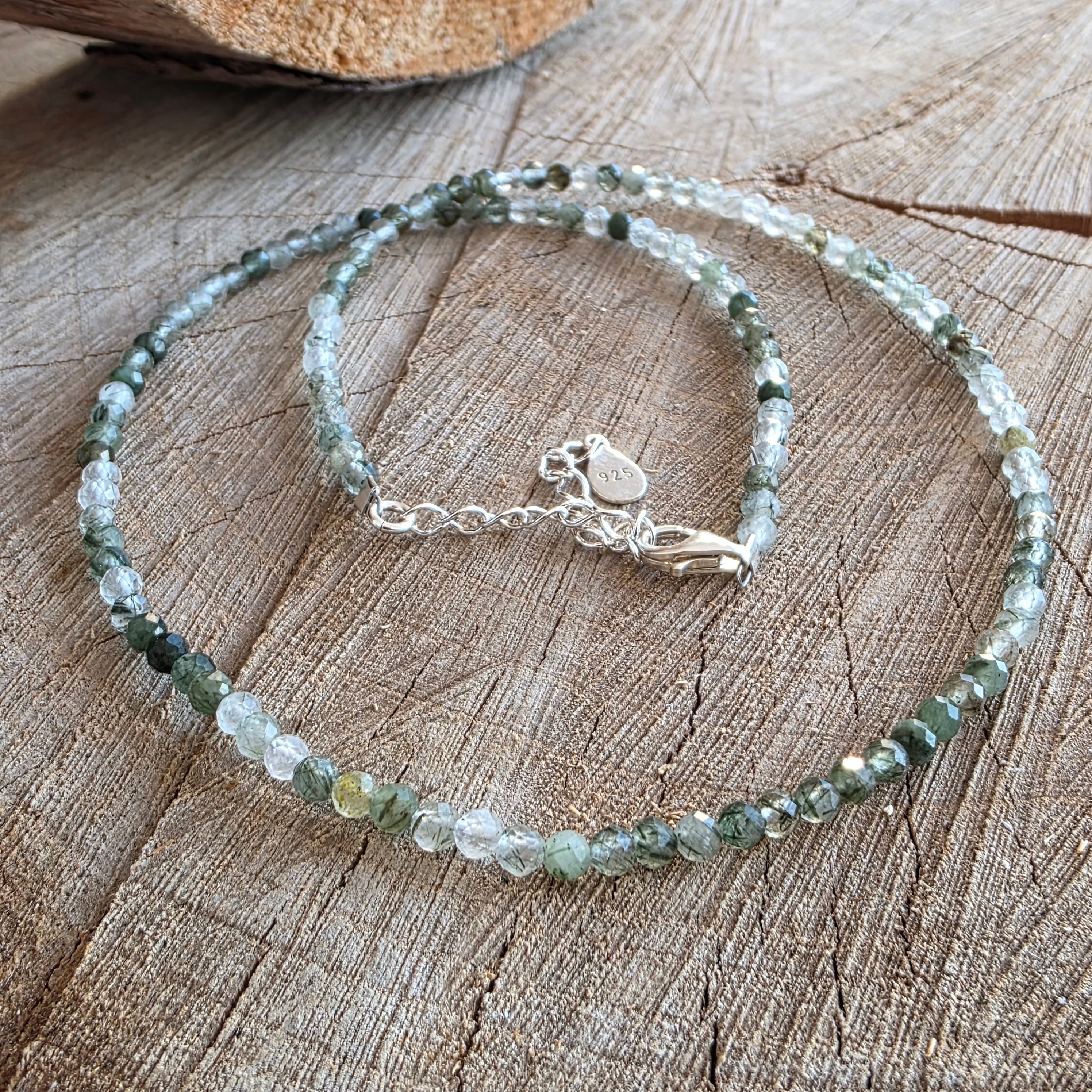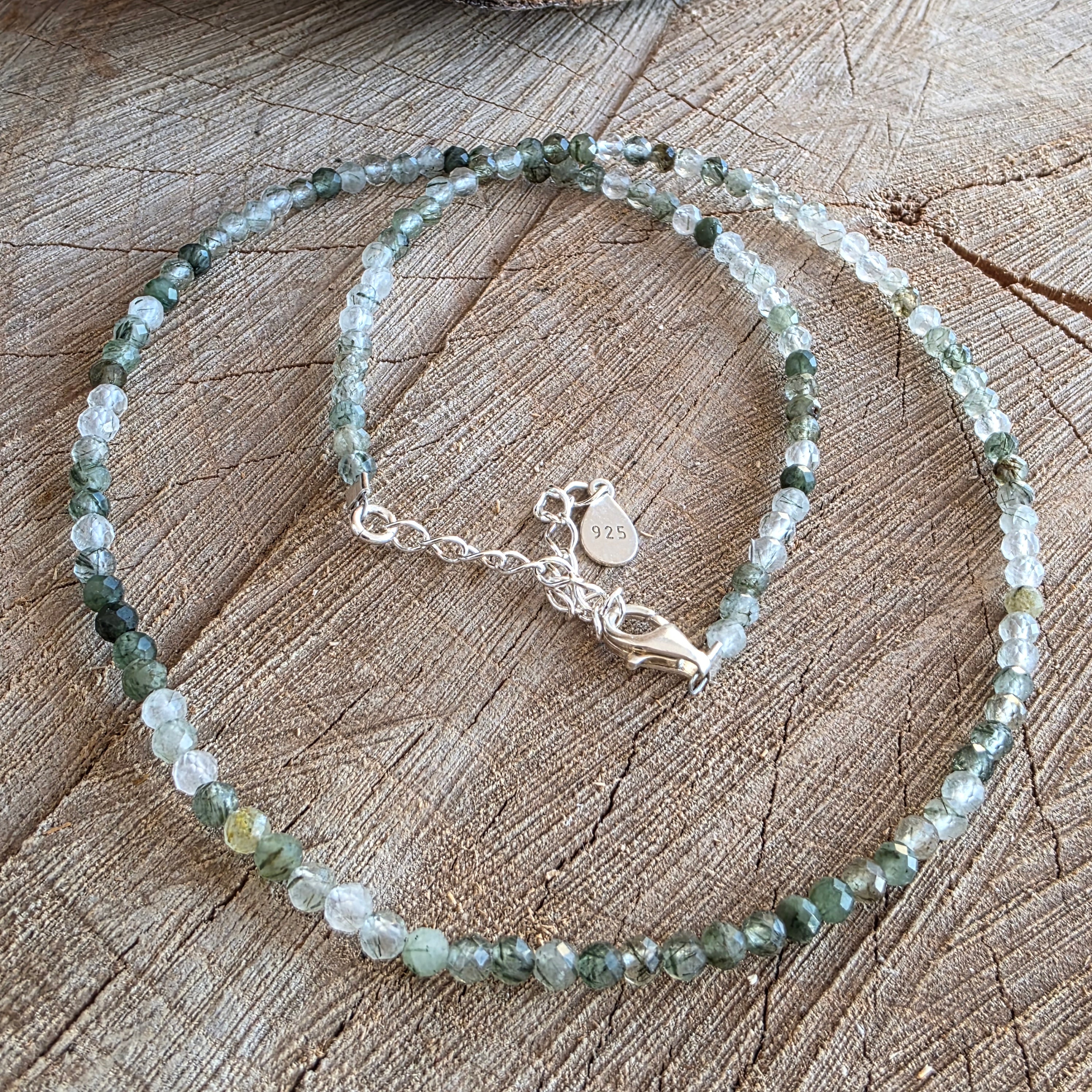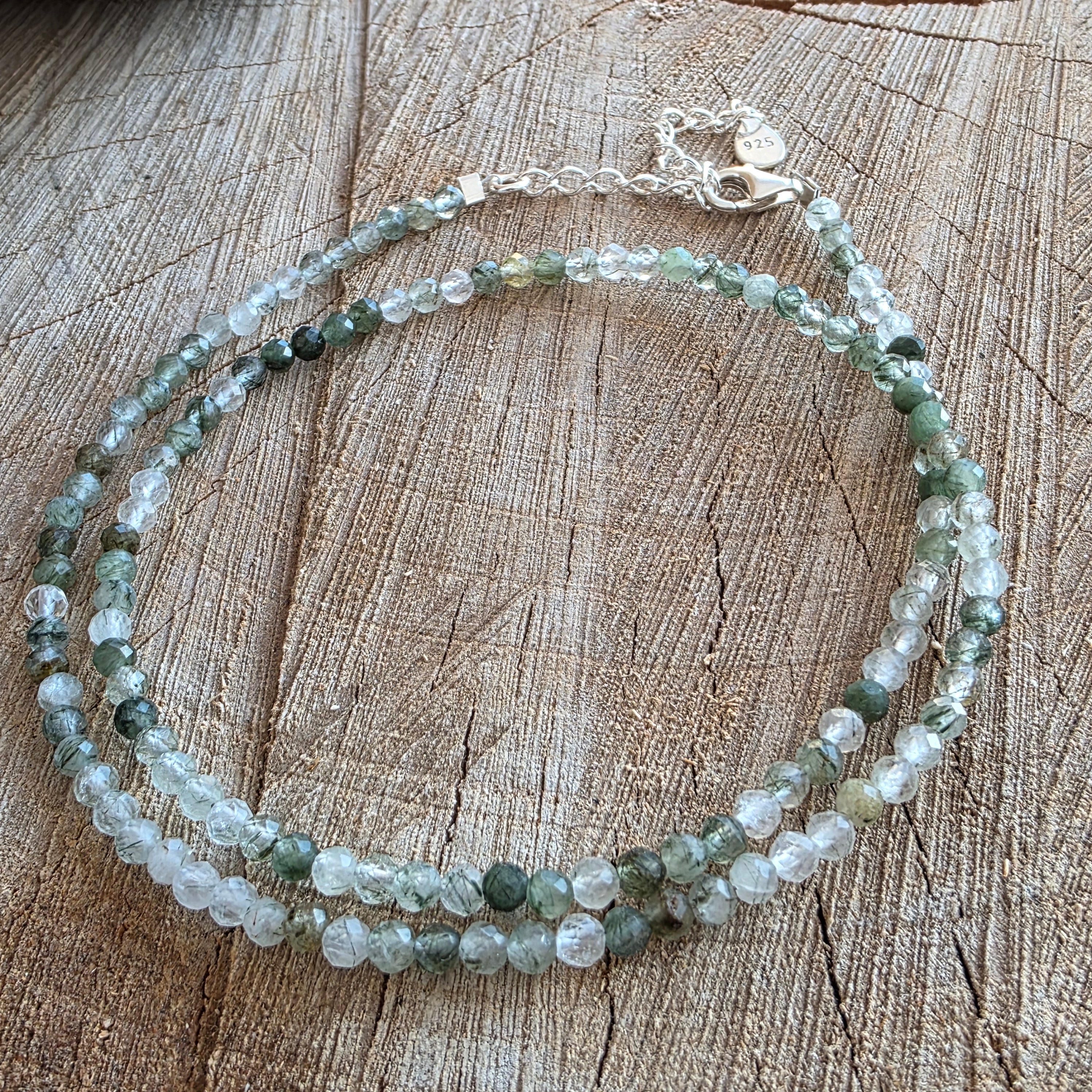 The thread is composed of spheres of faceted by 3 mm, each bead being a small world in itself: transparent crystals crossed by fine green inclusions, like muscle wires or roots suspended in clear water. The game between clarity and density creates a subtle, organic visual texture, in which green is not color, but pulsation.