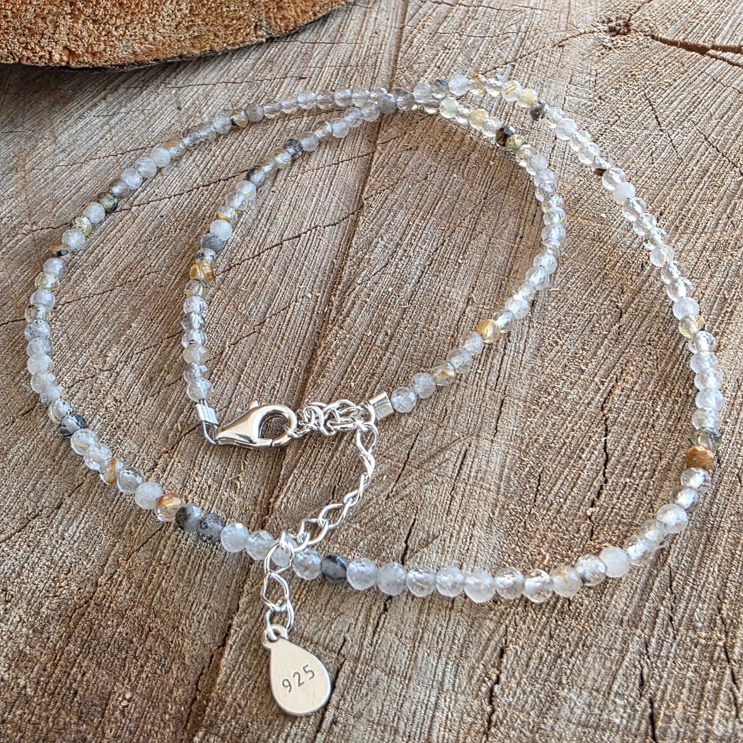 The thread is made up of faceted beads of 3 mm rutilated quartz, each of them keeping a whole world inside. This rare variety of quartz contains fine needles of rutile – gold or copper threads suspended in transparency, like solar filaments trapped in the crystal. Its discreet reflexes catch the light at subtle angles, creating an impression of vivid yet calm movement.
