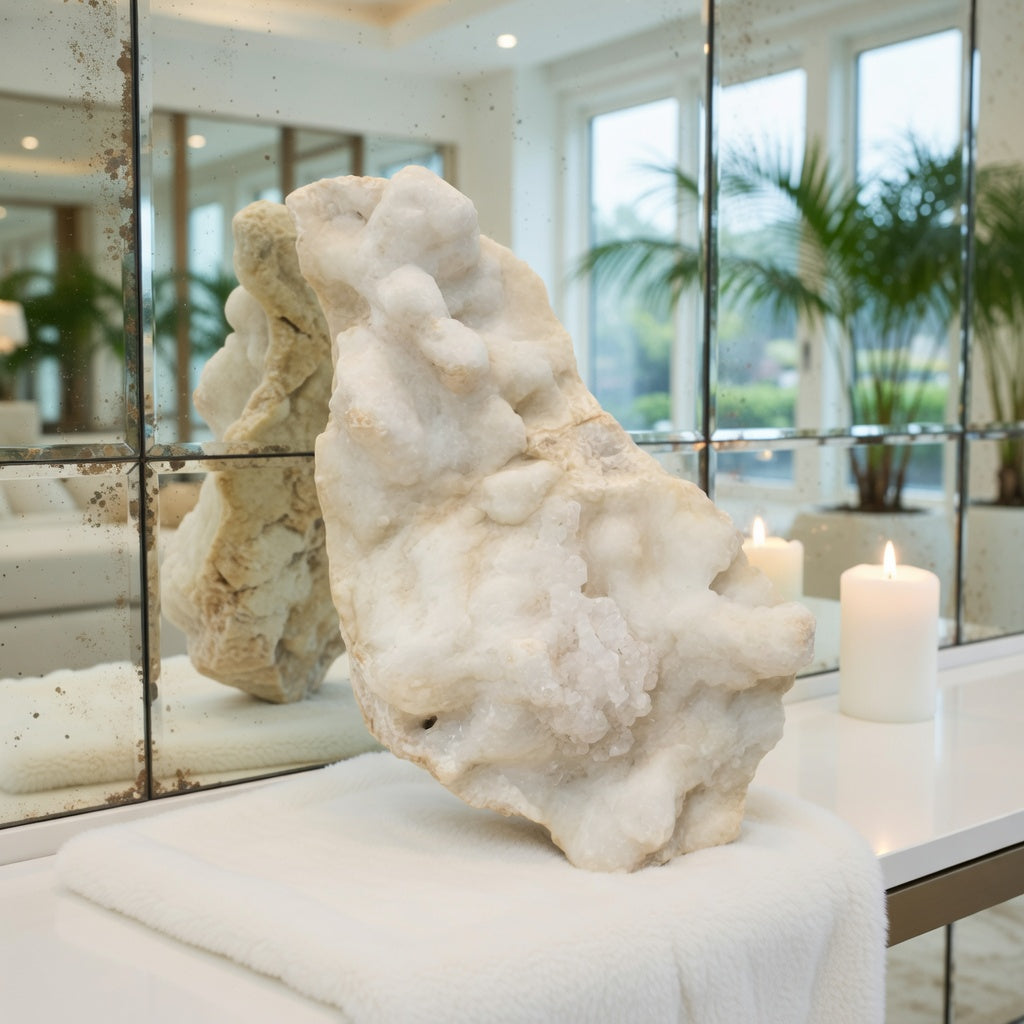 The creamy-white color, with subtle beige shades, is highlighted by the gentle shine of the microcrystals on the surface, which reflect light in a soft and elegant manner. The fine details, coral-like appearance, and harmonious shape make this piece a remarkable visual presence.