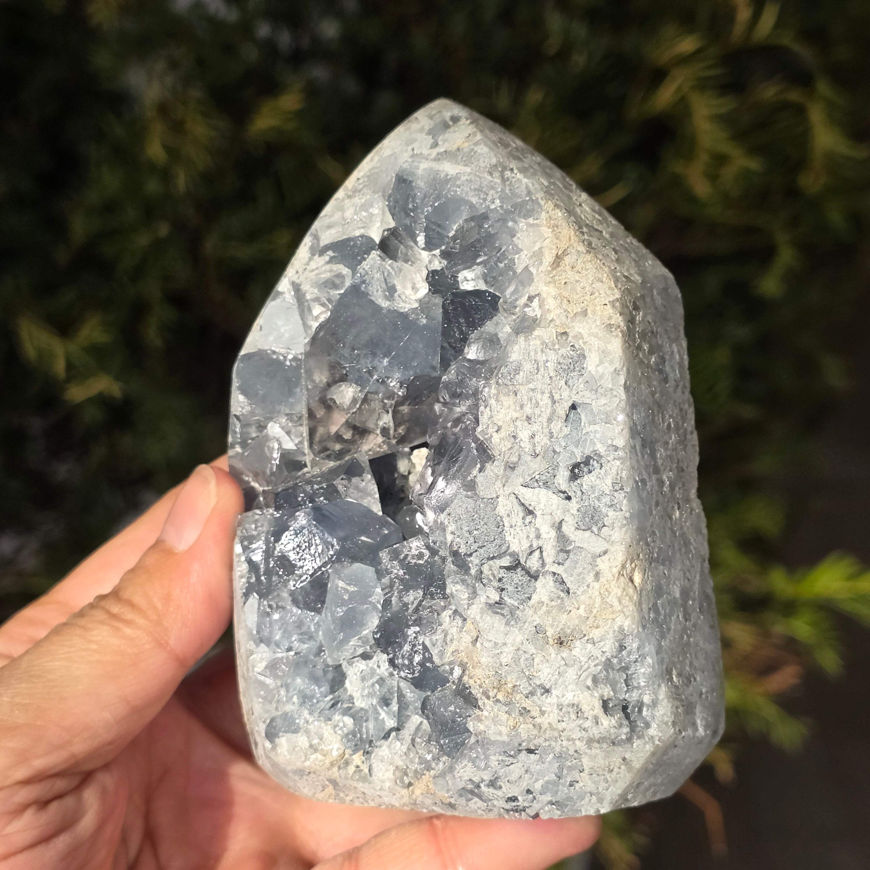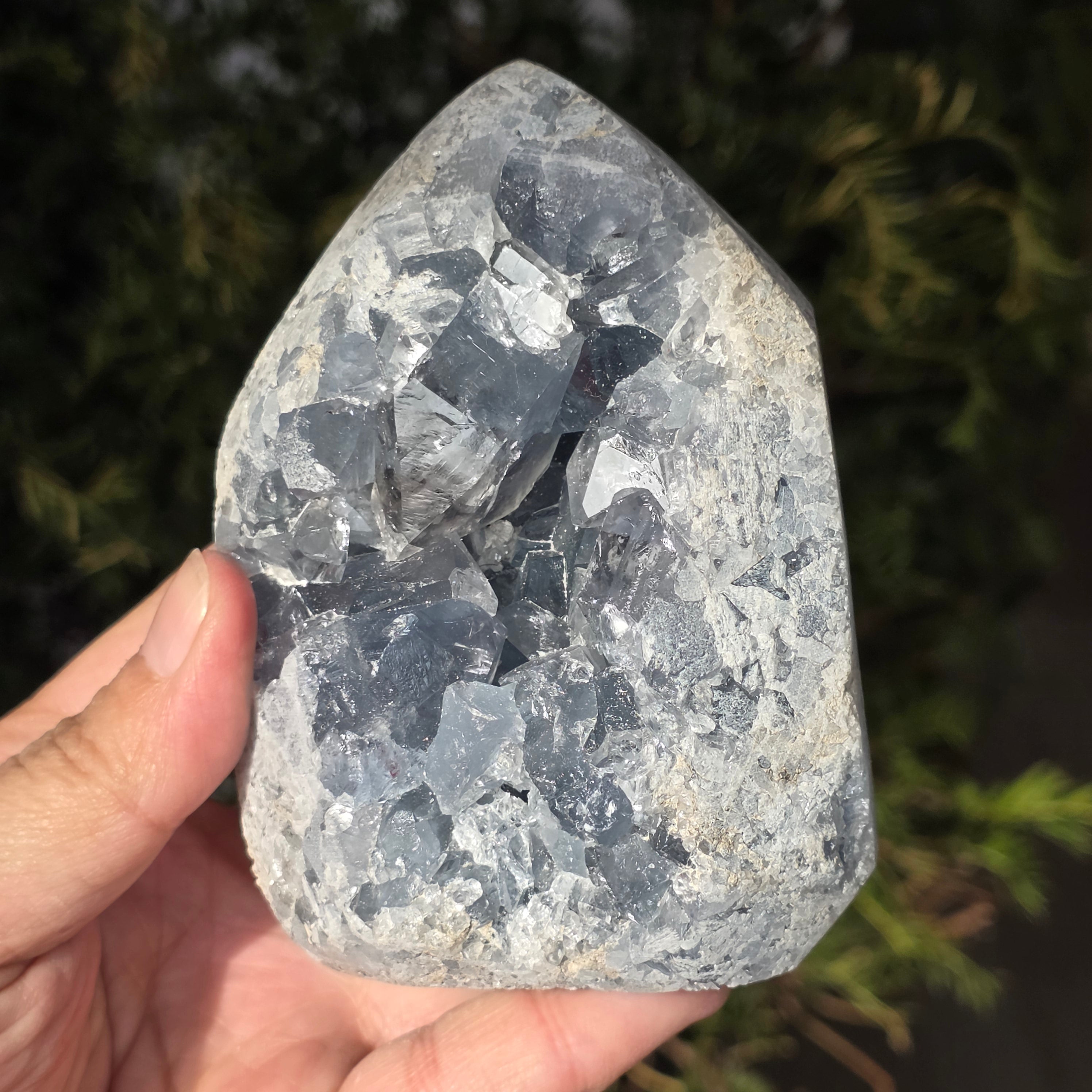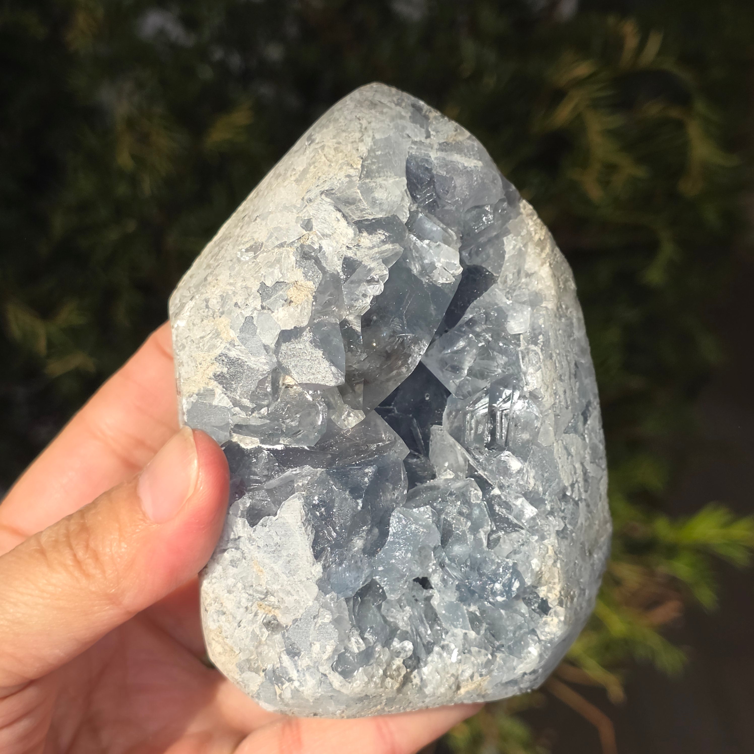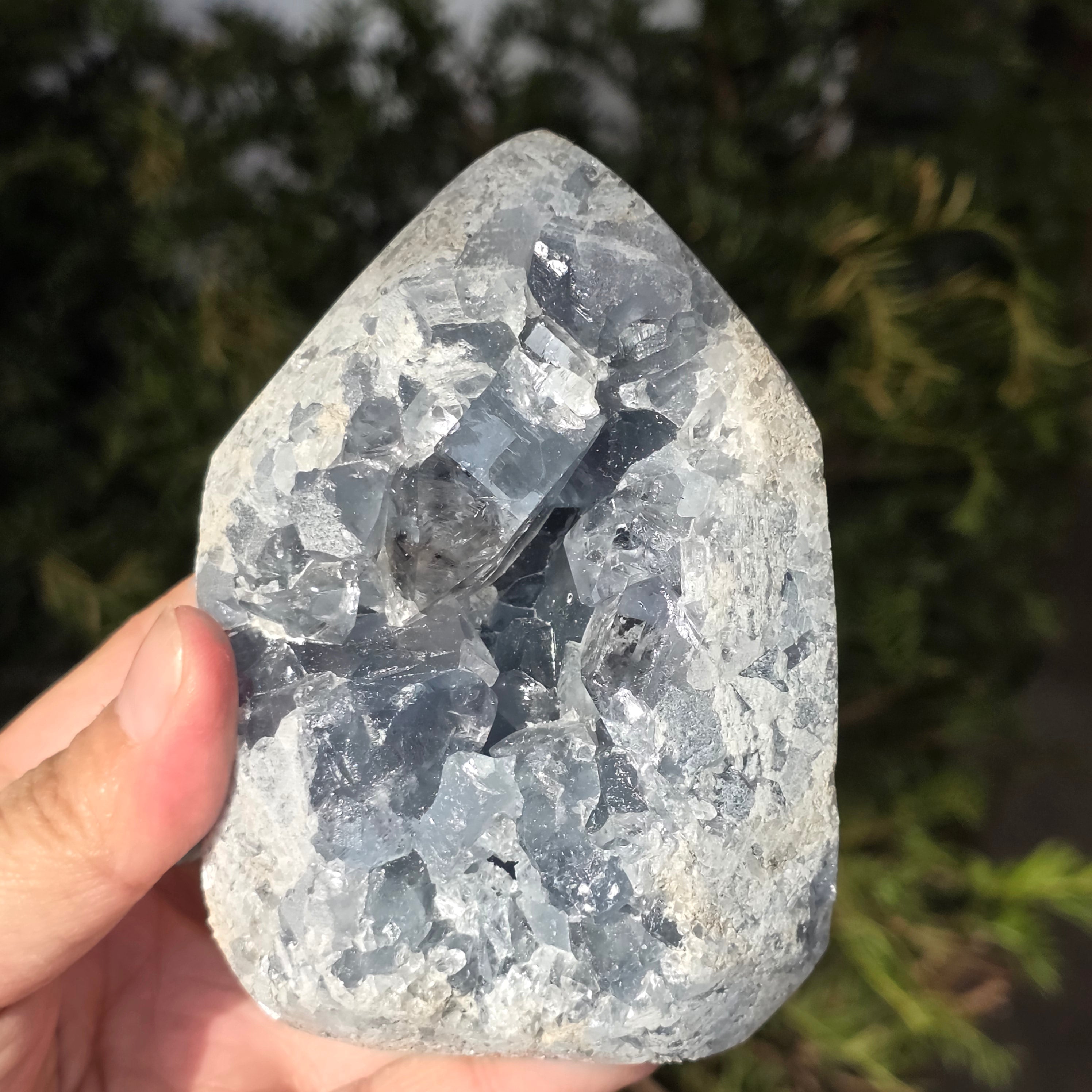 Celestite is a blue or colorless semi-precious stone formed from strontium sulfate. It has calming and relaxing properties and is often used in meditation and spiritual practices to promote inner peace and mental clarity. Celestite is associated with the throat chakra and can help with clear communication and expression of emotions. It is also believed to enhance creativity, intuition and psychic abilities.