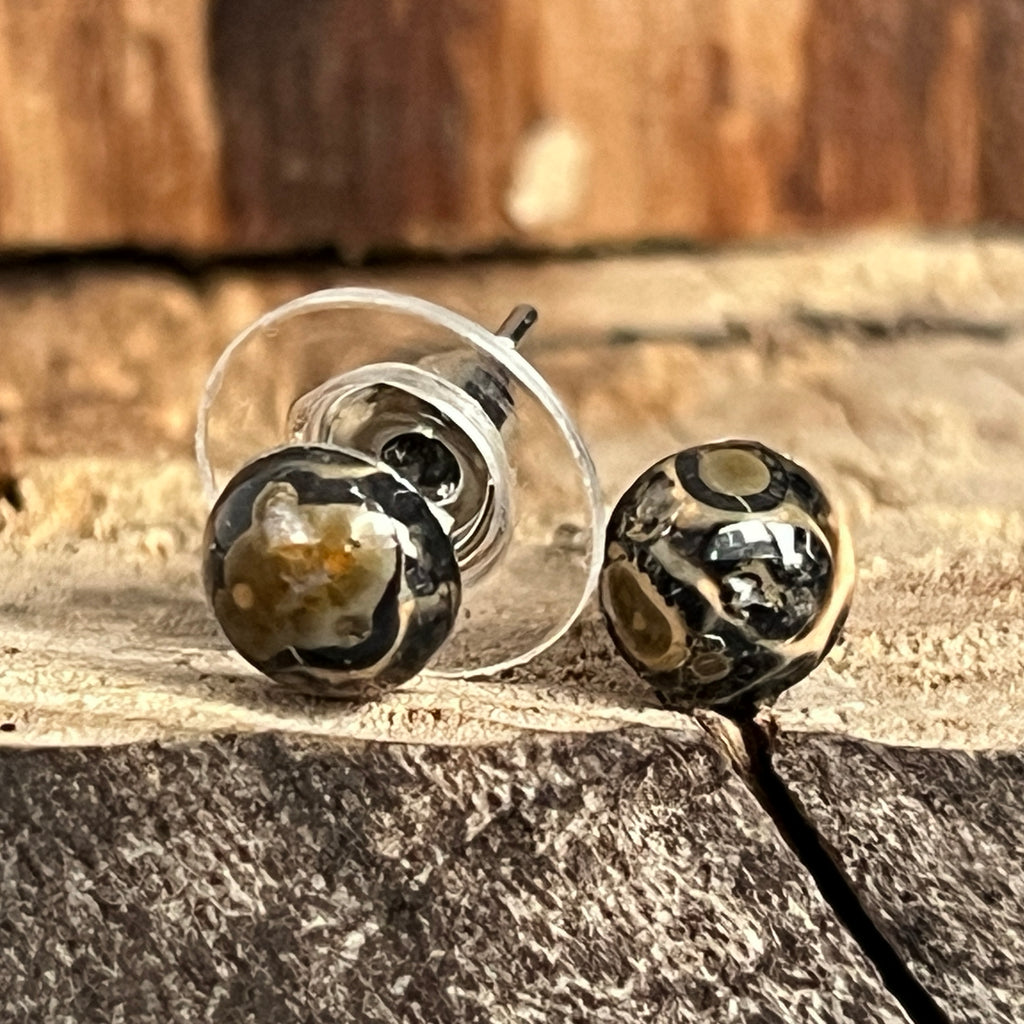 Acești cercei stud din jasp leopard natural sunt o celebrare a forței și a vitalității pământului. Fiecare piatră poartă un desen unic, asemenea amprentelor naturii — un amestec de nuanțe calde și pete întunecate care evocă grația și puterea leopardului.