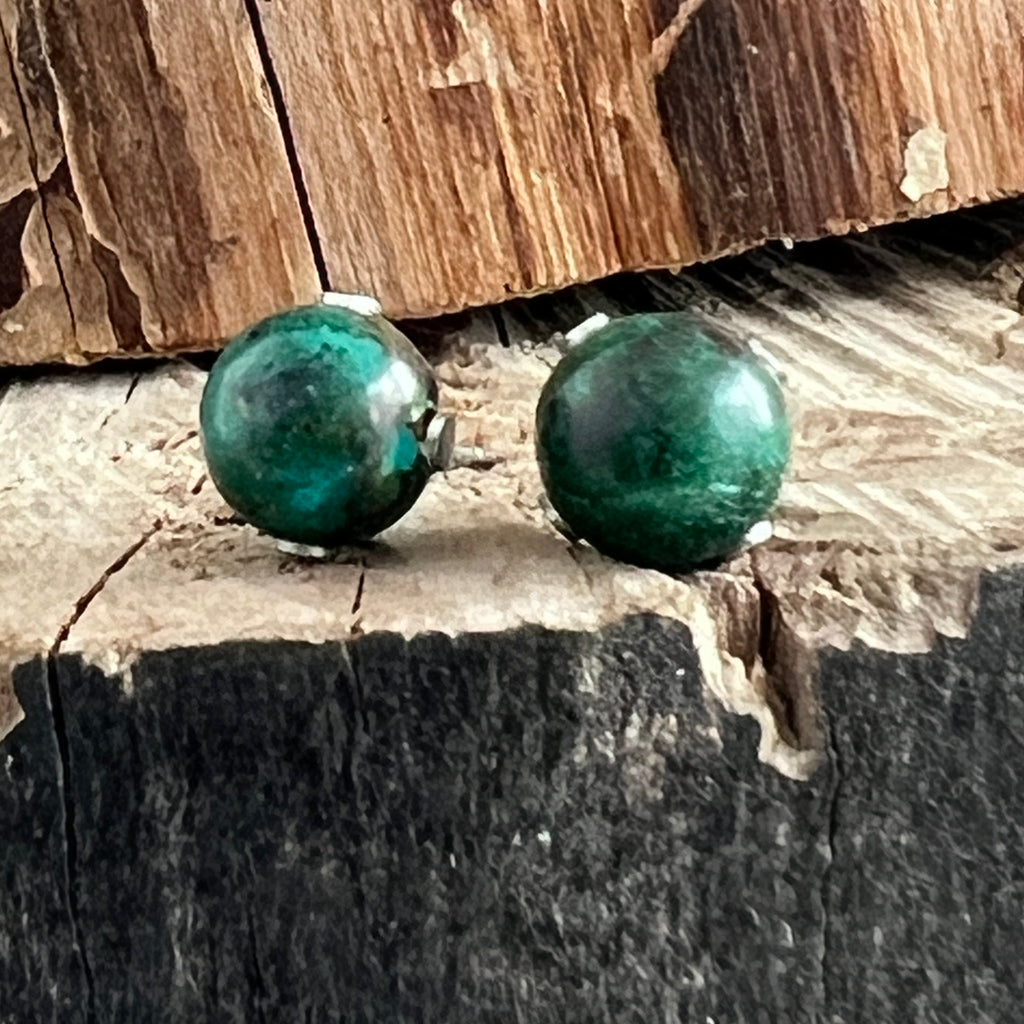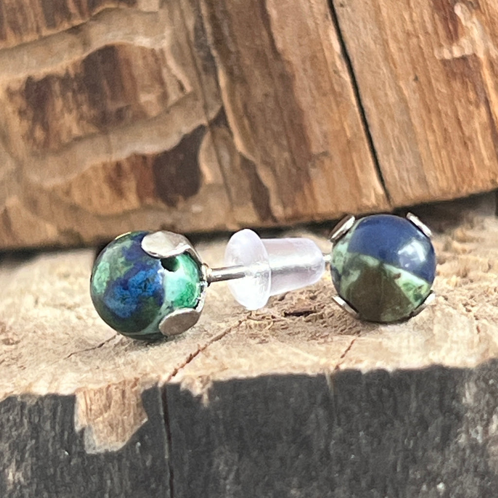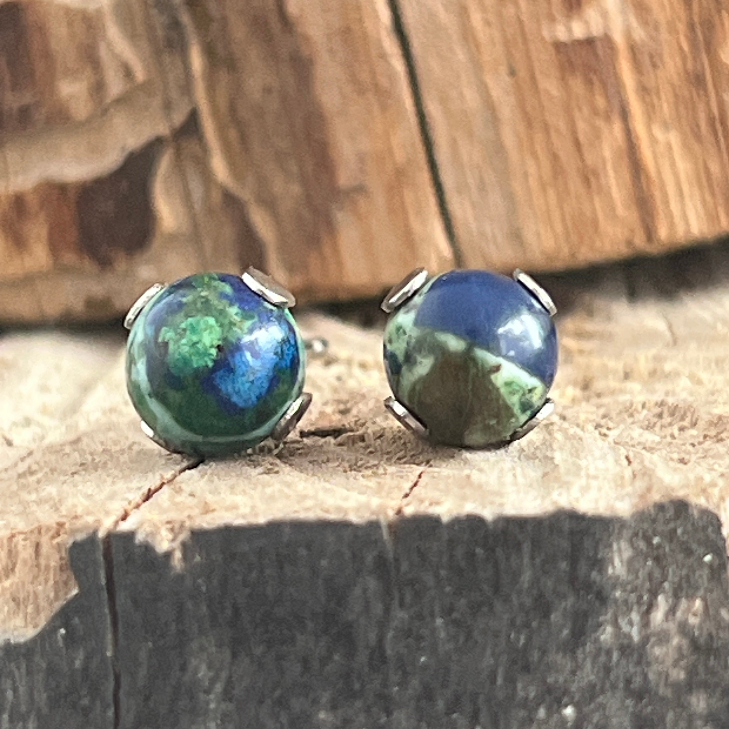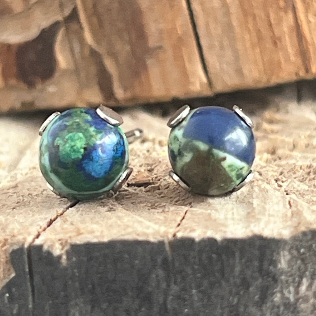 Acești cercei stud din crisocolă naturală par fragmente de ocean solidificate în timp. Nuanțele lor se împletesc în tonuri de albastru profund și verde turcoaz, ca un dans al apelor calme și al pădurilor tropicale.