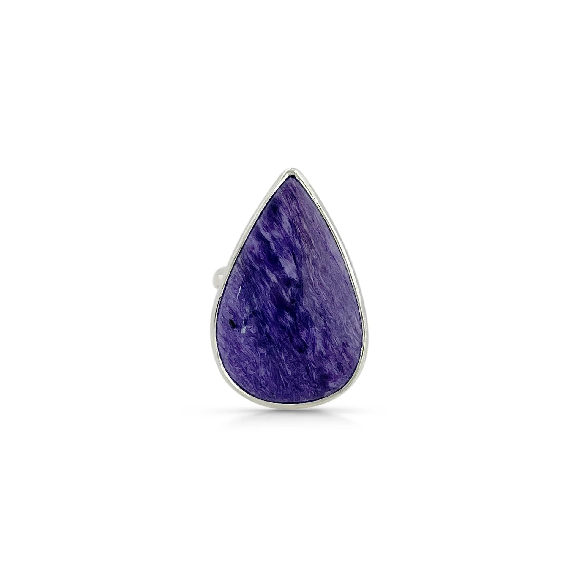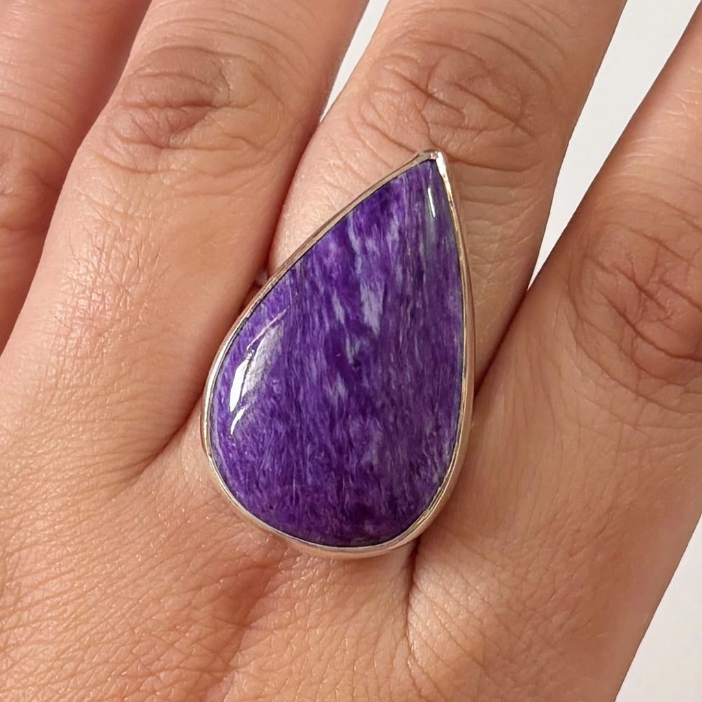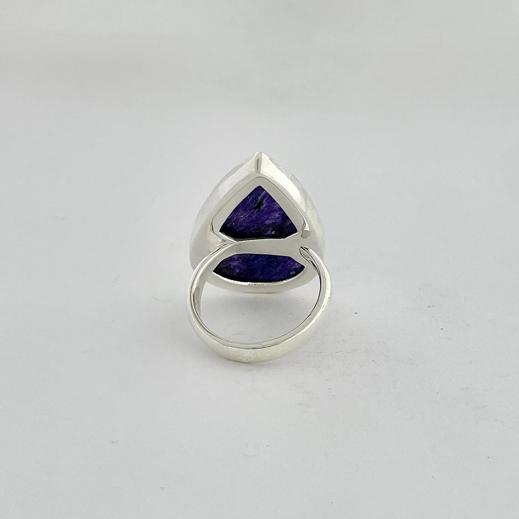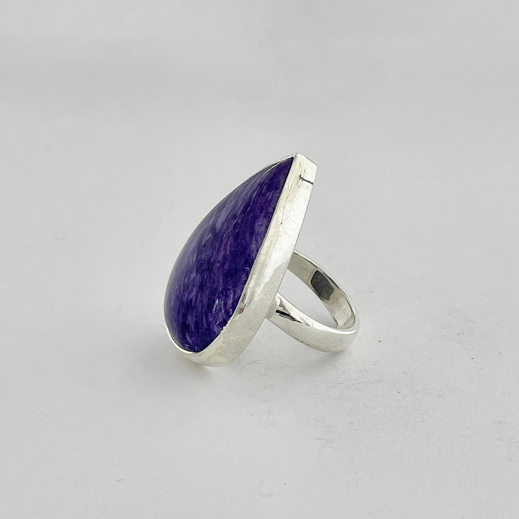 A ring collection, manually made from 925 silver and ennobled with a piece of natural charoit, cut into a free form that emphasizes the uniqueness of the stone. His intense purple shades, with white and gray irises, create a fascinating visual effect, similar to a moving painting.