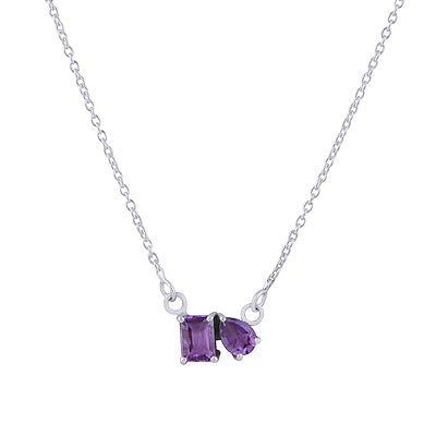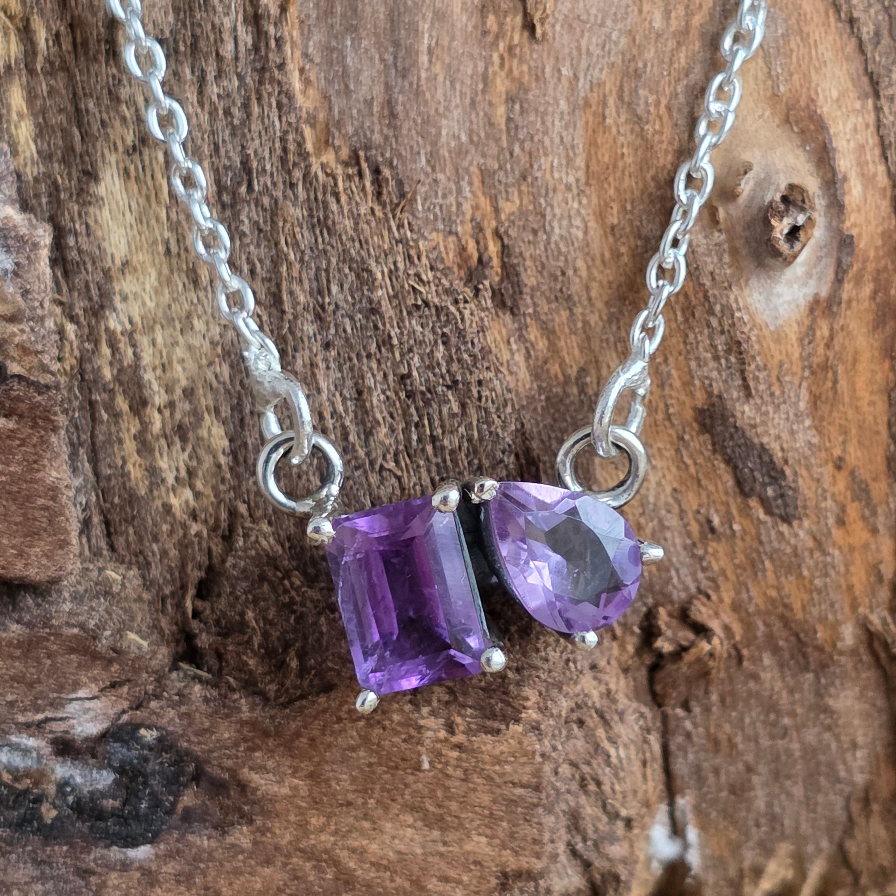Un colier elegant din argint 925, decorat cu două pietre de ametist natural, tăiate în forme diferite – una dreptunghiulară și una pară – care se completează perfect prin jocul subtil al luminii.
